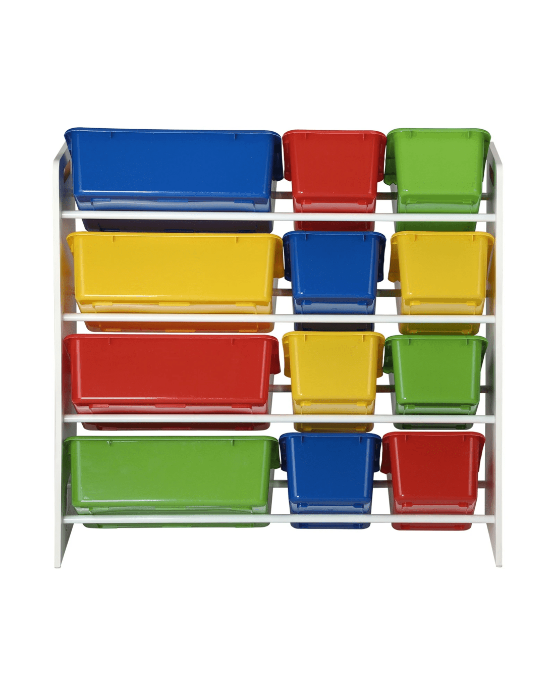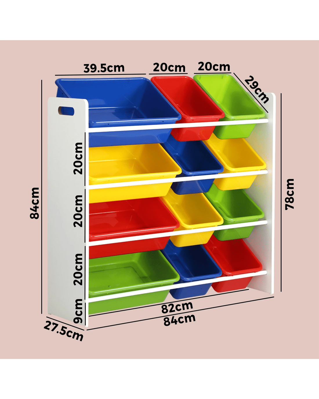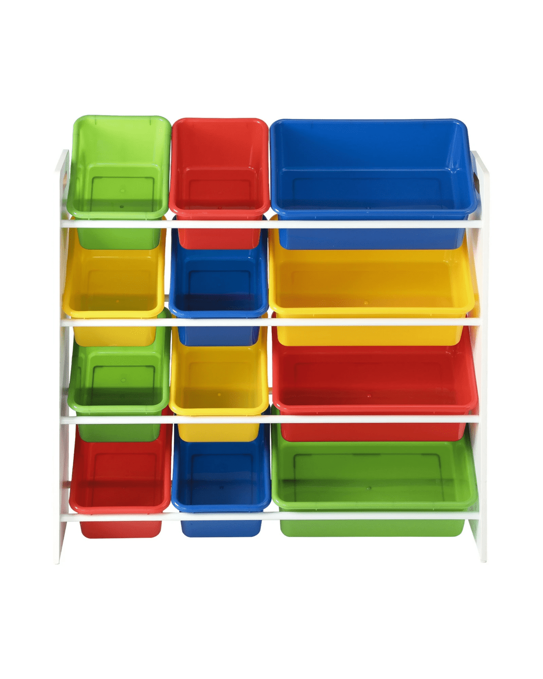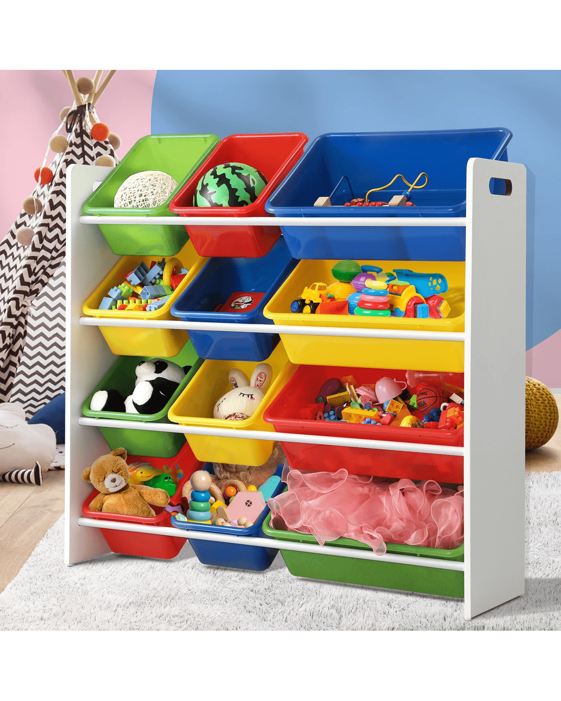 Simple and cheerful-looking, our kids storage rack is made kids-safe in every way with smooth edges, and a non-toxic and eco-friendly finish. Laid out in a 4-tier rack, the 12 plastic bins of two different sizes let you store a variety of items while the sturdy construction ensures that it will stand up to robust use time and again. Needless to say, cleaning the ensemble is totally fuss-free. The rack itself is also made of durable 12mm thick particle board that will stand up to the vigours of constant handling and provide a stable structure. Better still, for total peace of mind use, the storage rack also includes a standard anti-tipping kit to prevent any accidental mishaps.