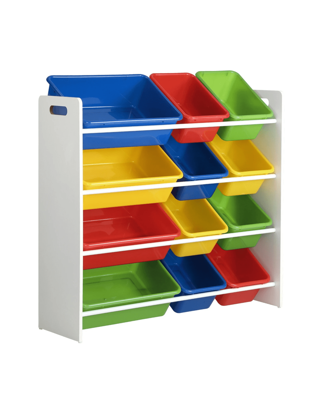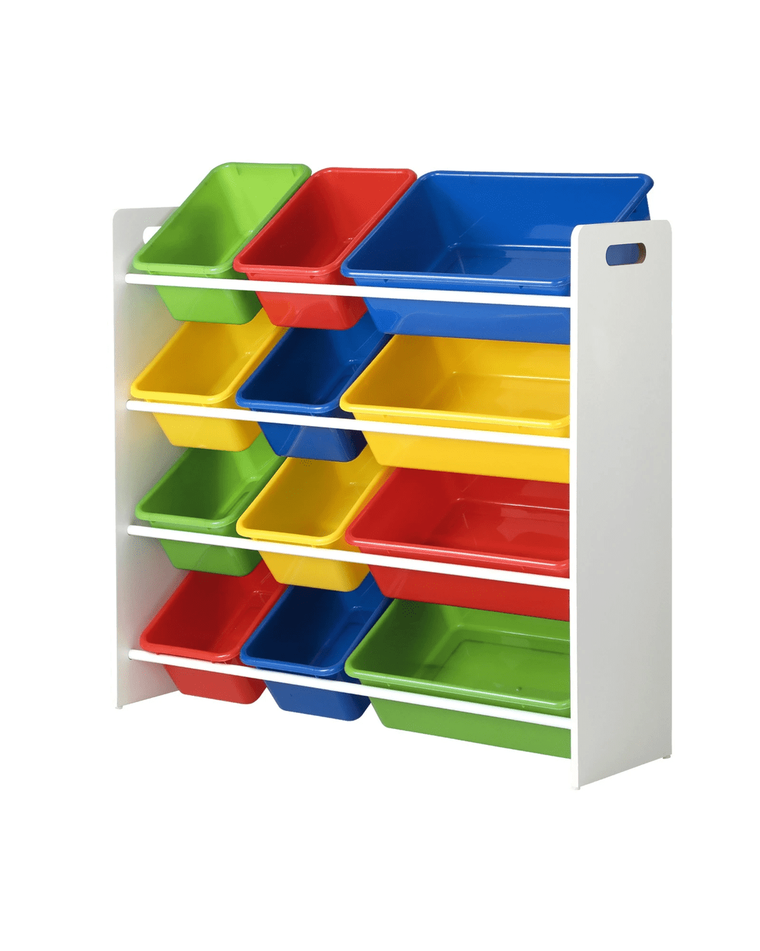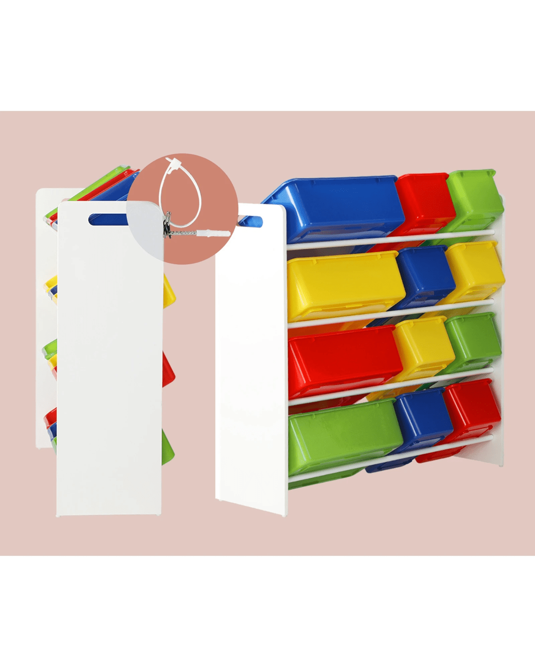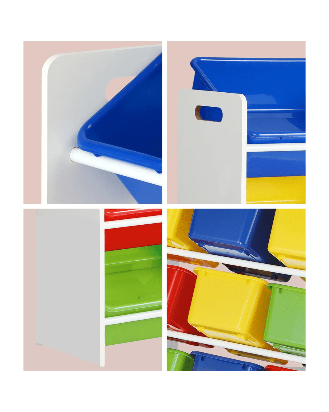 Simple and cheerful-looking, our kids storage rack is made kids-safe in every way with smooth edges, and a non-toxic and eco-friendly finish. Laid out in a 4-tier rack, the 12 plastic bins of two different sizes let you store a variety of items while the sturdy construction ensures that it will stand up to robust use time and again. Needless to say, cleaning the ensemble is totally fuss-free. The rack itself is also made of durable 12mm thick particle board that will stand up to the vigours of constant handling and provide a stable structure. Better still, for total peace of mind use, the storage rack also includes a standard anti-tipping kit to prevent any accidental mishaps.
