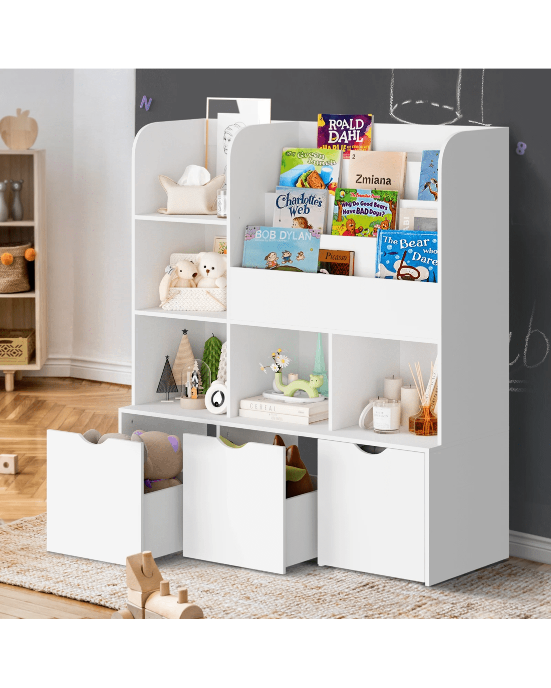 Not least, the entire ensemble is built to kid-friendly specifications with a sturdy MDF board construction of smooth edges, handle-free storage bins and meticulous finishing. Plus, the use of eco-friendly materials also ensures this storage organiser is safe for worry-free use.