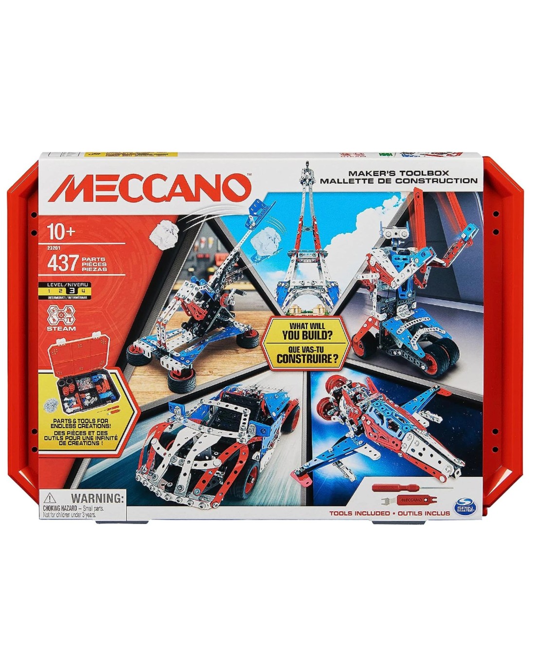 Unleash your child's inner engineer with the Meccano Maker's Toolbox, a 437-piece intermediate STEAM model building kit designed for open-ended play and endless creativity! This engaging and educational toy is perfect for boys and girls aged 10+, inspiring them to tinker, learn, and build amazing real-world creations. The Meccano Maker's Toolbox features over 400 interchangeable building pieces that spark your child's imagination, promoting skill development and problem-solving abilities.With the included instruction sheet, kids can create 3 fun, moveable builds: a race car, the Eiffel Tower, and a robot. Find additional instructions for a spaceship and catapult online! The open-ended design of the building kits means the possibilities are limitless, encouraging kids to explore their own unique creations. Staying organized is a breeze thanks to the compact toolbox, which makes it easy to organize and transport your child's inventions wherever they go.The Meccano Maker's Toolbox is the perfect gift for budding engineers, robotics enthusiasts, and kids who love to build and innovate, remote control cars, model kits, tactile toys, and creativity! Inspire the next generation of creative minds with this versatile model building kit! Ages: 10 +