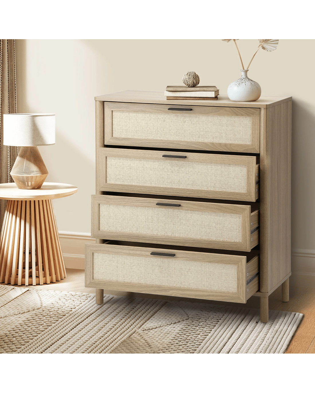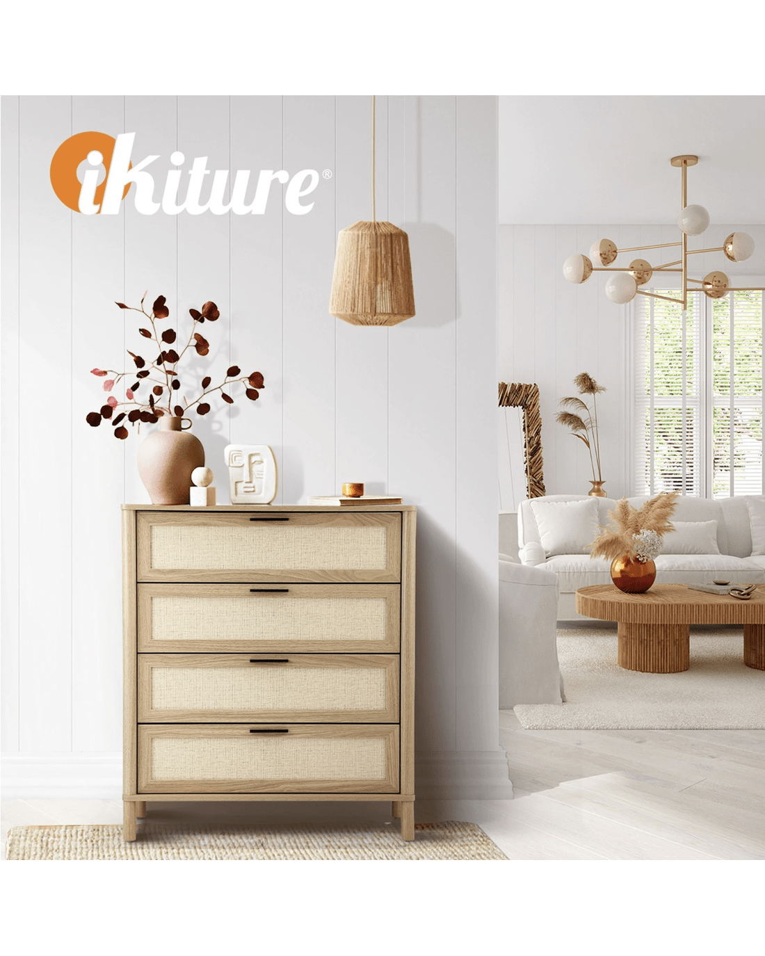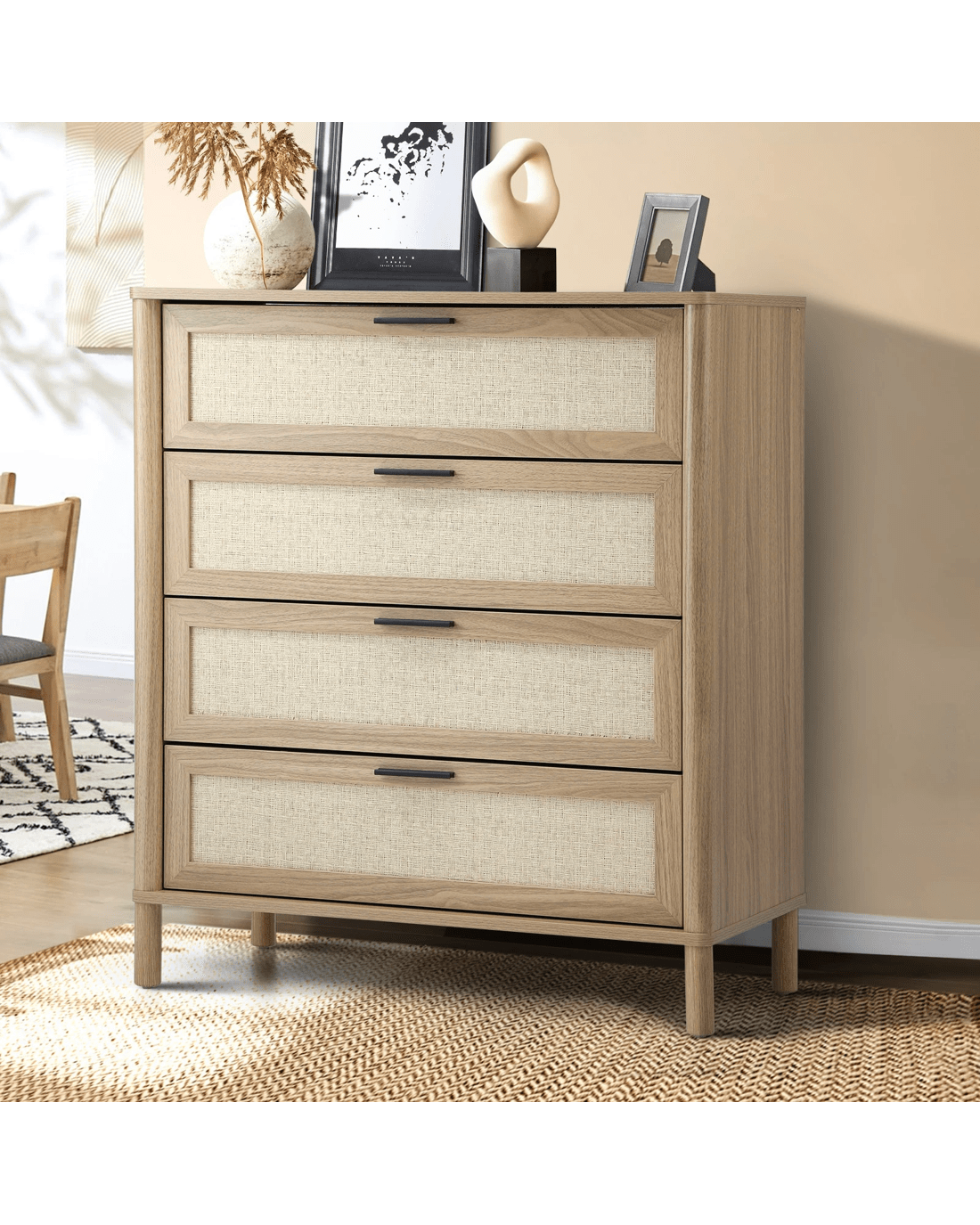 This eye-catching piece from Oikiture is ready to grace your esteemed home with exquisite finesse. Displaying a very practical and equally stylish design, our chest of drawers features rattanesque front drawer panels matched with natural wood hues to create interesting aesthetics with depth and character. Thoughtful touches that render a unique presence.
