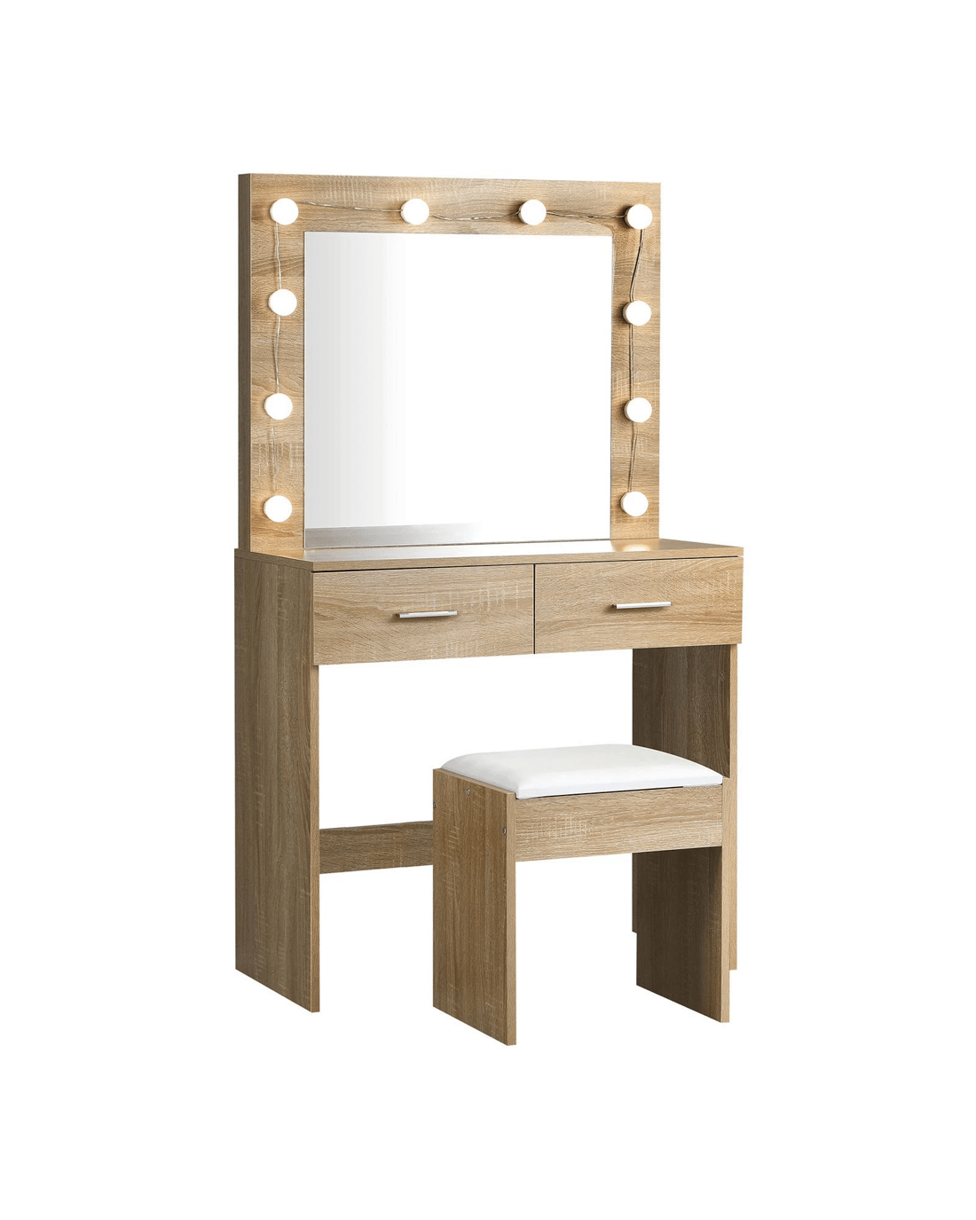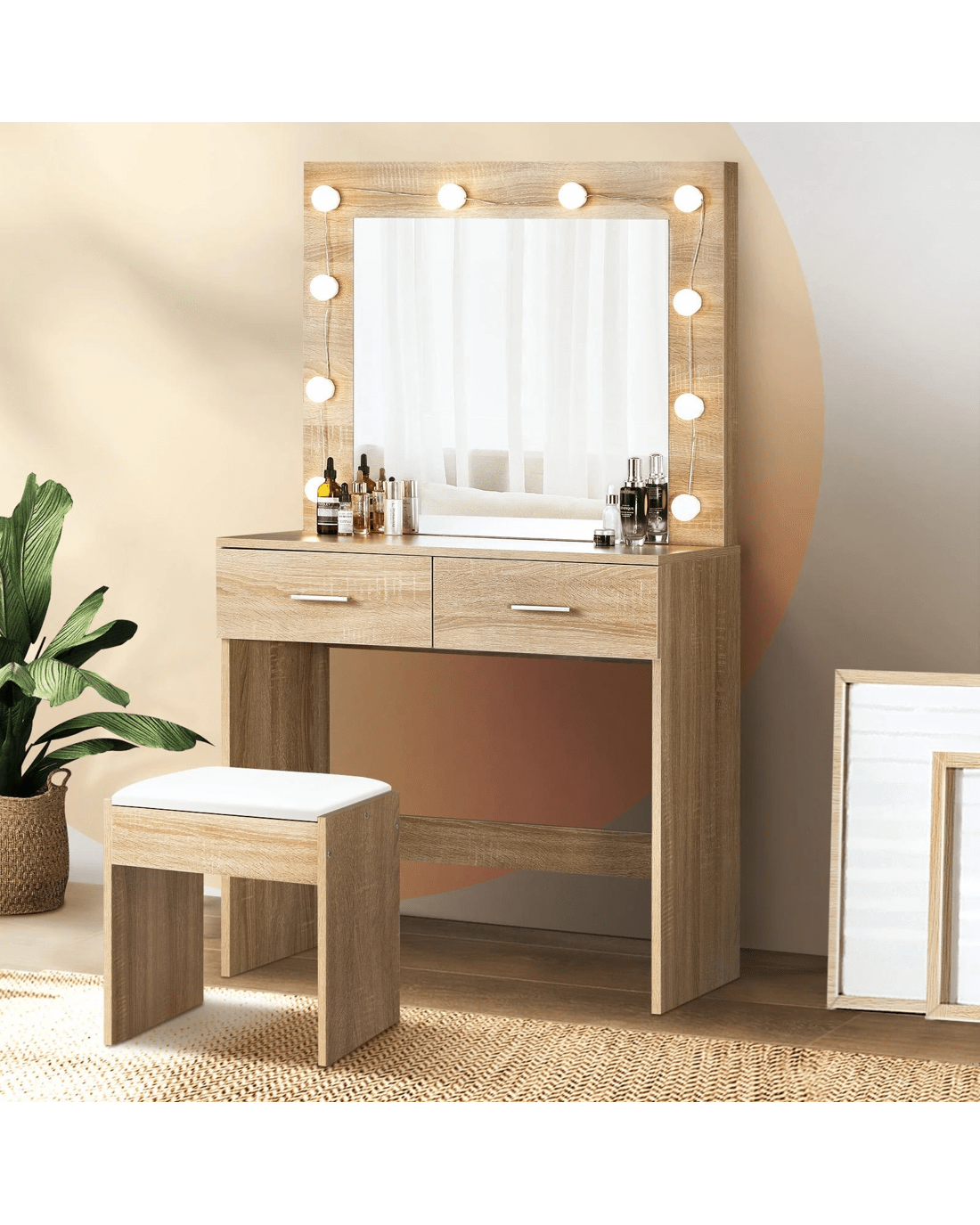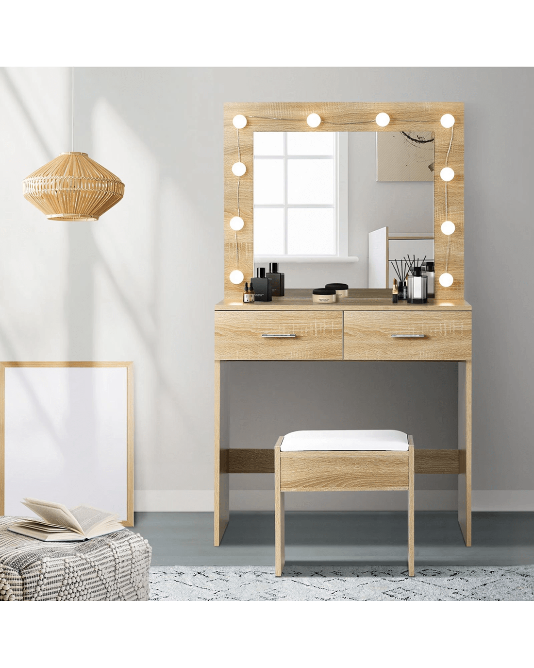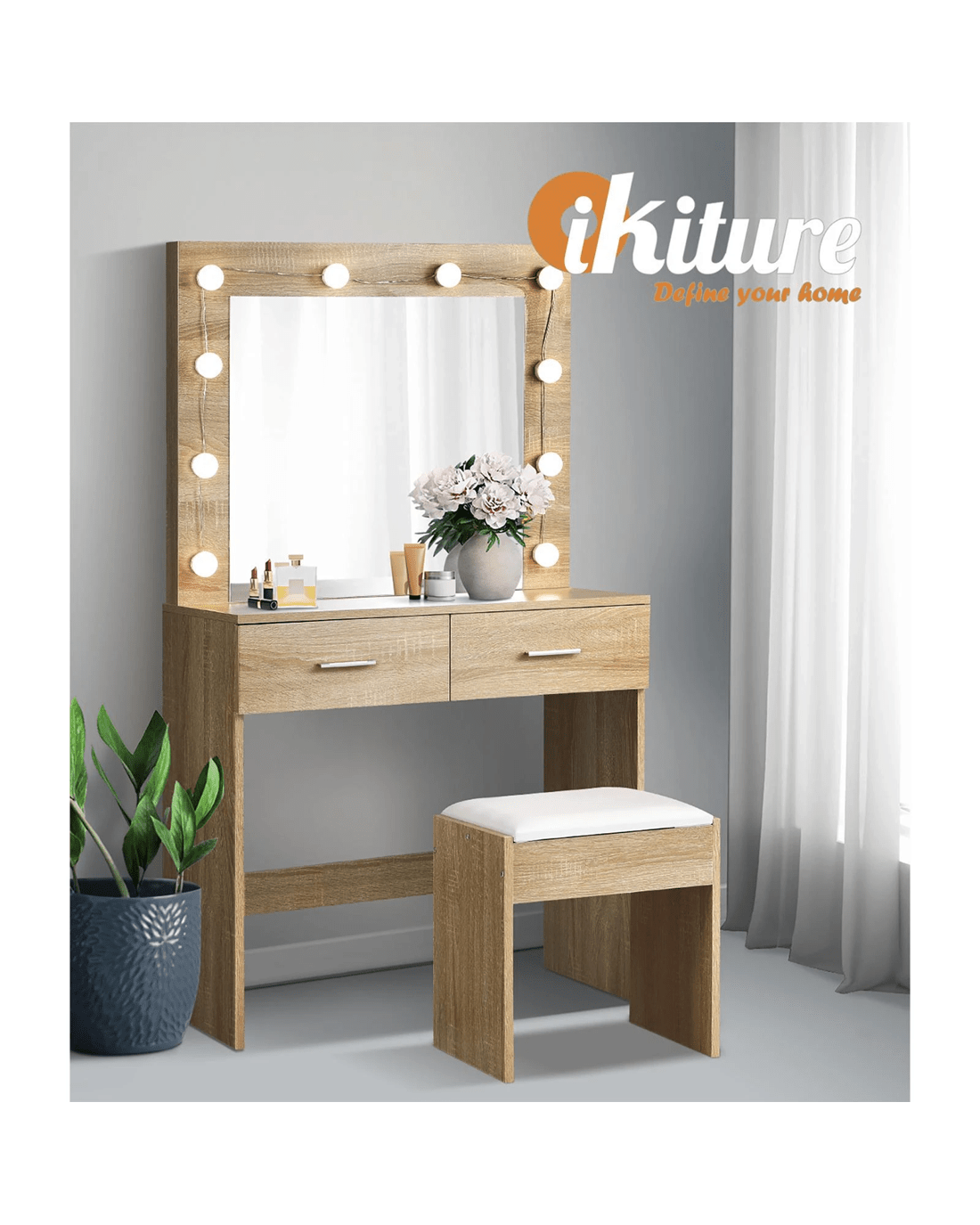 Sold by Kamprad's Oikos 1943Oikiture Dressing Table Stool Set Makeup Mirror Storage Desk 10 Led Bulbs Wooden - Natural