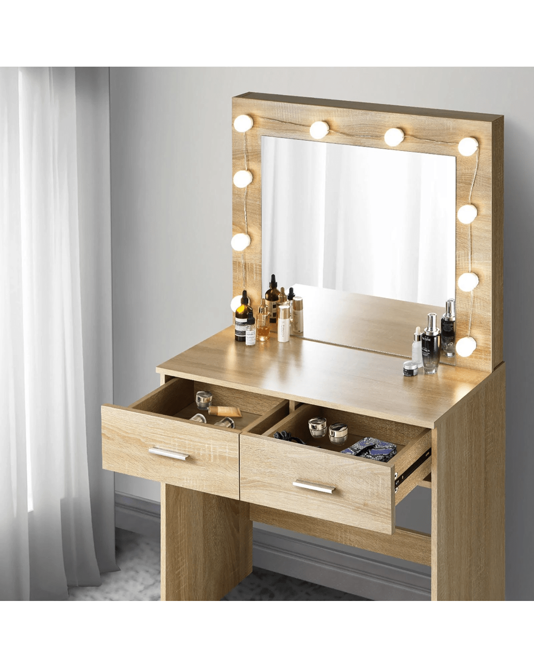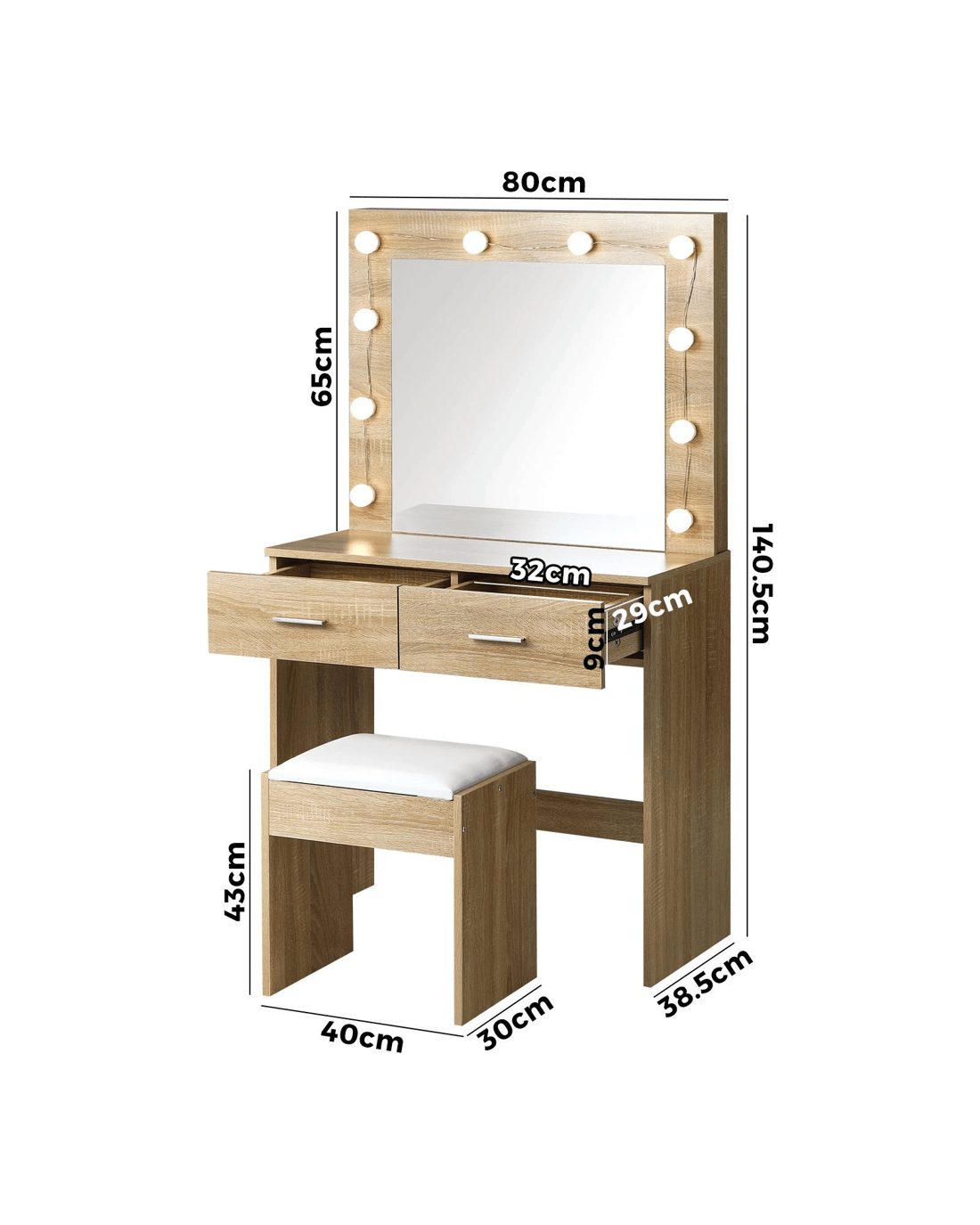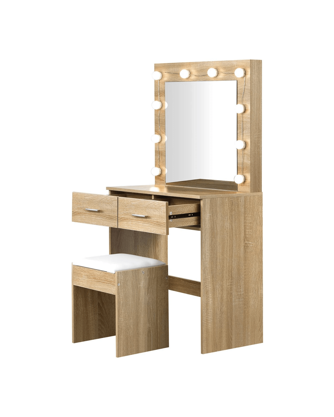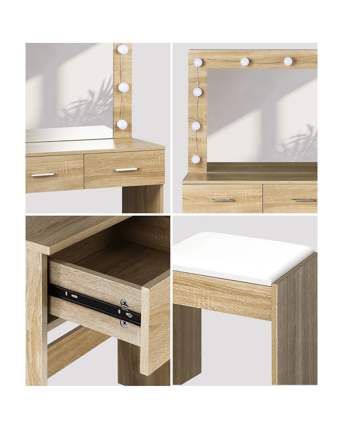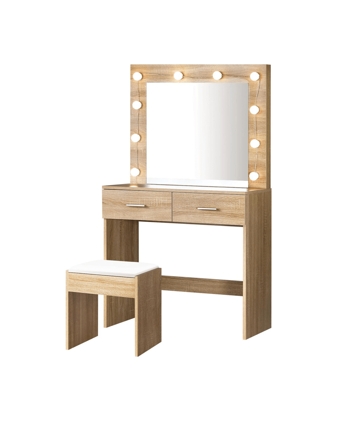 Sold by Kamprad's Oikos 1943Oikiture Dressing Table Stool Set Makeup Mirror Storage Desk 10 Led Bulbs Wooden - Natural