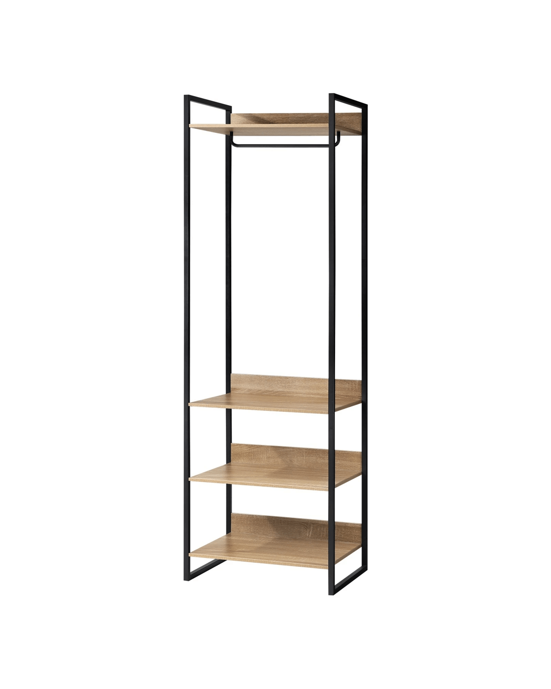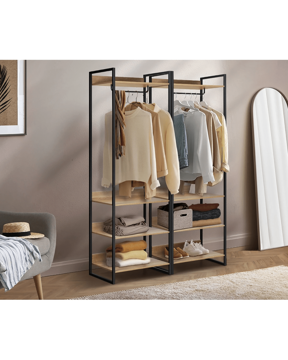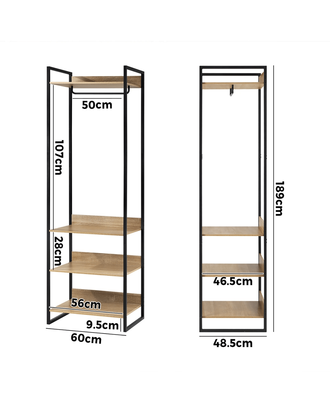 Built with durability in mind, our open wardrobe boasts a robust construction that ensures stability and longevity. The industrial-inspired design, complete with metal accents, adds character to your room while maintaining a practical and organized living space.