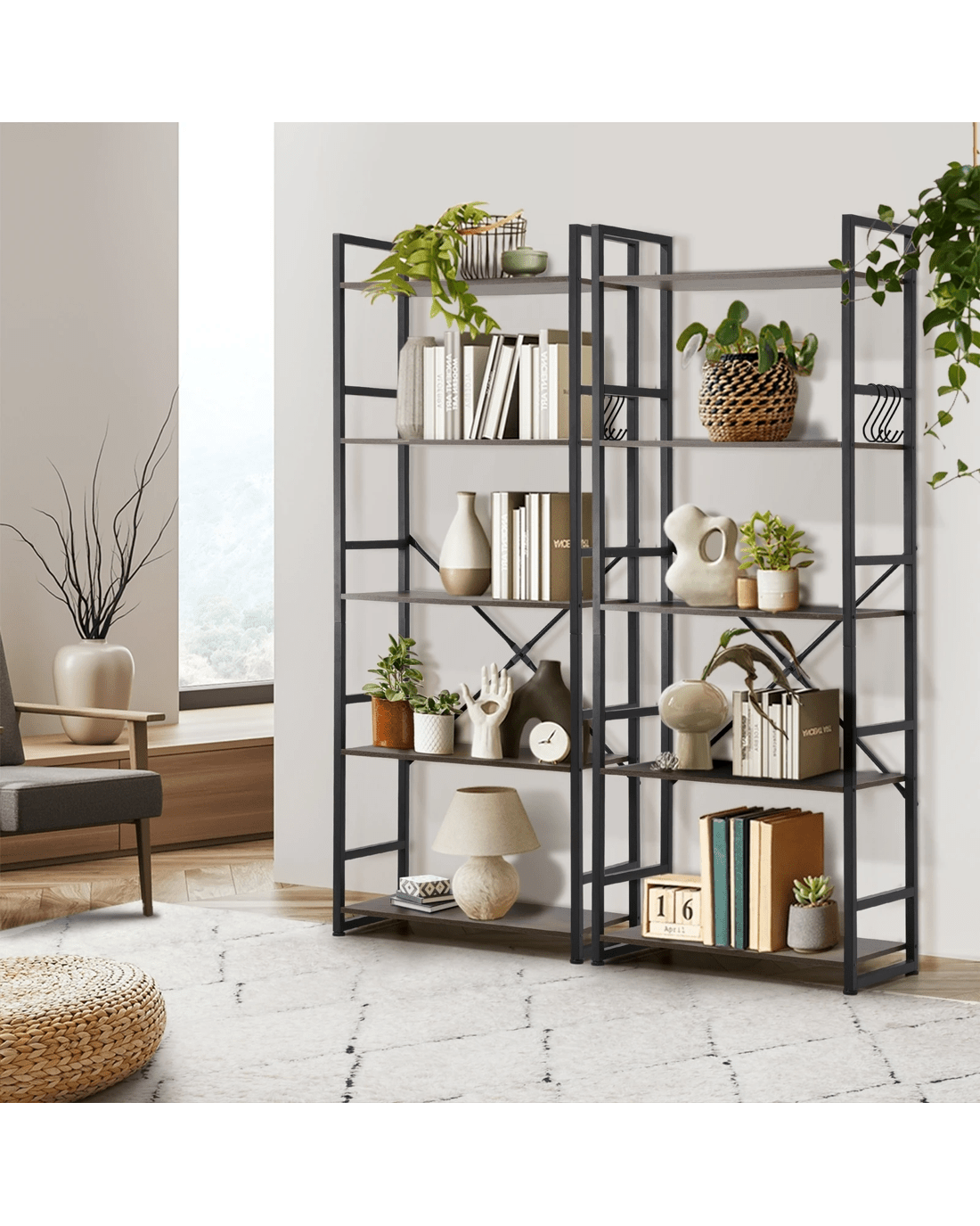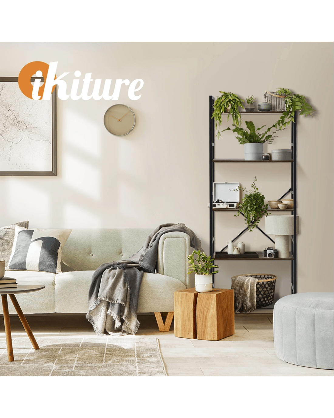 With a rustic walnut hue for the shelves and a black powder-coated iron frame, the display shelf conveys an eclectic and industrial blend that depicts vintage and yet modern nuances. An appropriate match for the well-seasoned home d篓娄cor stylist who loves incorporating cultural and bohemian influences in the home.
