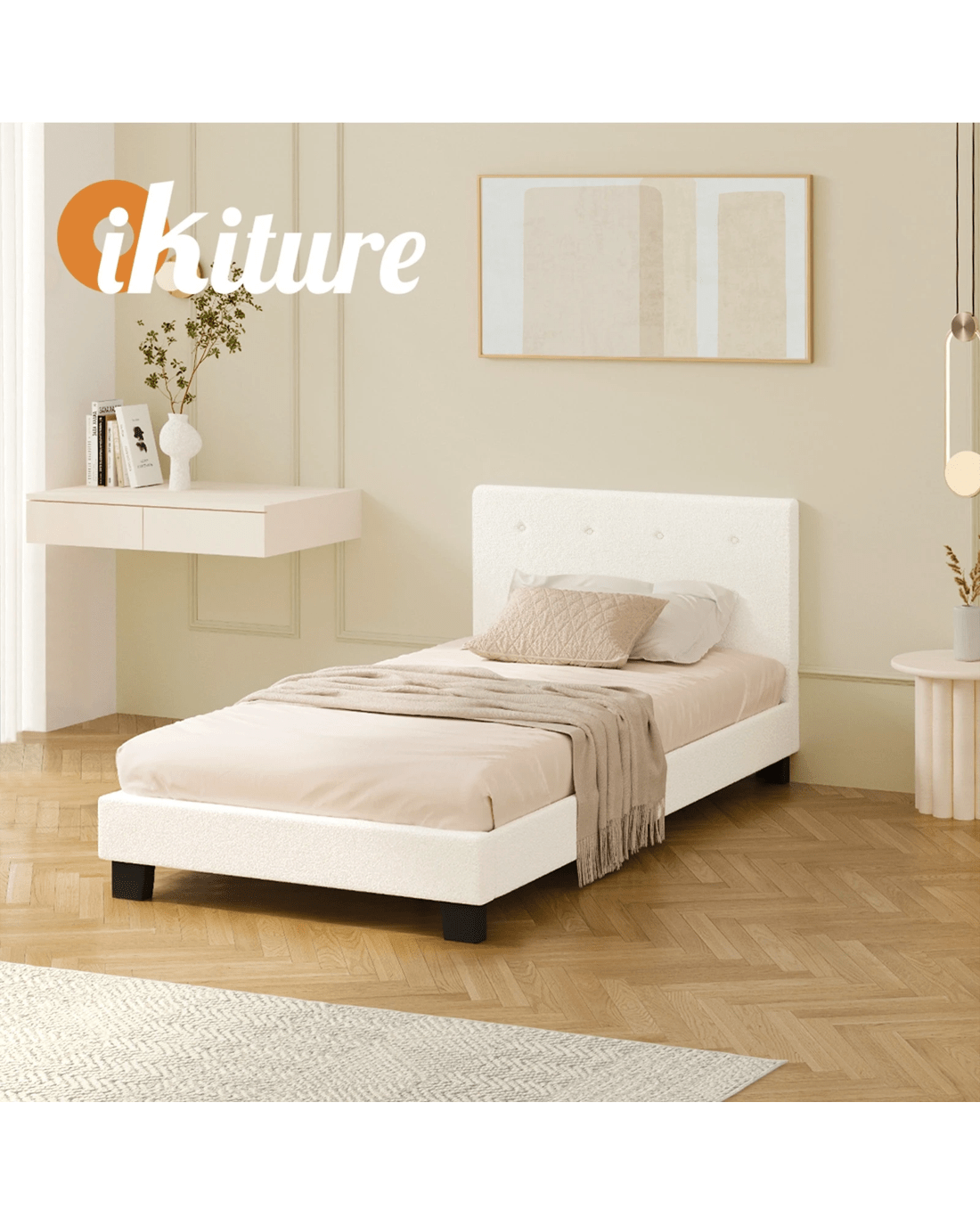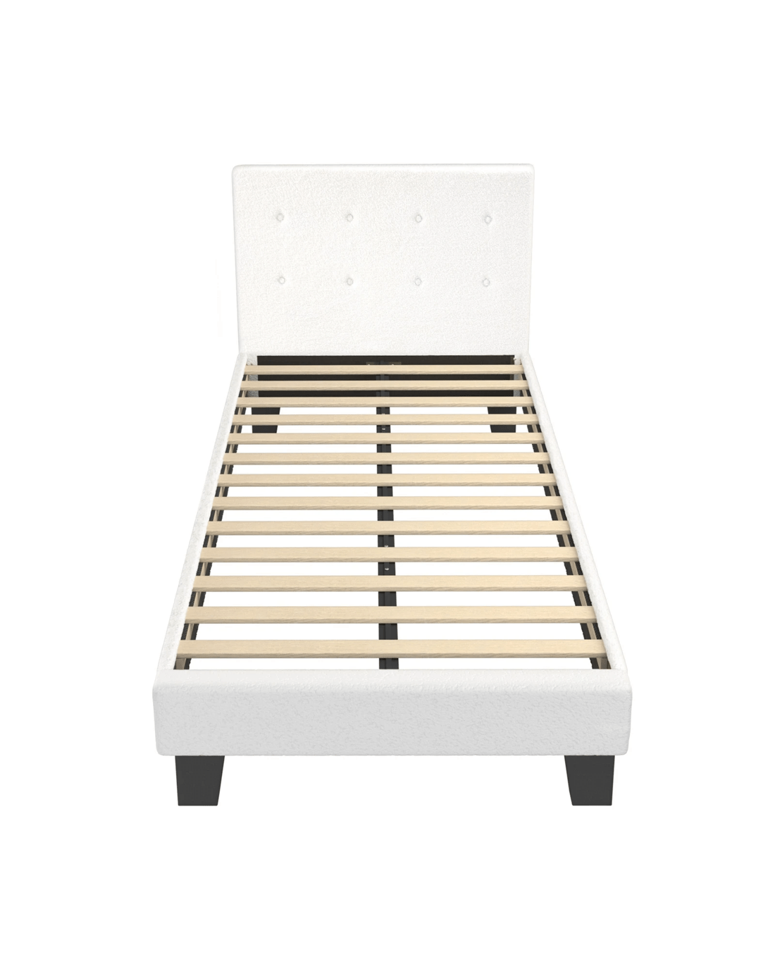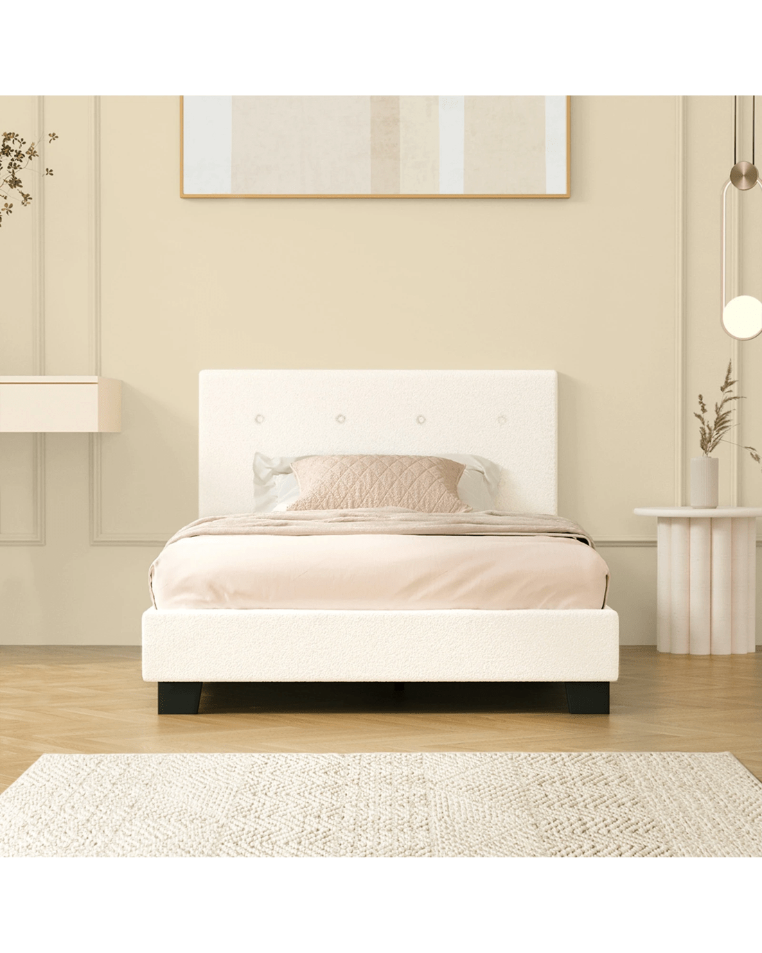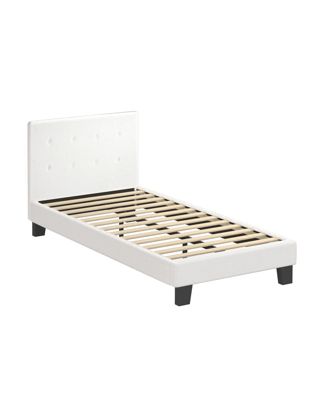 Featuring an expansive and quilted bedhead design, the Oikiture Polo Bed Frame oozes a blend of classic elegance and contemporary flair to add to any bedroom decor. And its form also merits its function. Lean back to read, watch TV or interact with your favourite media devices, the supportive bedhead ensures many hours of pleasure without encountering any stress or strain. All around, the chic white Boucle fabric upholstery that covers the bed frame from head to end is soft to the touch and creates a swank and intimate aura to accompany your calm and restful sleep. And true to its character, the bed frame finishing is meticulous with exacting workmanship all round. Inside, the thick 13mm plywood reinforced slats provide end-to-end support for the mattress while the sturdy legs ensure that the bed frame stands up to durable use time and again. Better still, setting up the bed frame is hassle-free with Velcro-enabled slats that simply fasten to the bed frame for better grip and stability. In fact, the entire bed frame assembly can be completed in less than 30 minutes. The Oikiture Polo Bed Frame is compatible for use with most Australian-sized mattresses and is available in King Single, Double, Queen and King sizes.