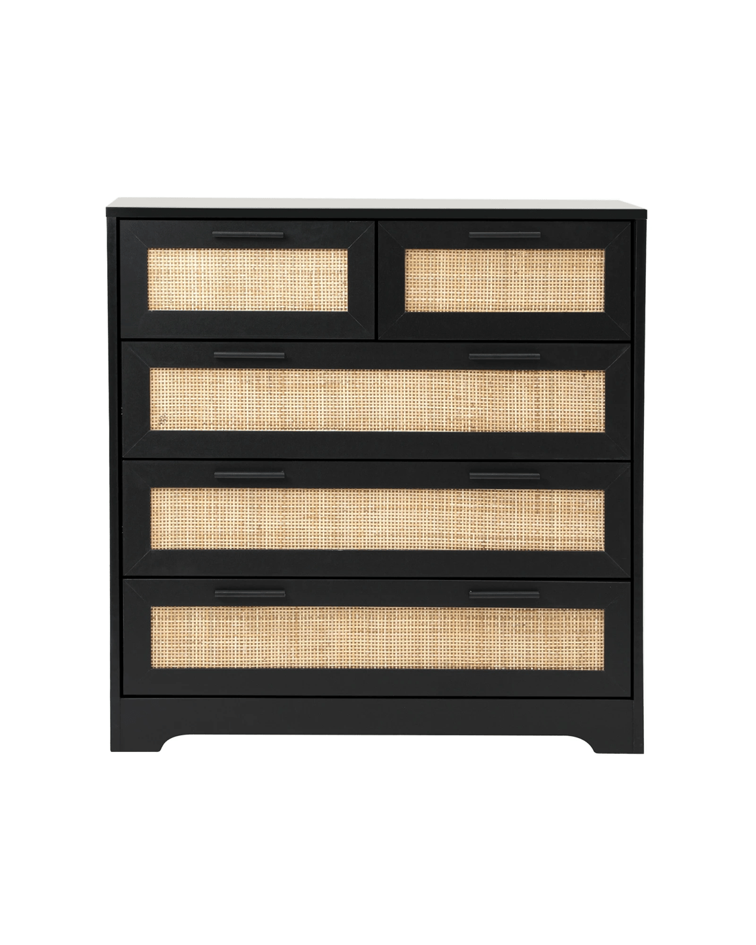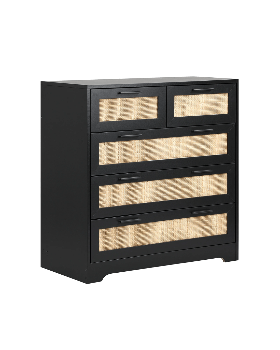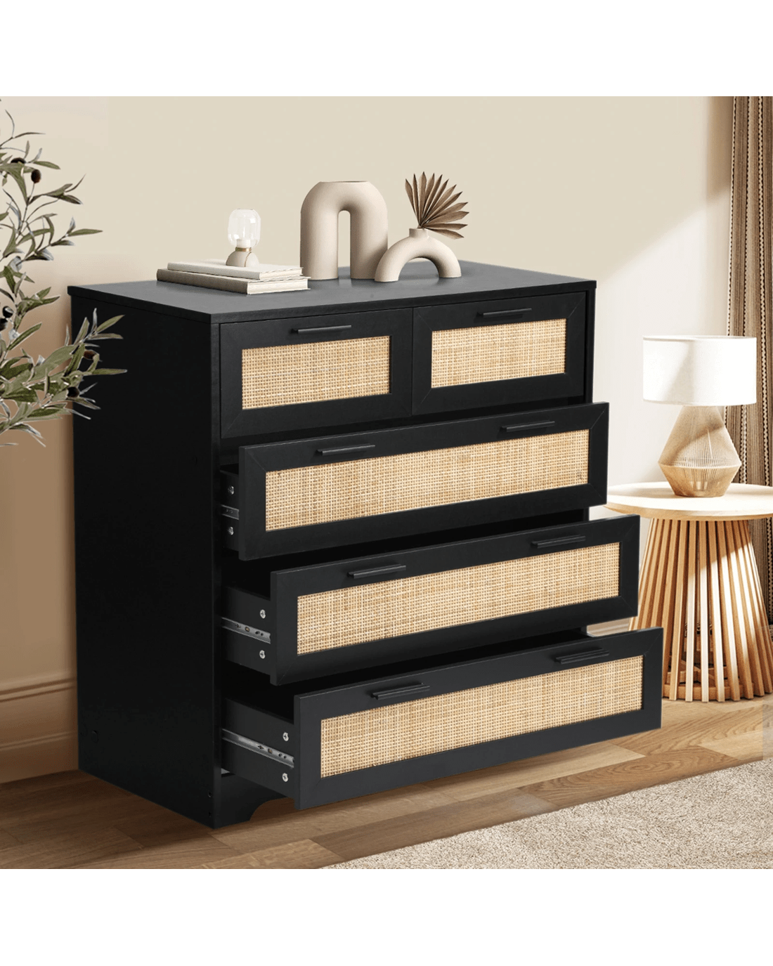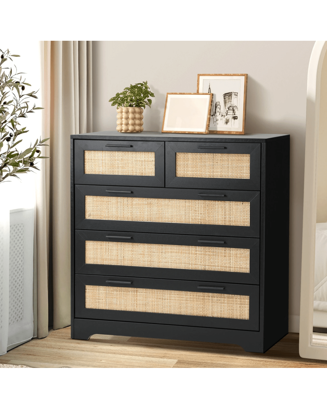 Sold by Kamprad's Oikos 1943Oikiture 5 Chest Of Drawers Dresser Storage Cabinet Tallboy Rattan - Black