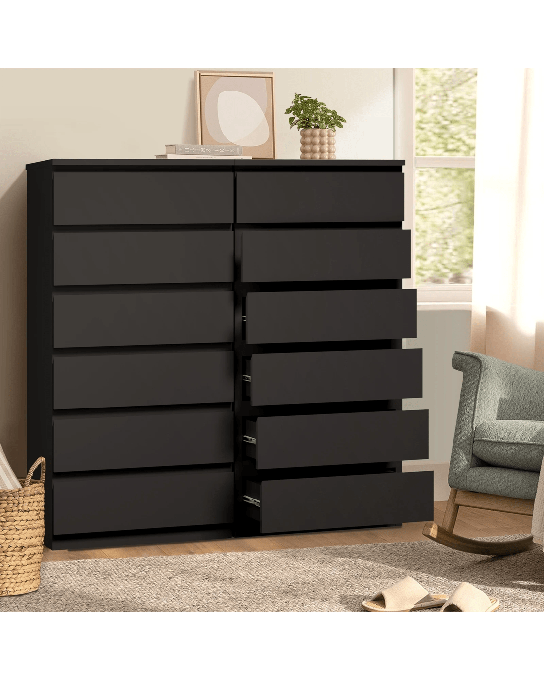 Whether placed in a bedroom, living room, or hallway, the versatile design ensures that our handle-free chest of drawers seamlessly blends into any space. Embrace the essence of contemporary living with this statement piece - where simplicity meets functionality, offering a sleek and chic black storage solution for the discerning homeowner of today.