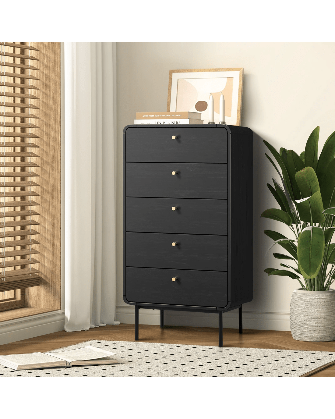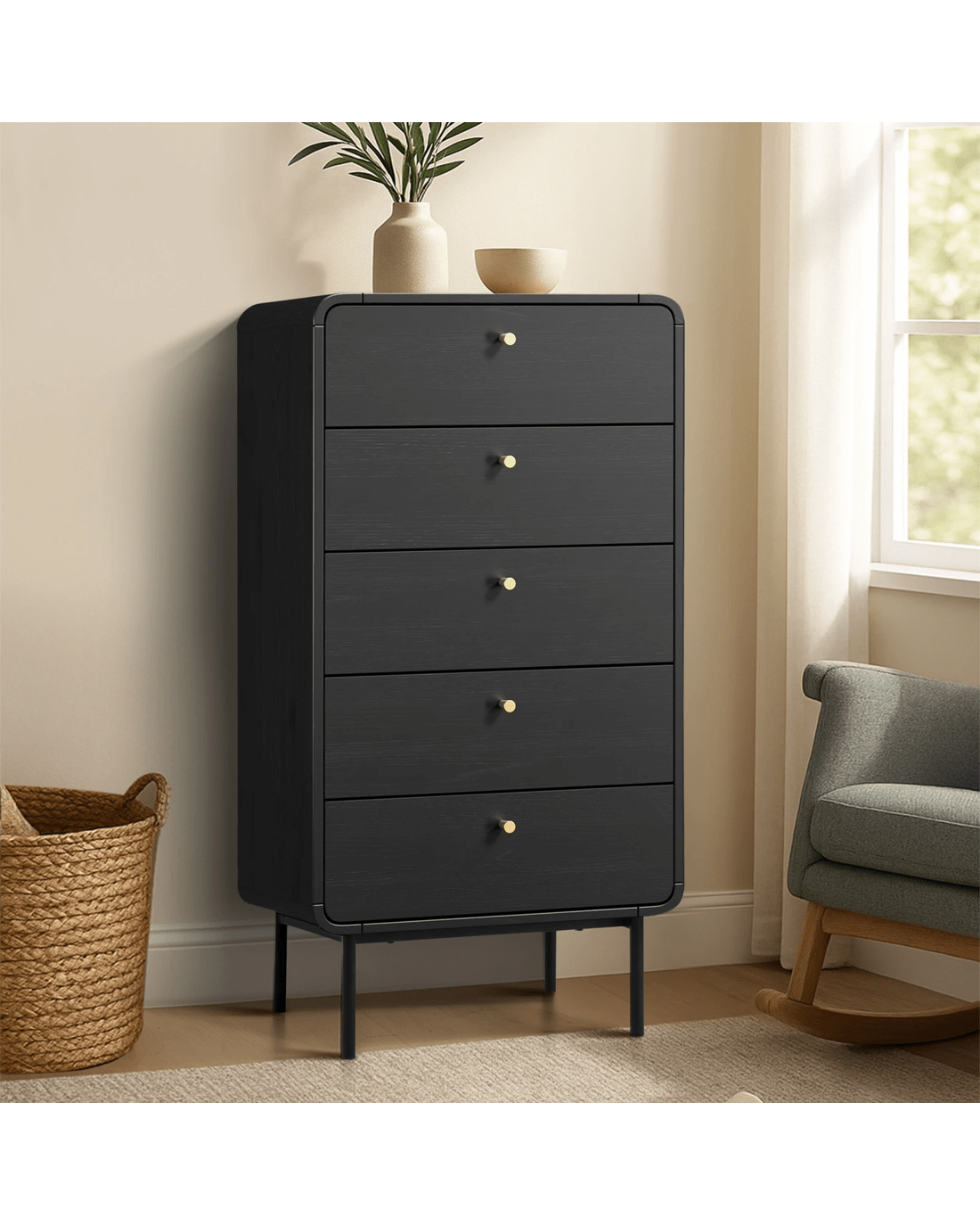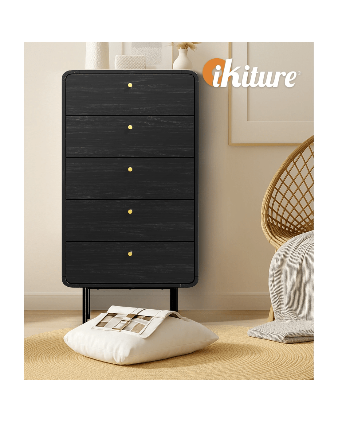 Simple and classic. Displaying a very practical and equally timeless design, our Oikiture Chest of Drawers features a black finish with tasteful wood grain textures to create aesthetic depth and character.