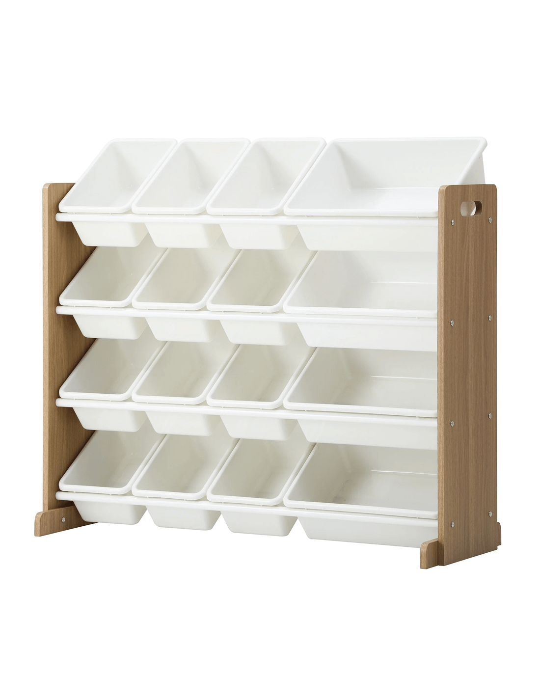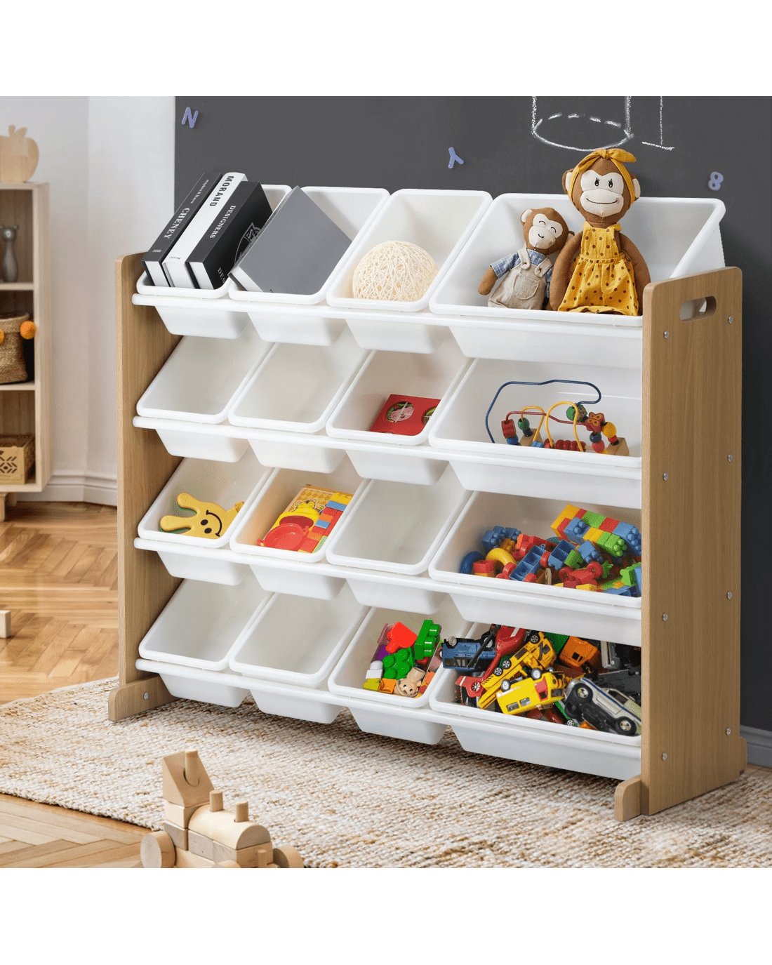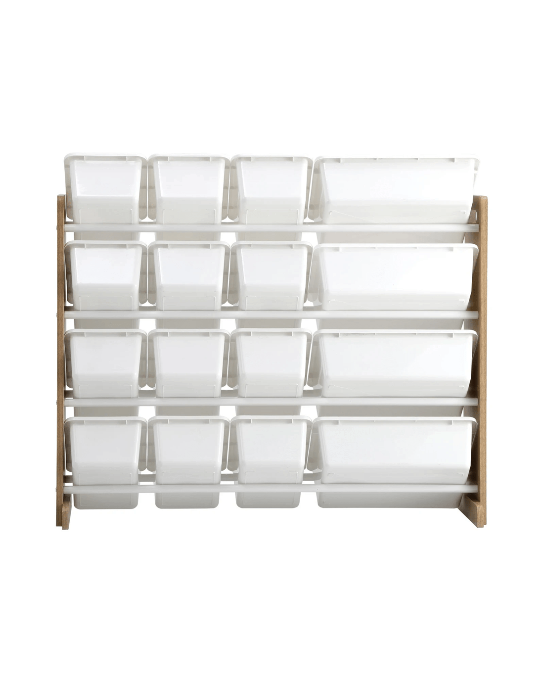 Comprising an array of 16 storage bins with two different sizing, the 4-tier storage organiser lets you store an assortment of items, ranging from toys to books to games. Large or small, the storage bins can be easily labelled and assigned for convenient keeping and retrieval. And if desired, the bins can be removed and brought to any location and returned to their original placement later. Better still, you can arrange the large and small bins on the 4-tier rack in any way that fits your fancy. Plus, the fact that the entire ensemble is built to kid-friendly specifications with smooth edges and the use of non-toxic and eco-friendly materials make this storage organiser even more reassuring and safer for use.