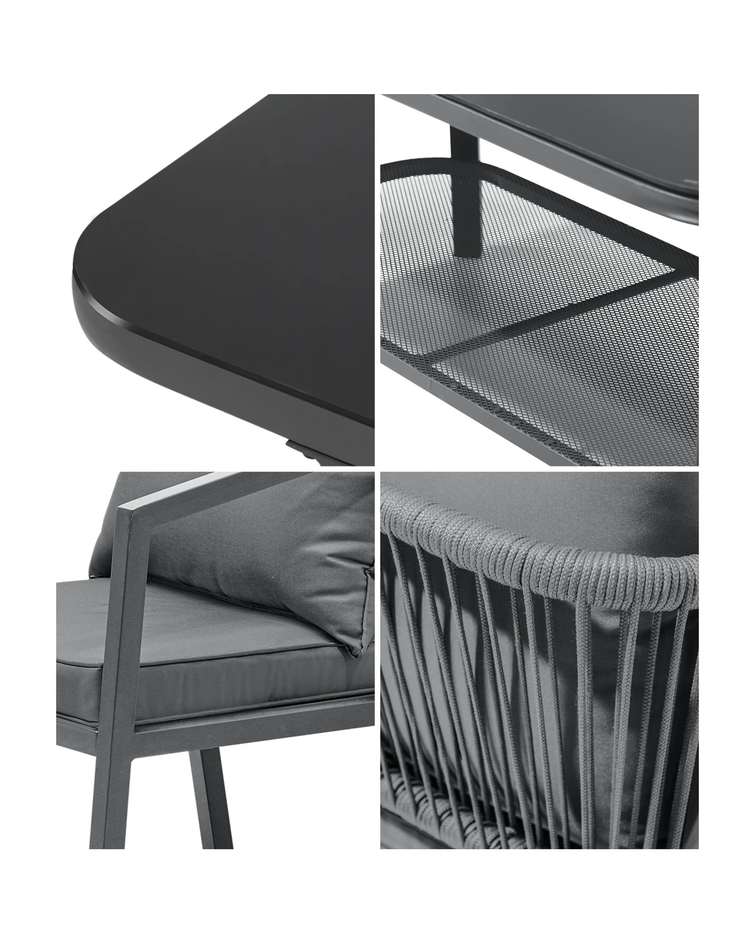 The set includes a spacious table with extra shelf storage, providing ample surface area for dining, entertaining, or simply enjoying a cup of coffee outdoors. The table is designed with a sleek and modern aesthetic, making it a stylish centerpiece for any outdoor setting. Its compact size allows for easy placement in smaller outdoor spaces, while still providing enough room for a comfortable dining experience.