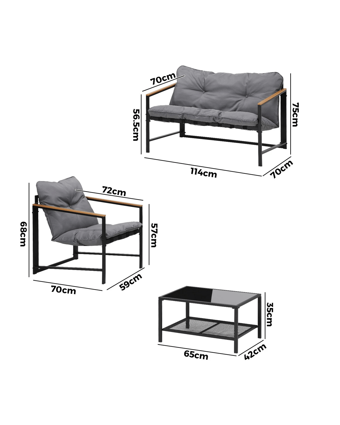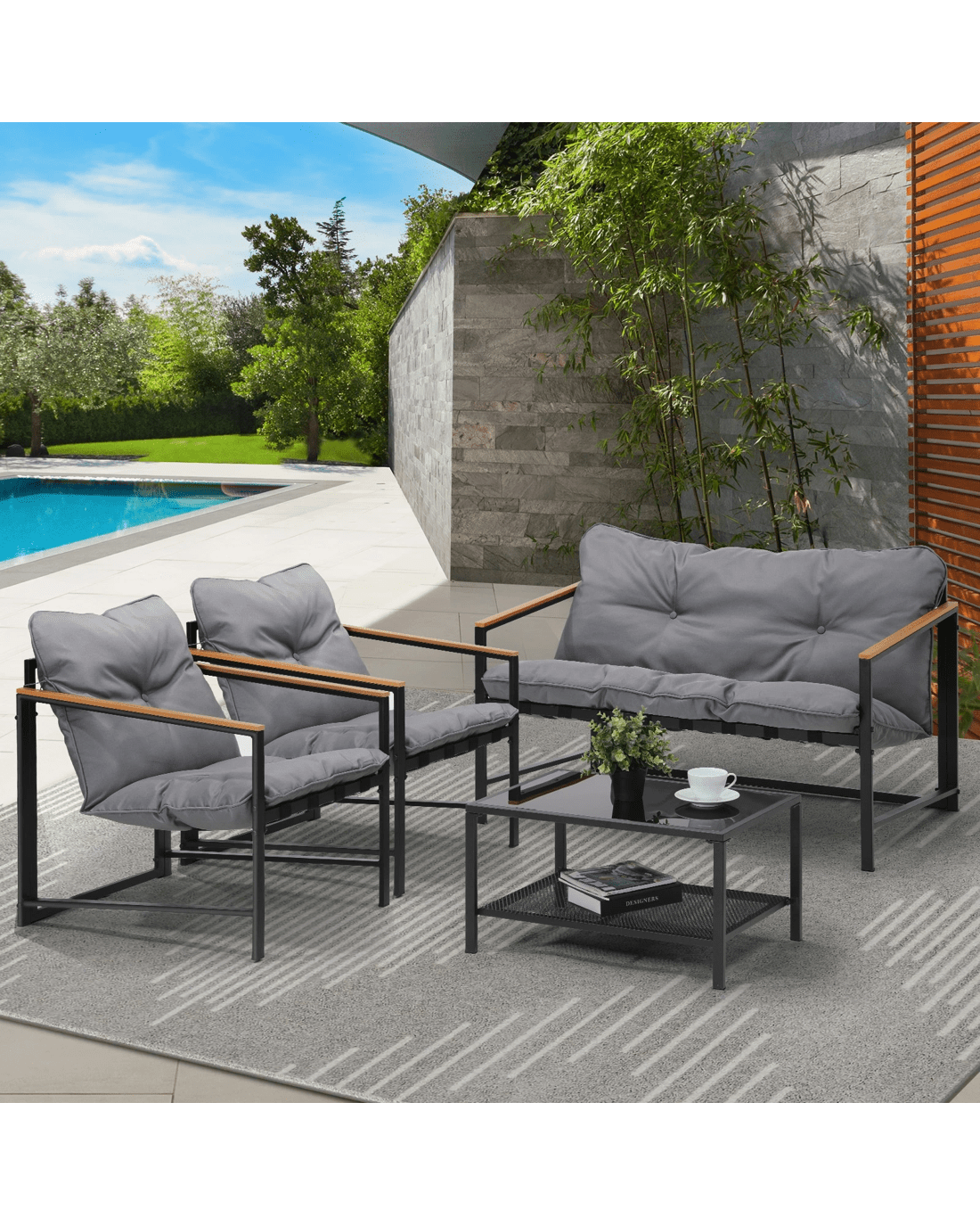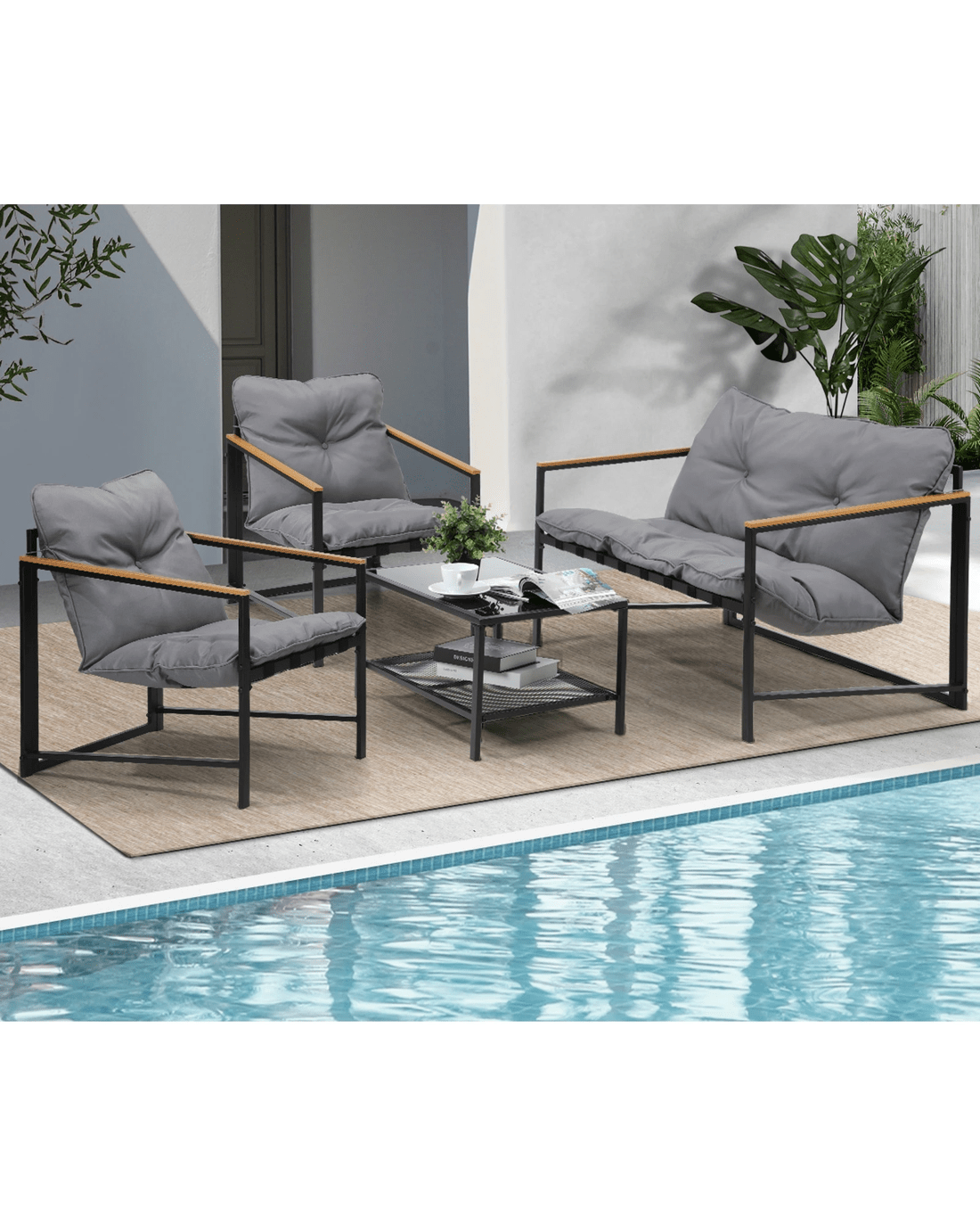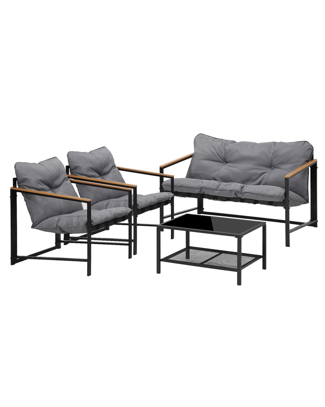 Living life to the fullest. Chilling out under the sun, moon and stars. Alfresco dining. Sharing cherished moments with family and friends. Celebrating milestones and successes and everything else in between. Simply pursuing and enjoying life that's meant to be. And the Livsip Outdoor Patio 4-pc Lounge Set is ready to be there at home with you. Stylish. Contemporary. Beautiful. It has all the makings of chic outdoor furniture that resonate with your discerning lifestyle. Sit back and feel the comfort of the well-padded cushioned seats and relax your arms on the smooth composite wood/plastic armrests. Have your lattes and savour that delicious food platter served on the matching coffee table. Not enough space on the glass table top? There's more real estate under the coffee table with a handy shelf for more delectable goodies and drinks to while the moments away. But how does it stand up to the harsh and sometimes fickle Australian weather? No worries mate as it's all weather-resistant with a powder-coated metal seat frame to add strength and durability for robust use (we know how things can get pretty rowdy with fun times!). Not least, this foursome setup also looks fabulous with any indoor eclectic styling ideas that you may have. Convinced that this delightful outdoor package is for you? Click on the Buy option and soon you'll be having the times of your life with the Livsip Outdoor Patio 4-pc Lounge Set at your beck and call.