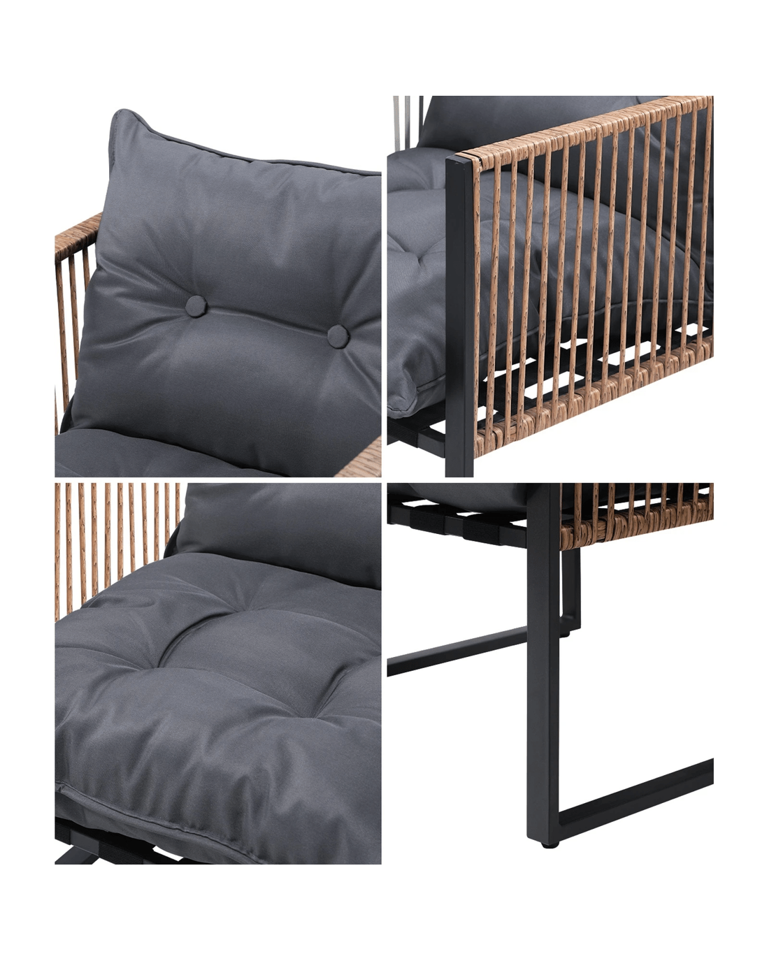 Crafted with UV-resistant PE wicker and powder coated frame, our patio set is designed to withstand the elements and provide enduring beauty. Every piece is carefully constructed using high-quality materials, ensuring the set remains strong and vibrant in the face of sun, rain, and other outdoor challenges. Indulge in the peace of mind that comes with owning furniture built to last.