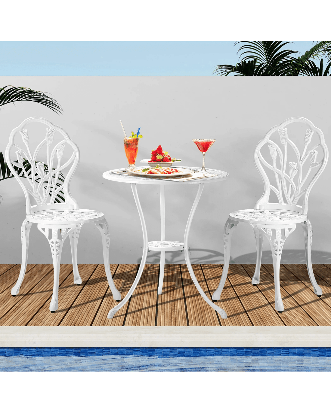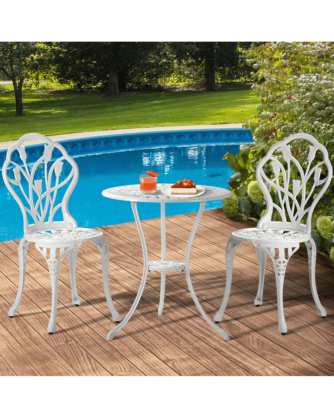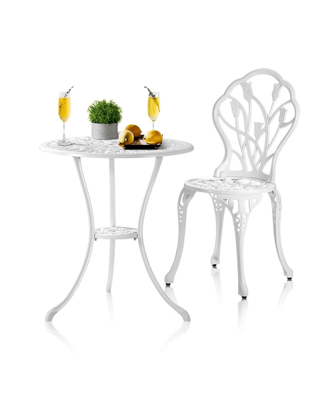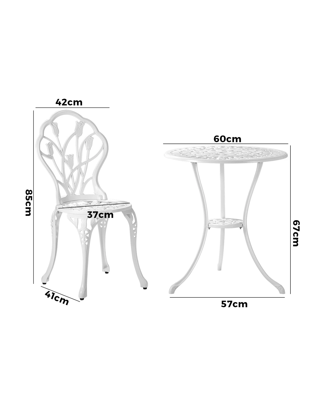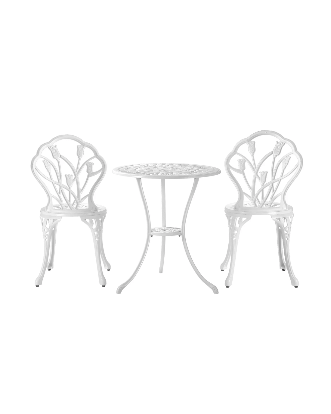 With its meticulous craftsmanship in showcasing the intricate design work, the bistro set is exceptionally stunning with every curve and motif. The Victorian-inspired craftwork is clearly displayed. From its sculpted profile to the detailed pattern etchings, the table and chairs are simply beautiful in every aspect.