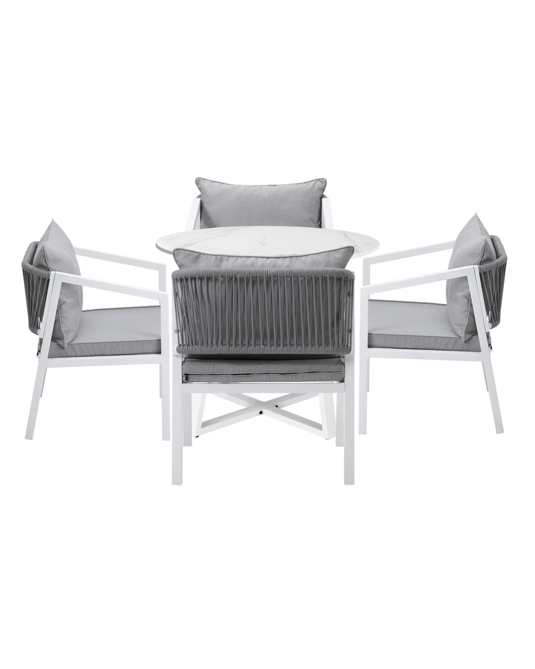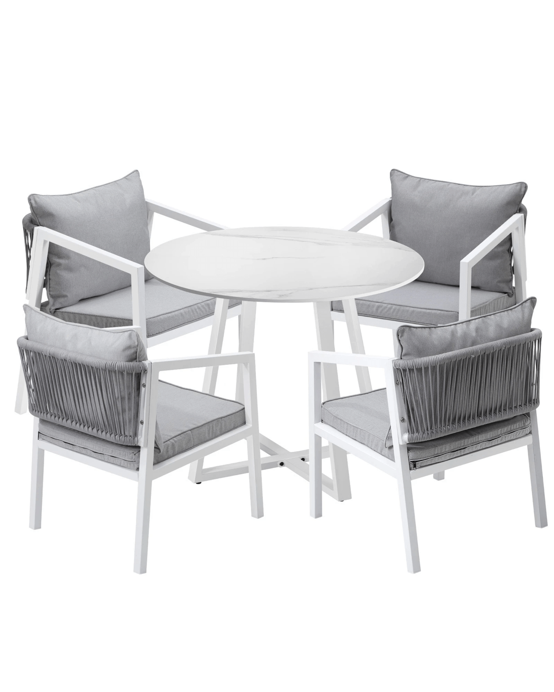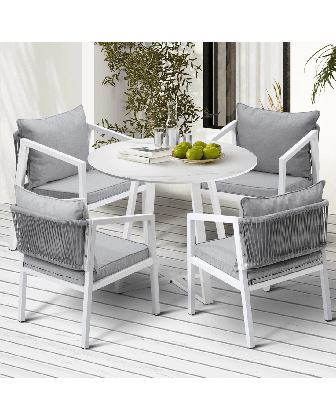 Living life to the fullest. Chilling out under the sun, moon and stars. Alfresco dining with friends, family or just with your precious me-time. Simply pursuing and enjoying life that is meant to be. And the Livsip Outdoor Dining Set is ready to be there at home with you. Stylish. Contemporary. Beautiful. For the dining table, a white stone compound table top. And for the dining chairs, equally attractive pieces that go well with the table. The set has all the attributes of chic outdoor furniture that resonate with your discerning lifestyle. Have your lattes, your favourite brews and savour delectable cuisines and other gastronomical delights. Eat, drink and be merry! But how does the dining set stand up to the harsh and sometimes fickle Australian weather? No worries mate as it is all weather-resistant, chairs and table, with strength and durability for robust use. Not least, this dining setup also looks fabulous with any indoor eclectic styling ideas that you may have. Convinced that this delightful outdoor package is for you? Click on the Buy option and soon you will be feasting to your (and many others too) heart is content at the Livsip Outdoor Dining Set day and night, night and day, in every season.