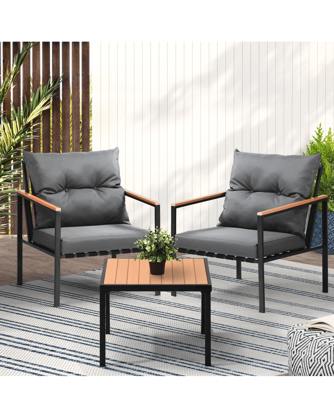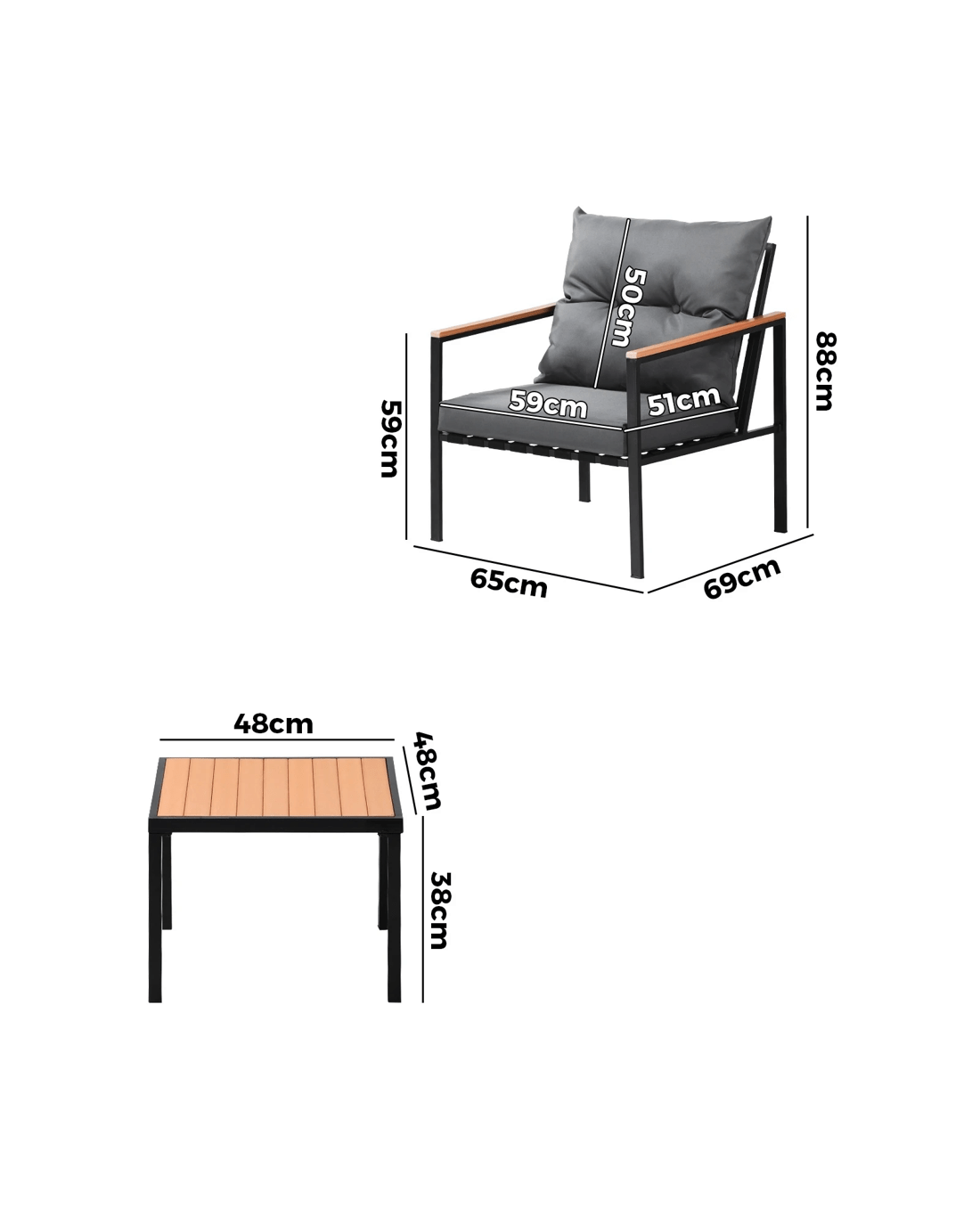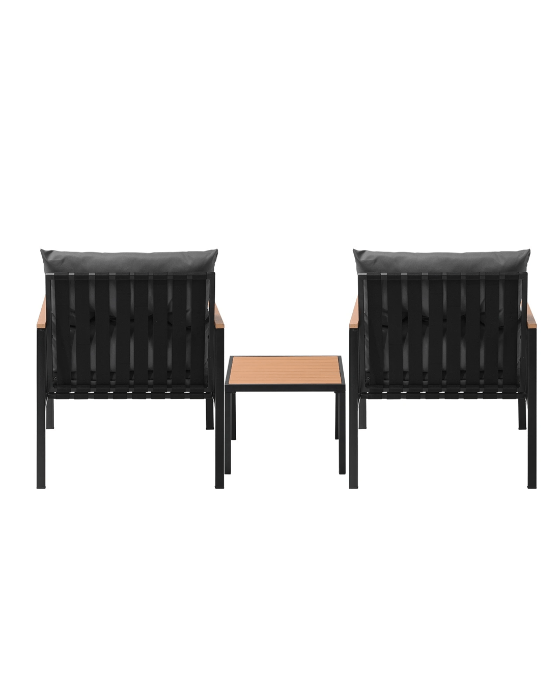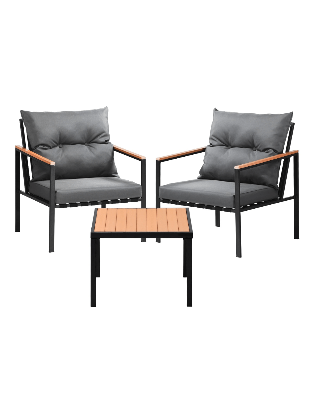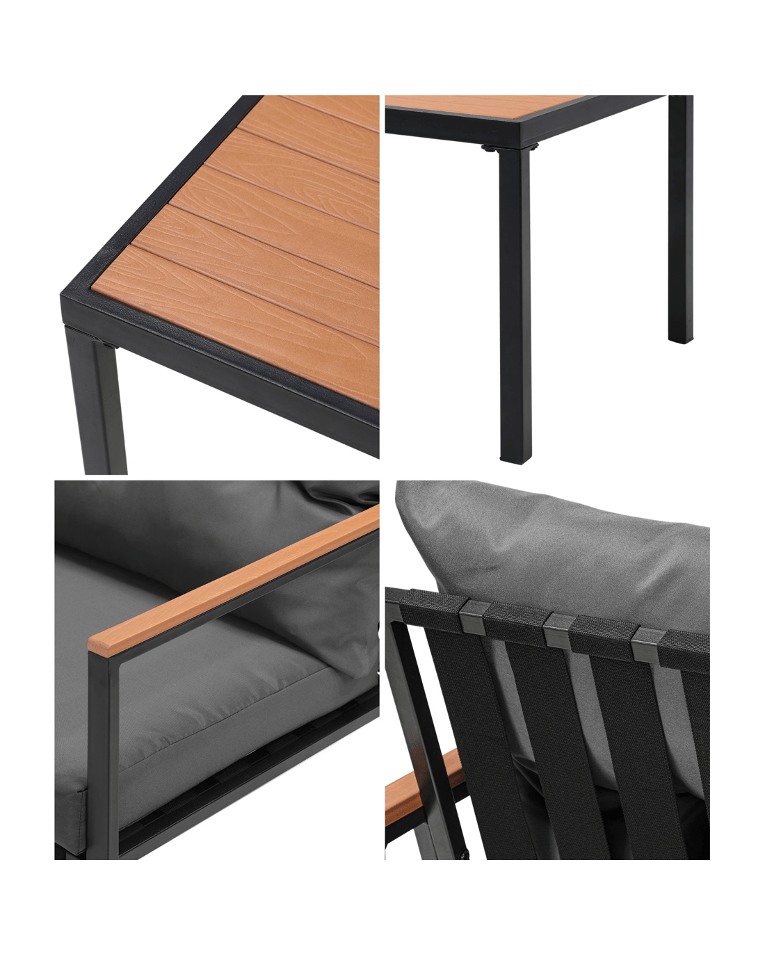 Naturally, we also ensure that the furniture is made with responsible and sustainable processes. Such as the eco-friendly wood material lining the armrests that not only looks good, but also display long-lasting qualities. Not to be outdone, the frame is made of heavy-duty powder-coated steel to enable robust use and high load bearing. Comfort is also not forgotten as all the seating features thickly padded high resilience cushions and an angled backrest that is perfected to let you seat for hours with nary a complaint. Not least, rounding off this exceptional set is a matching coffee table.