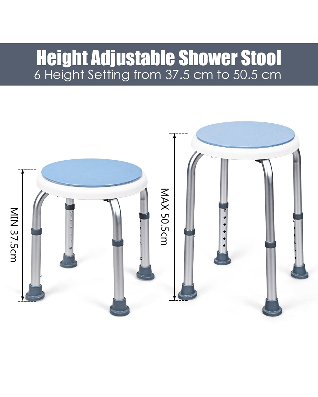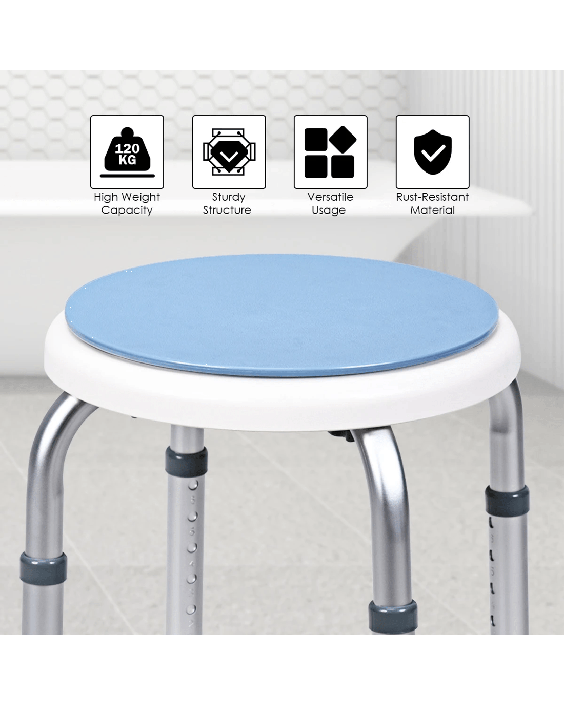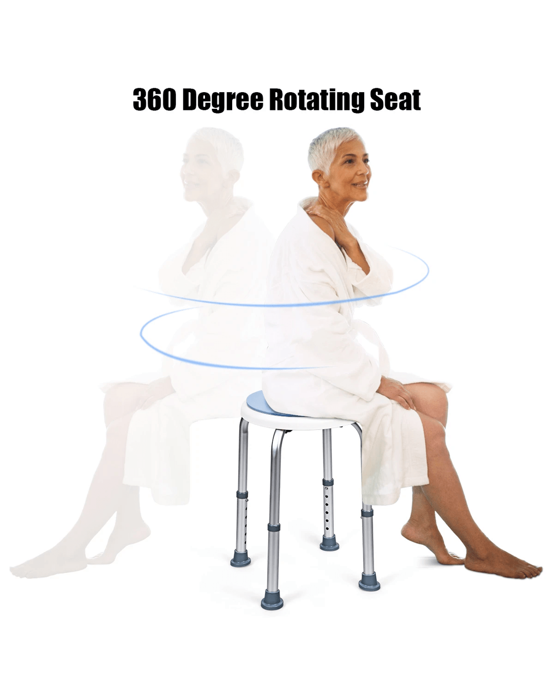 The 360° rotating shower stool will be a good solution to those who with limited mobility due to some reasons and faces inconvenient shower in daily life. Sitting on the 360° rotating seat, you will obtain a relaxing and comfortable shower experience. Height-Adjustable legs allow you to customize the shower stool based on your own requirements and preference. Aluminum structure featuring rust resistance makes the shower stool keep shiny surface all the time. High weight capacity and ultra stability eliminate your fear of wobbling. Furthermore, tool free assembly frees you from complex assembly process and thus helps you save more energy.