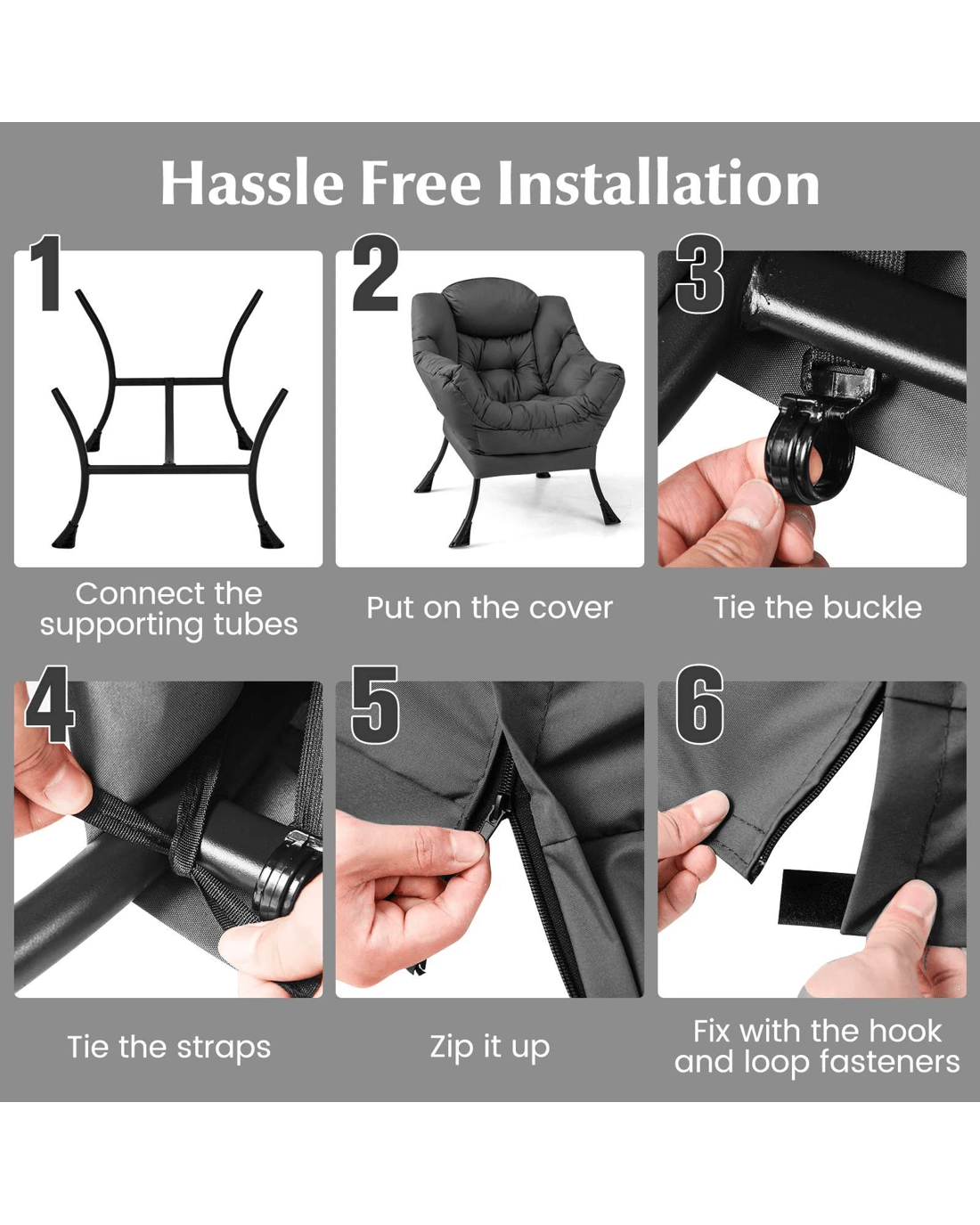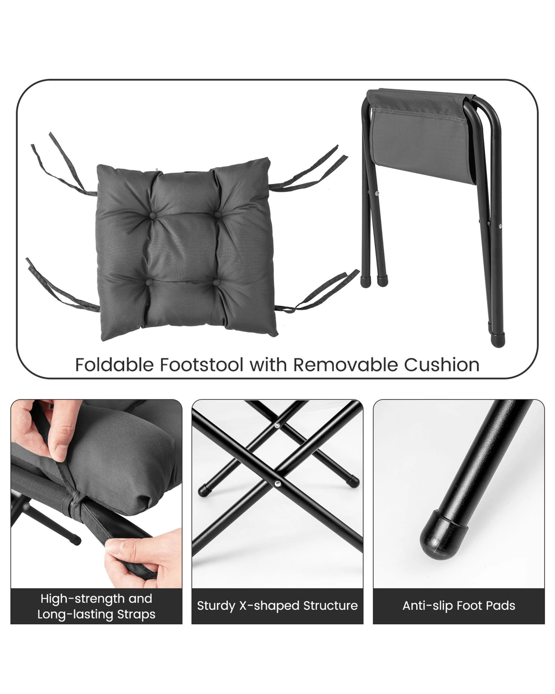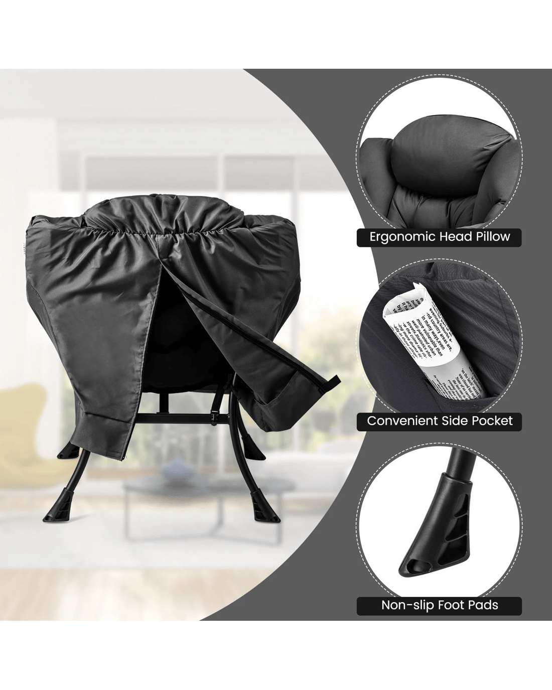 In order to build a durable and stable lazy chair ottoman set, premium polyester fabric and heavy-duty metal pipes are selected. With a soft head pillow and armrests, you are able to sit with comfort. Moreover, the extra-large seat with ergonomic design allows you to relax completely. The armchair with footrest offers support for different parts of the body. Additionally, the foldable footstool with removable cushion also brings extra seat as required. With sturdy X-shaped structure and anti-slip foot pads, it is more stable. Whether in the living room, bedroom, balcony, garden or other places, the accent contemporary lounge chair with ottoman injects a modern flair to the space.