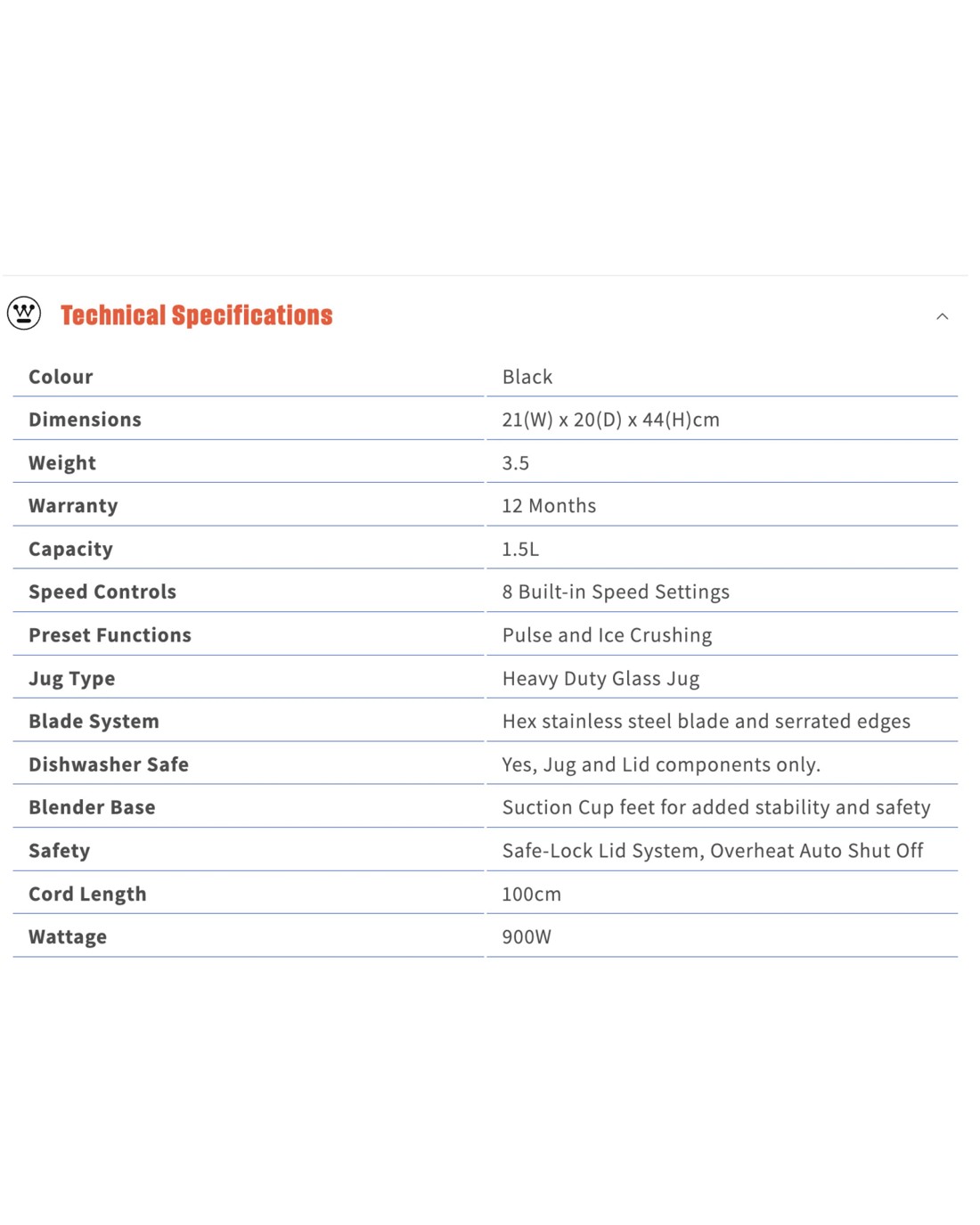 Power, precision and polished design – the Westinghouse 900W Blender brings high-performance blending to your benchtop with fresh, fuss-free style. This model is part of a fresh batch – no dusty old stock here – so you’ll enjoy the full product lifespan and latest features without compromise. Featuring a robust 900W motor, eight variable speeds, and innovative hex blade tech, this blender handles everything from silky smoothies to crushed ice in seconds. The 1.5L heavy-duty glass jug is both stylish and durable, perfect for sharing soups, shakes or cocktails. With an intuitive LED display and smart control knob, you’re always just a twist away from perfect consistency.