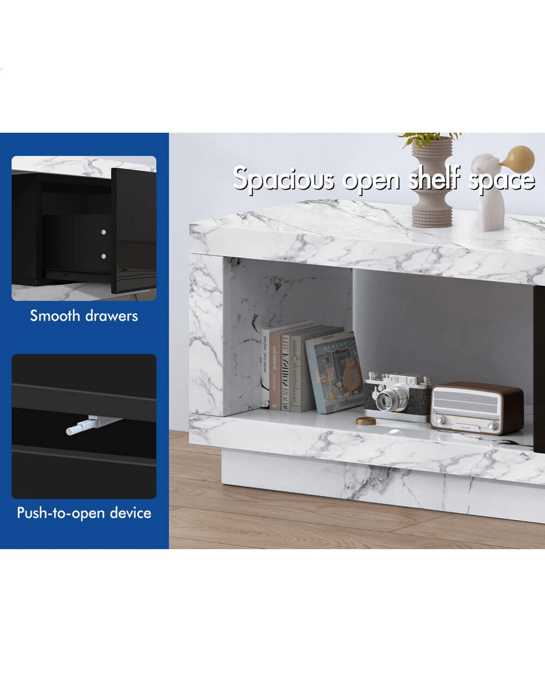 Reliable quality - Made of superior 15mm thick board, our entertainment unit is durable and resistant to scratches. Instead of flimsy paper finish, it is well made with smooth melamine finish which is easy to maintain and long lasting. Equipped with qualified sliding rails and push-to open device, the drawers quietly open and close so you can access your items with ease.