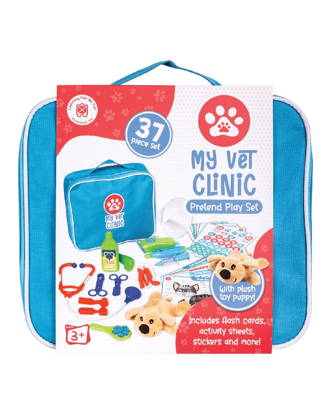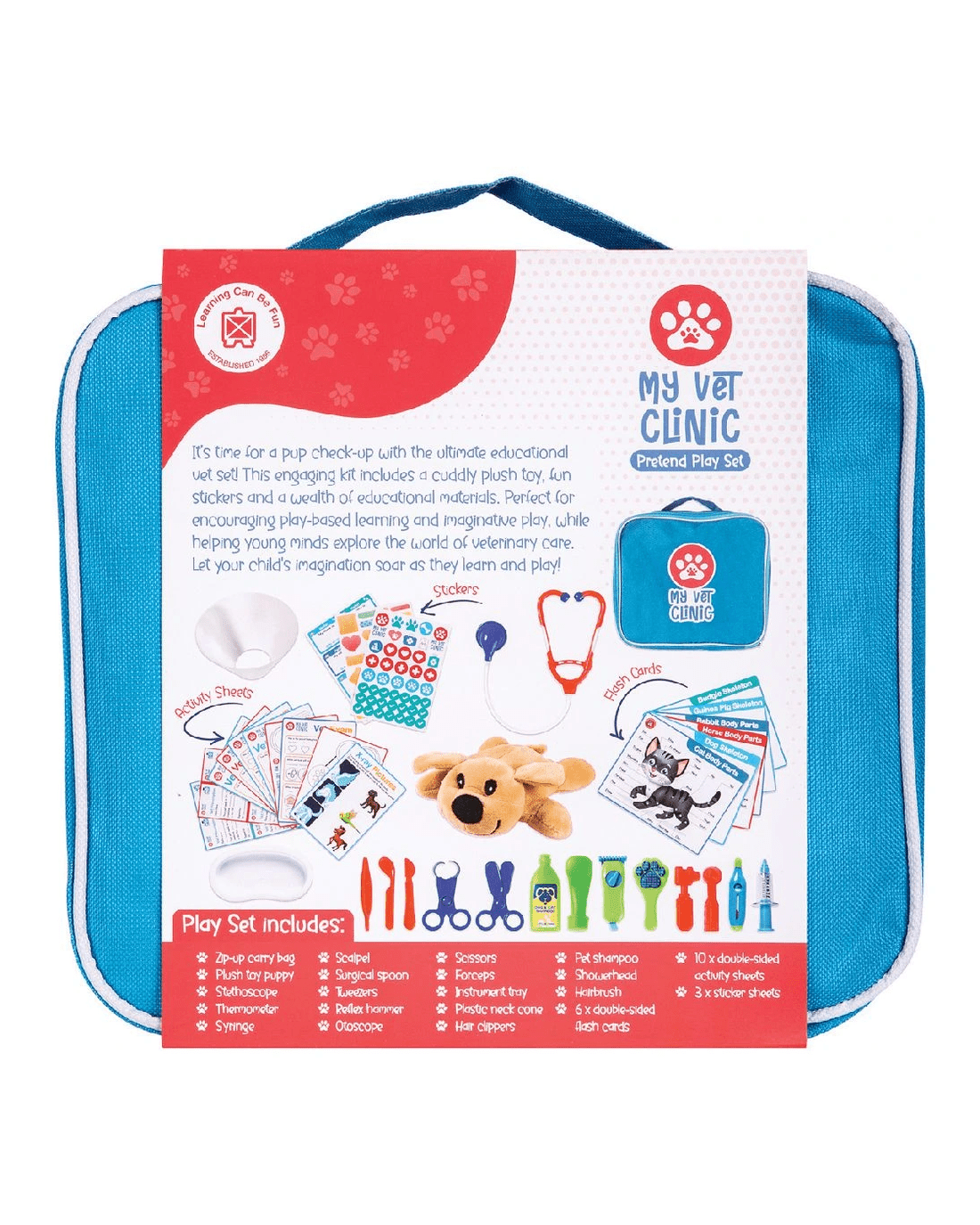 Early learners will love exploring animal care with this beautiful My Vet Clinic Pretend Play Set from Learning Can Be Fun. It includes tools and activity cards for early learners so they can learn to check-up and treat animals and pretend to check vital signs and treat ailments.