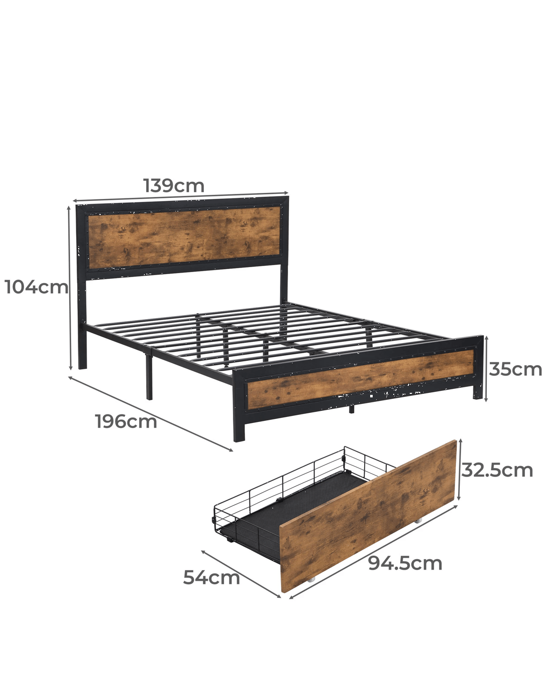 Bed frame (double): 196cm x 139cm x 104cm (W x D x H)