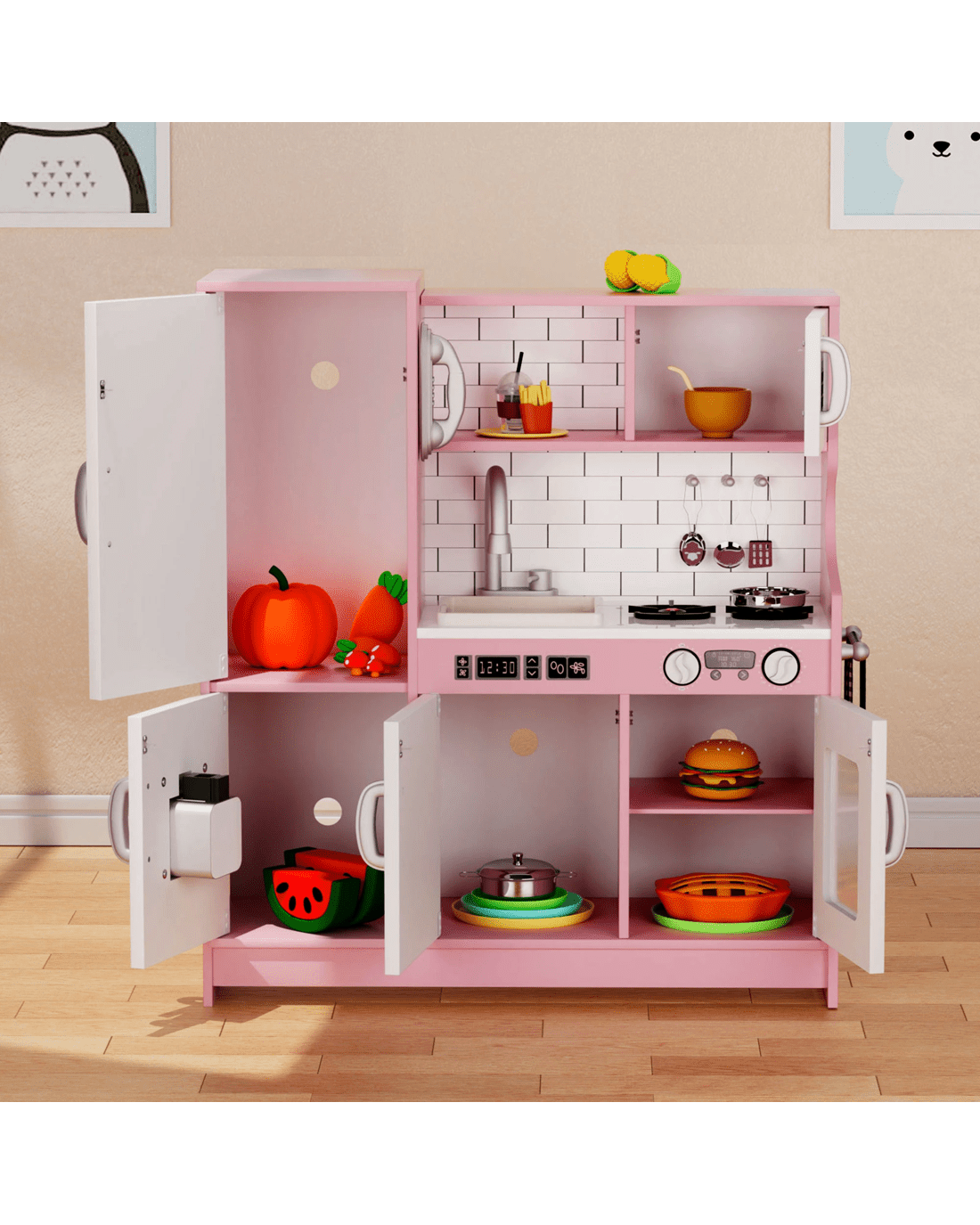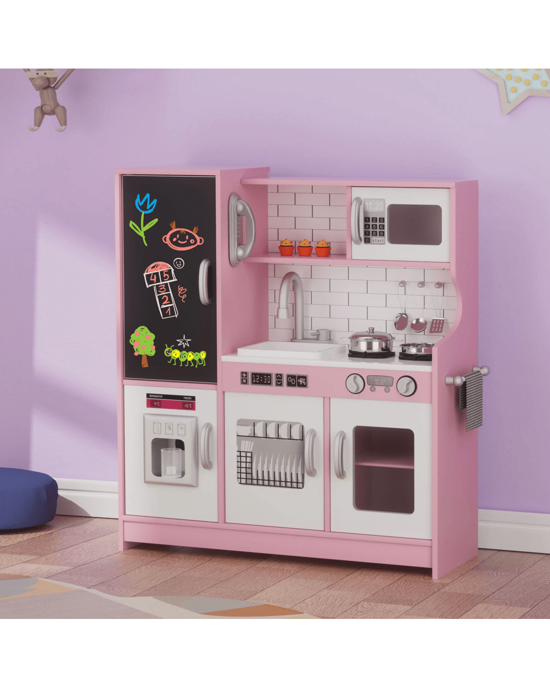 Give your little chef the ultimate pretend play experience with the Bopeep Kids Kitchen Set! This beautifully crafted wooden kitchen playset is designed to inspire creativity and imagination. Perfect for both boys and girls, this interactive toy kitchen features everything your child needs for hours of fun, including a microwave, ice maker, dishwasher, oven, stovetops, sink, chalkboard, and even a toy phone—making it the ultimate pretend play kitchen.