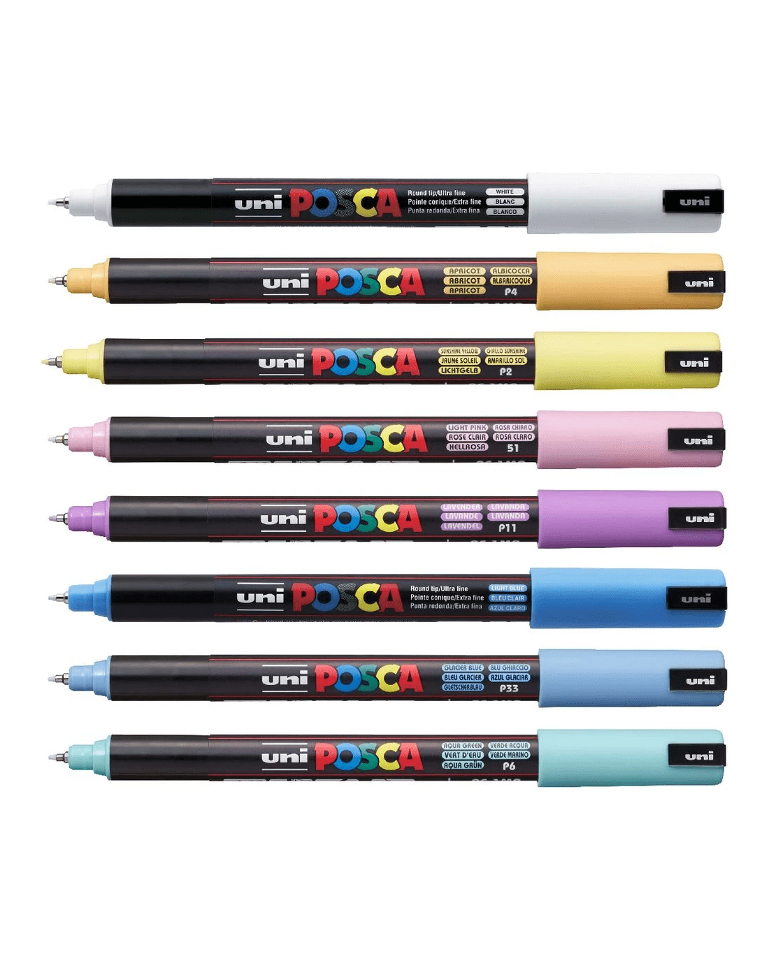 - Please refer to the “Posca Markers Product Information Brochure” (attached below) for further information on the various Posca nib sizes, colour options across each nib size, information on the various surfaces Poscas will work on, as well as some inspiration for your work.