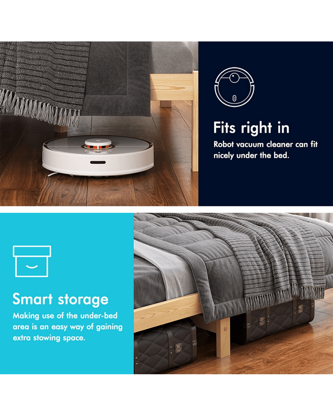 More storage place - The elevating design not only allows robot vacuum cleaner to go through under the bed, but also provides you with an additional storage space. We also have matching trundle drawers in store for sale, so you can keep clothes, bedding, linen and more within reach.