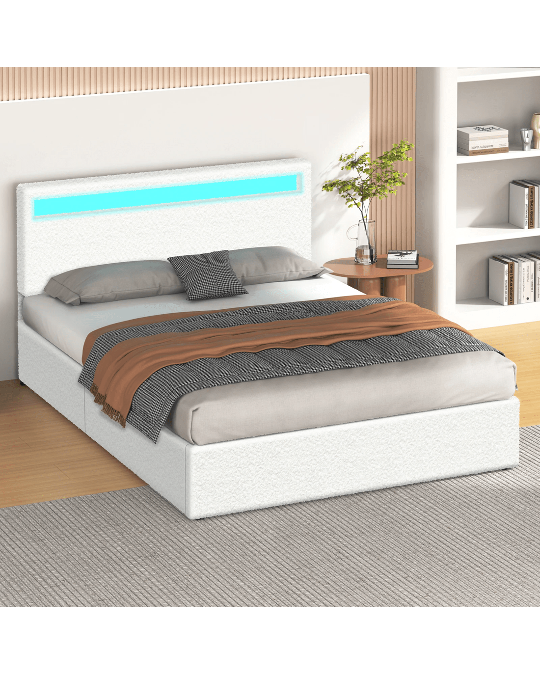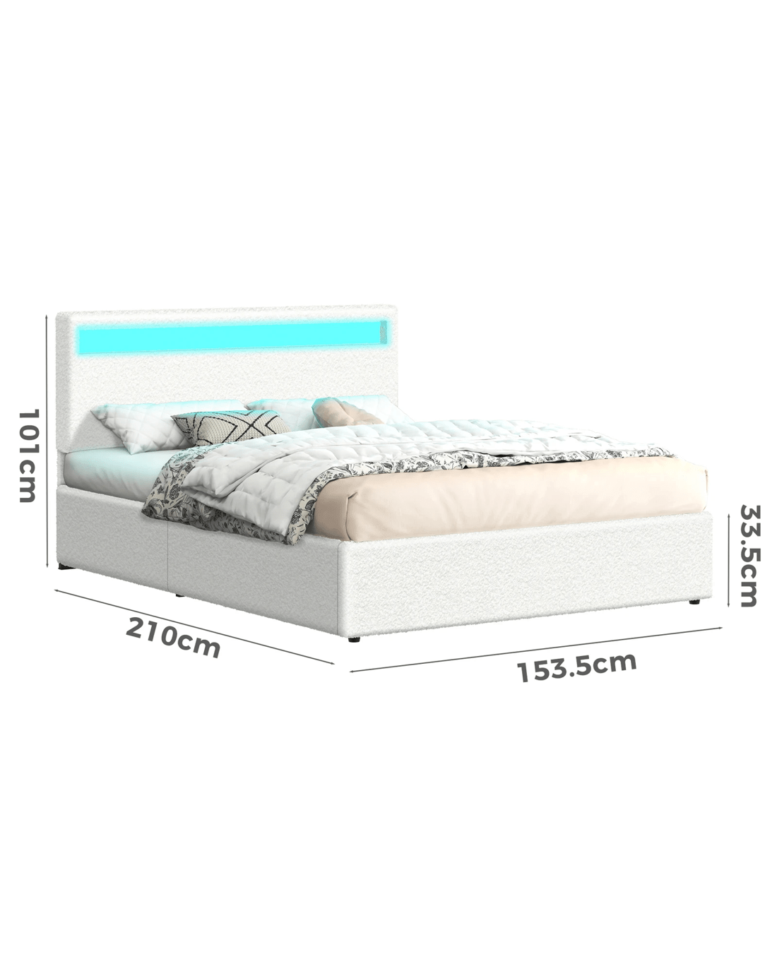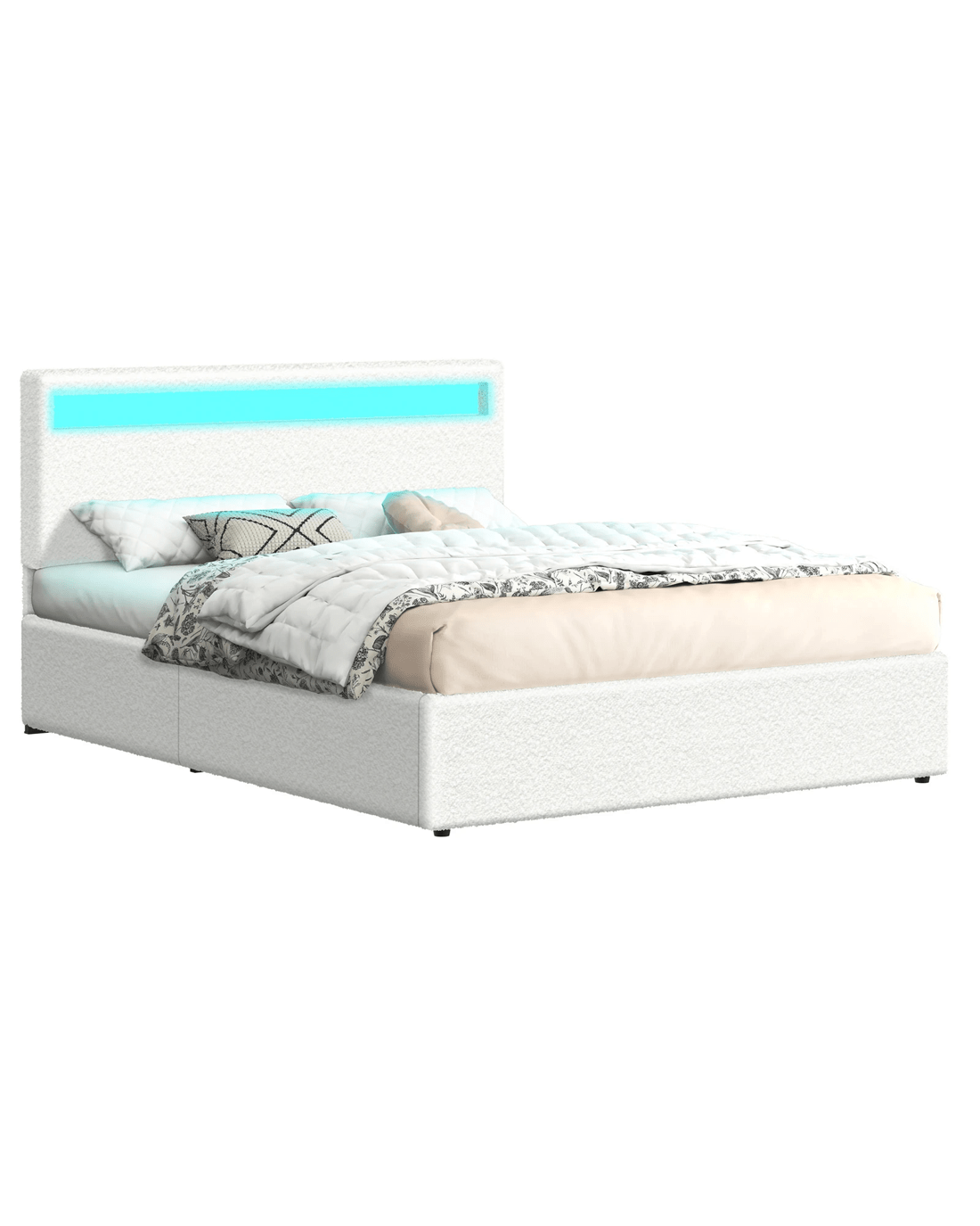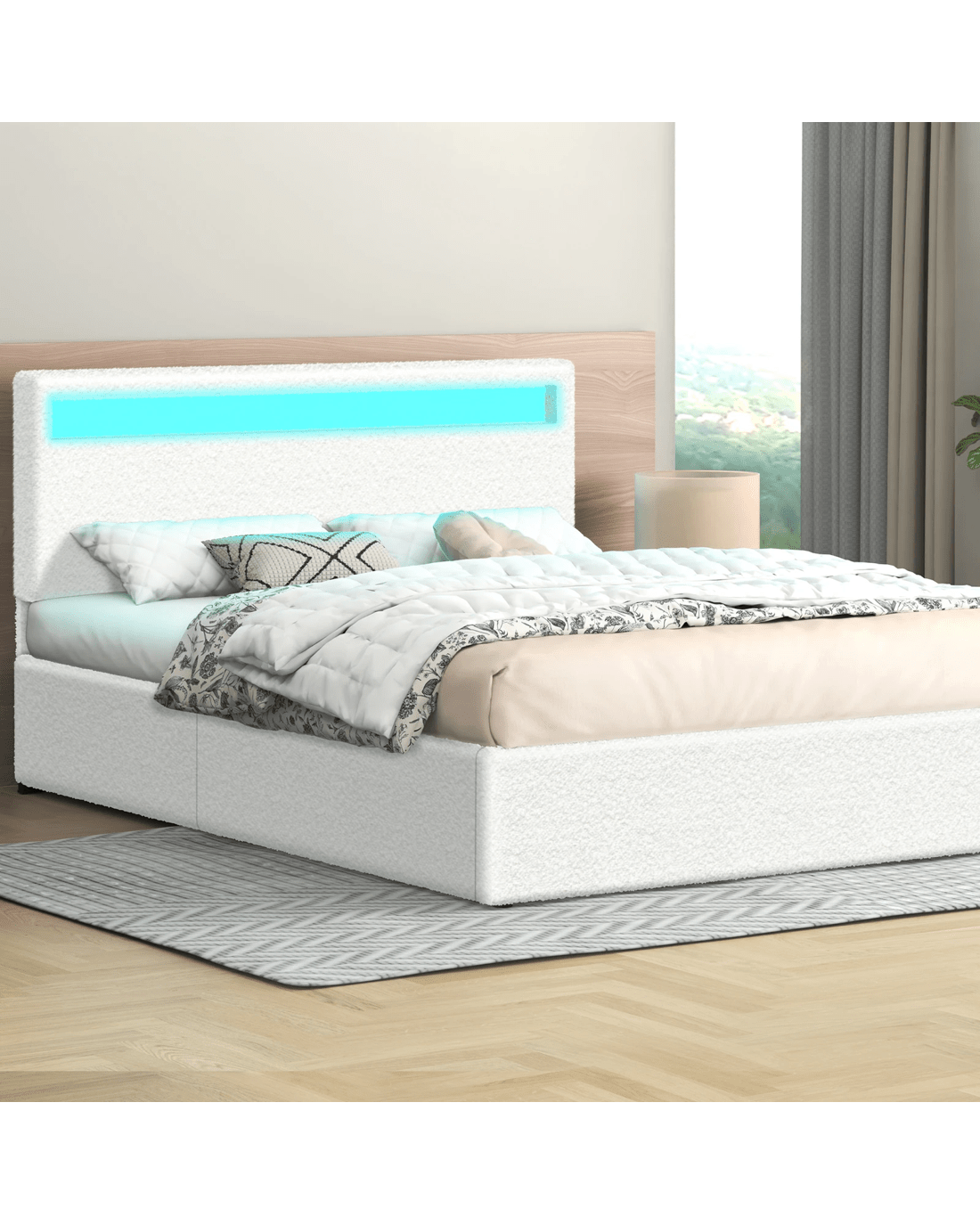 Sold by Aussie Union GroupAlfordson Bed Frame Queen Size RGB LED Gas Lift Storage Base Boucle Luchino - White