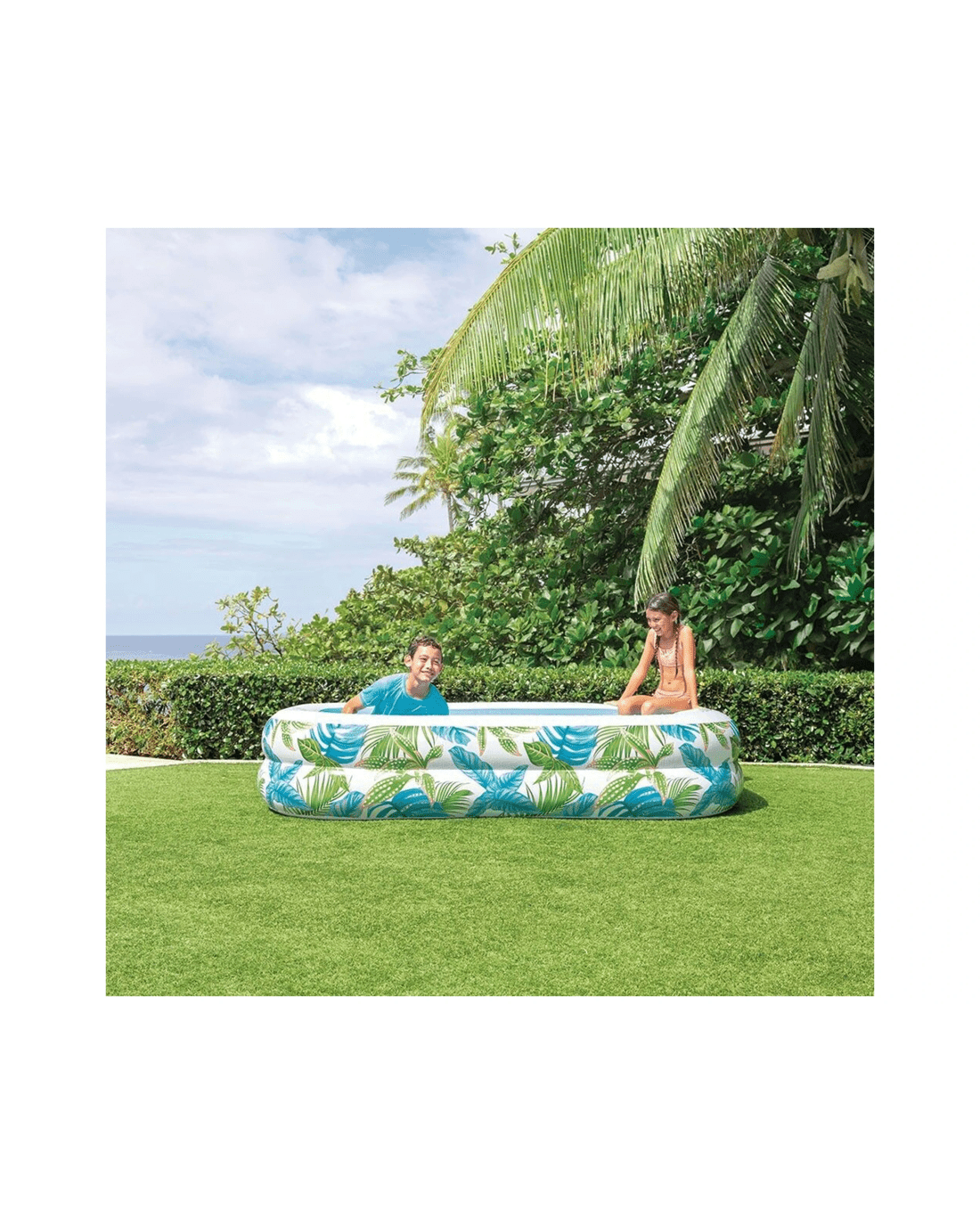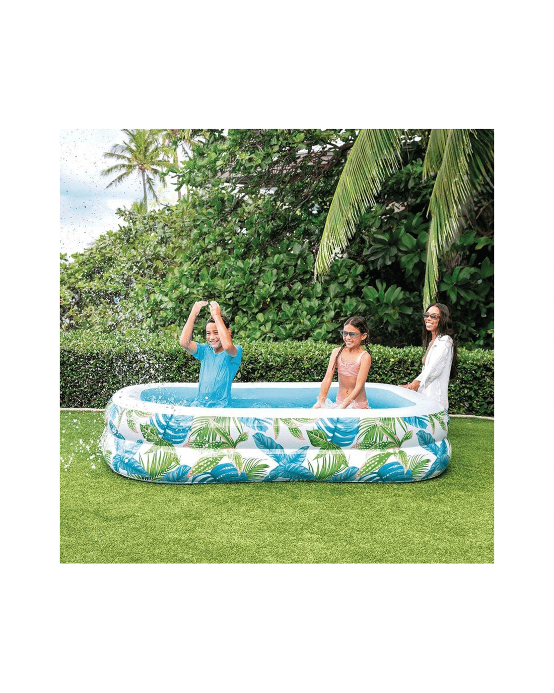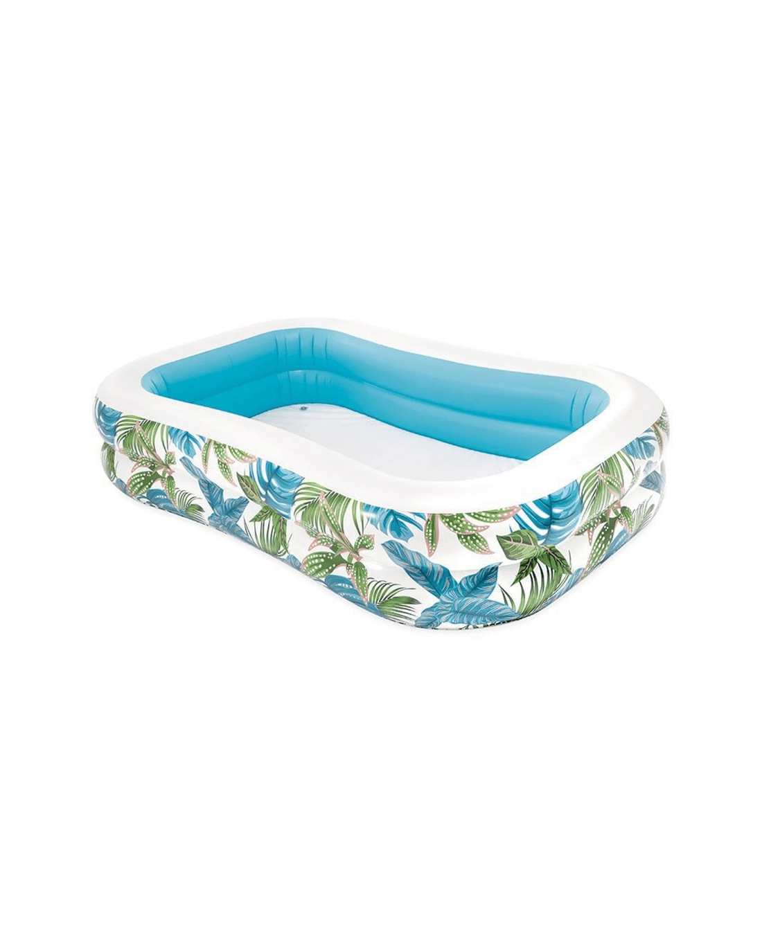 The INEX Tropical Swim Center Inflatable Family Pool is designed for outdoor water activities and family fun. Its vibrant tropical-themed pattern makes it a stylish addition to any backyard, creating a relaxing and inviting atmosphere for all ages.