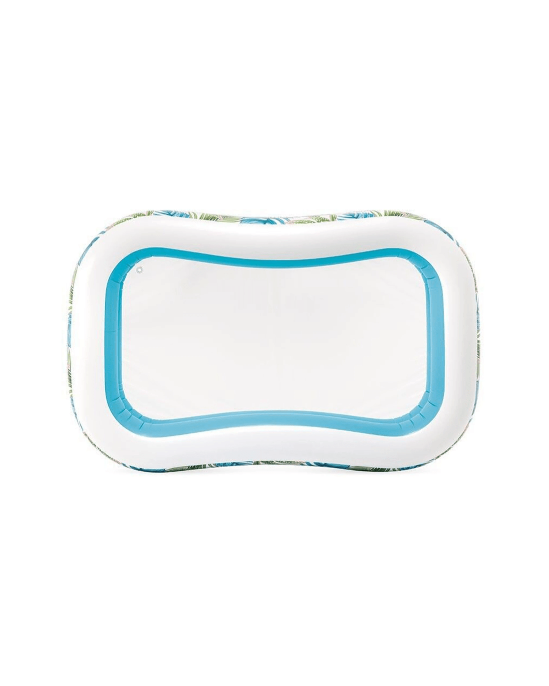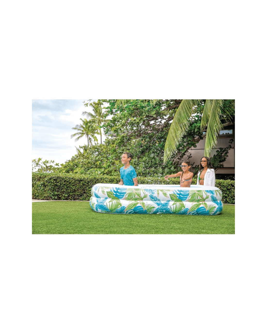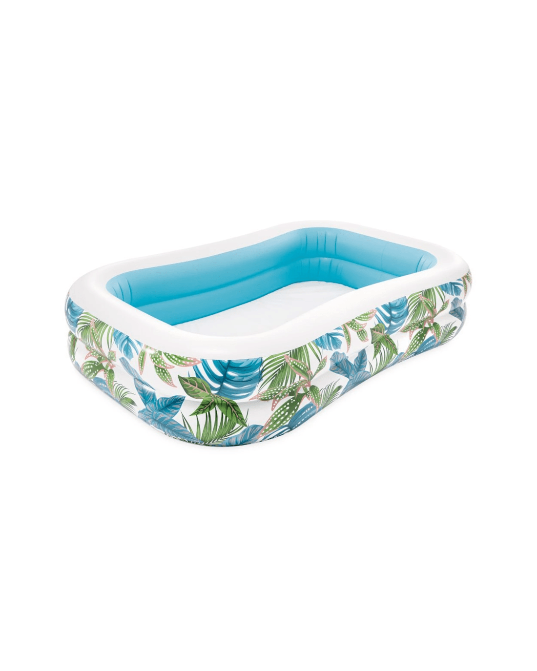 The INEX Tropical Swim Center Inflatable Family Pool is designed for outdoor water activities and family fun. Its vibrant tropical-themed pattern makes it a stylish addition to any backyard, creating a relaxing and inviting atmosphere for all ages.