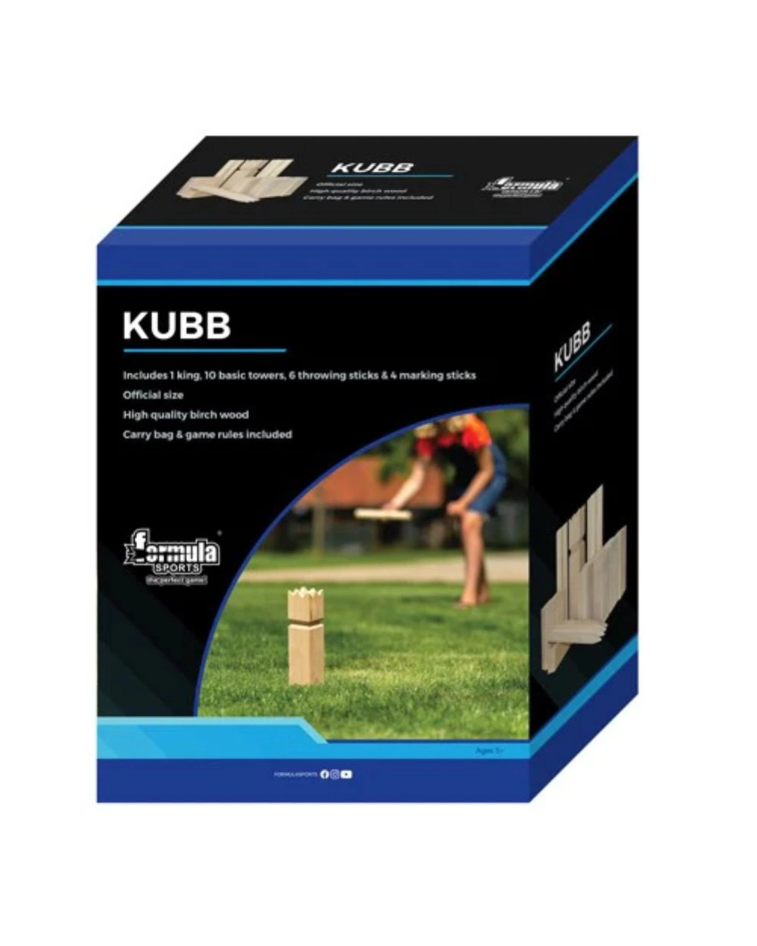 Kubb is a classic game of skill, with its origins from Northern Europe. Defeat the opponent and knock over all the base towers with the throwing sticks. To finish them off, defeat the king and win the game! Contains 21 official size wooden playing pieces. The base towers, sticks and king are made of high quality birch wood. Comes in a full-colour box with detailed instructions. Ages: 5 +