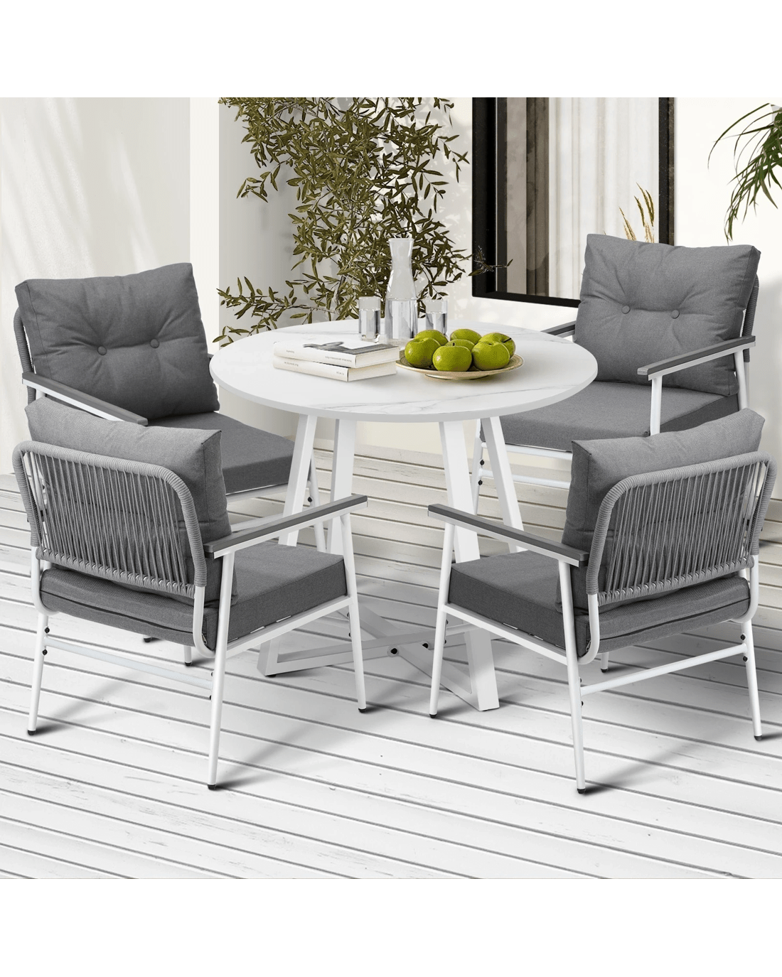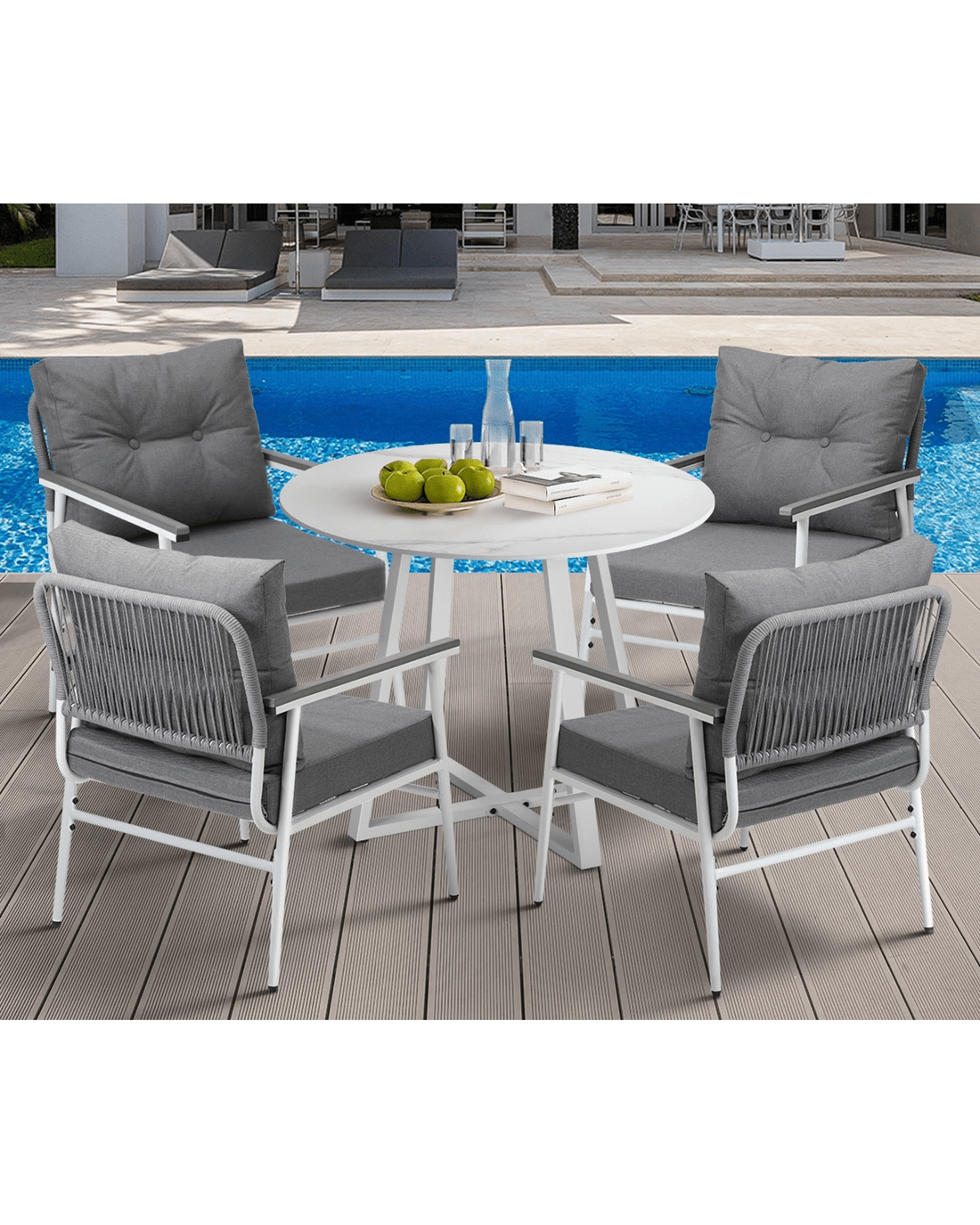 Living life to the fullest. Chilling out under the sun, moon and stars. Alfresco dining with friends, family or just with your precious me-time. Simply pursuing and enjoying life that is meant to be. And the Livsip Outdoor Dining Set is ready to be there at home with you. Stylish. Contemporary. Beautiful. For the dining table, a white stone compound table top. And for the dining chairs, equally attractive pieces that go well with the table. The set has all the attributes of chic outdoor furniture that resonate with your discerning lifestyle. Have your lattes, your favourite brews and savour delectable cuisines and other gastronomical delights. Eat, drink and be merry! But how does the dining set stand up to the harsh and sometimes fickle Australian weather? No worries mate as it is all weather-resistant, chairs and table, with strength and durability for robust use. Not least, this dining setup also looks fabulous with any indoor eclectic styling ideas that you may have. Convinced that this delightful outdoor package is for you? Click on the Buy option and soon you will be feasting to your (and many others too) heart is content at the Livsip Outdoor Dining Set day and night, night and day, in every season.