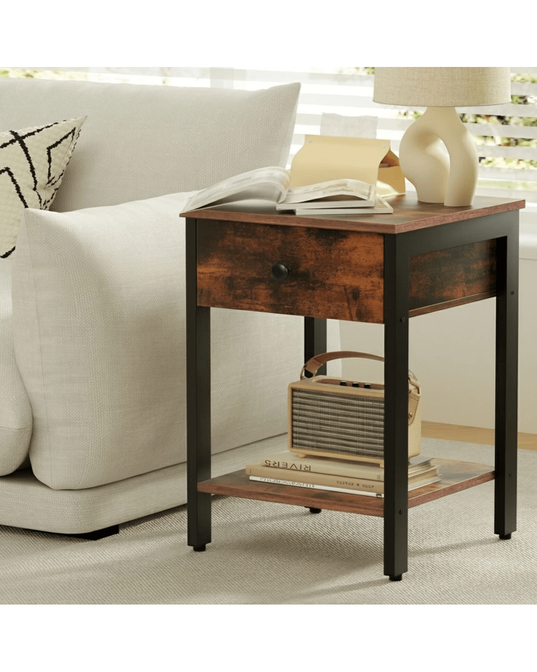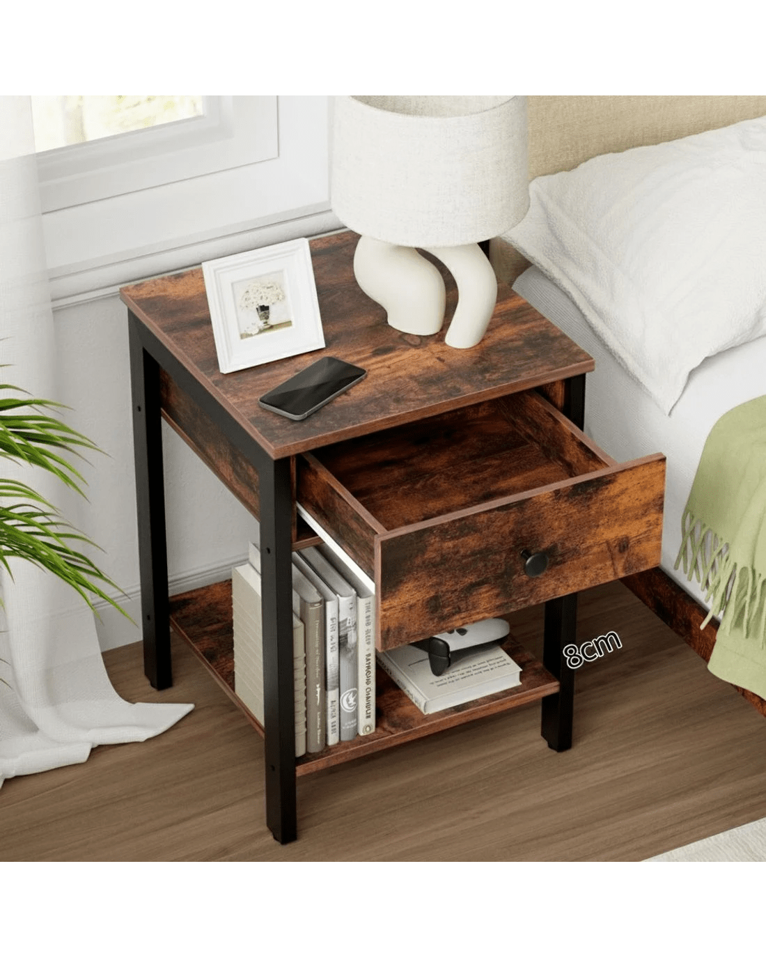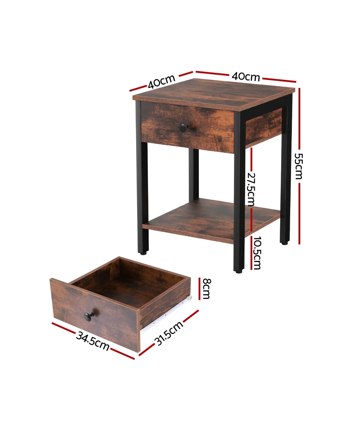 Crafted from durable E1 particle board, this Artiss bedside table boasts ample storage with one open shelf and one drawer, adorned with sleek metal knob. The easy-clean surfaces resist stains, perfect for busy households.It effortlessly fits into living rooms, lounges, bedrooms, or studio apartments.