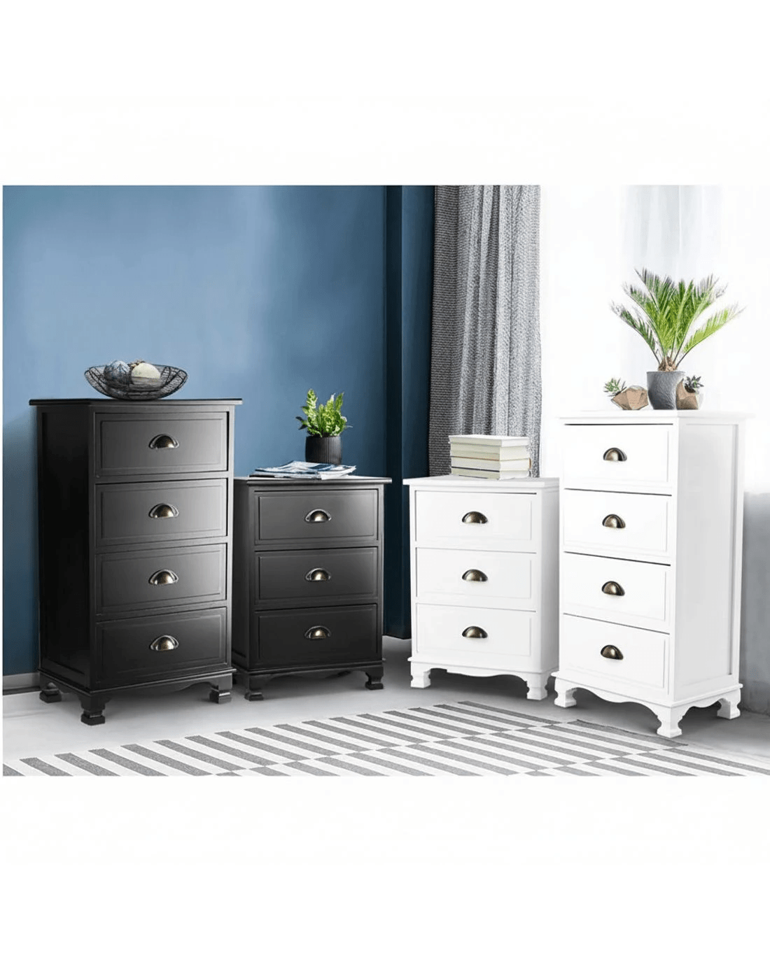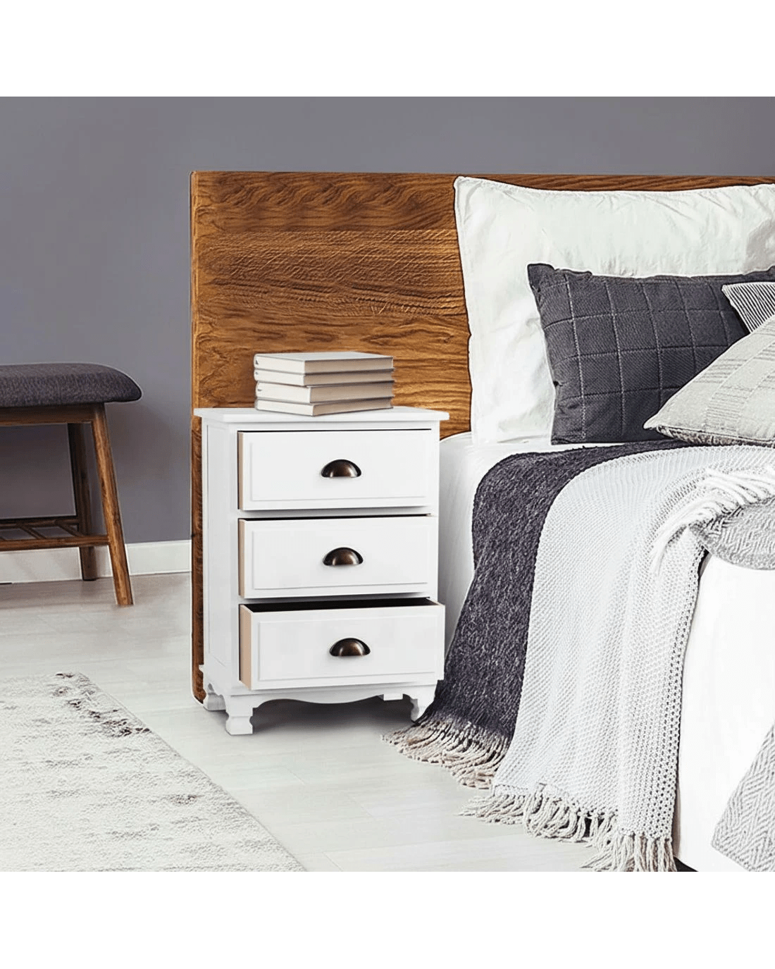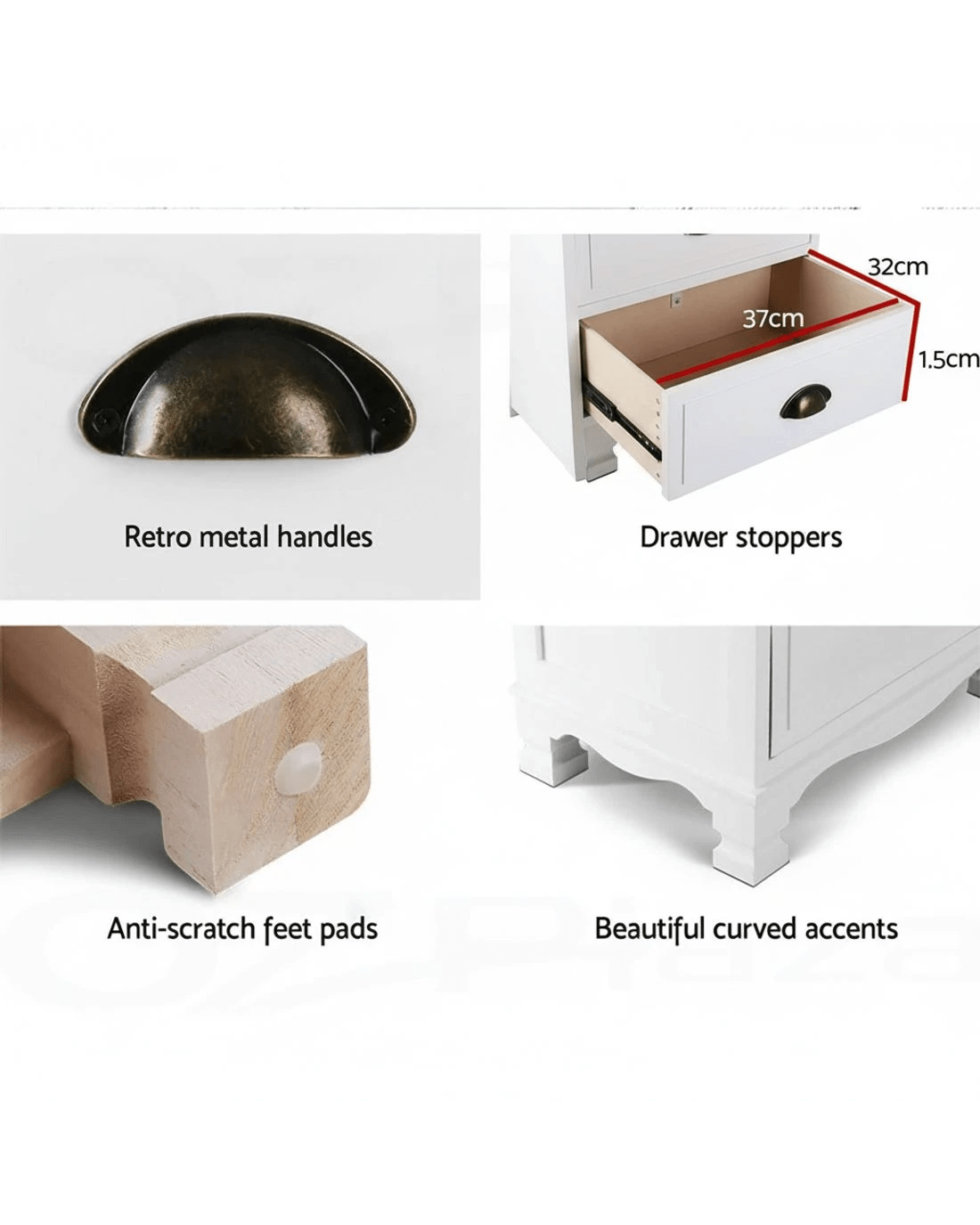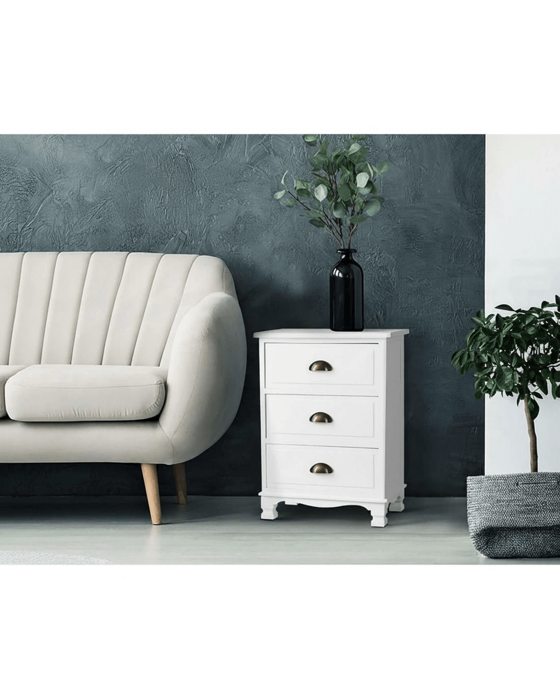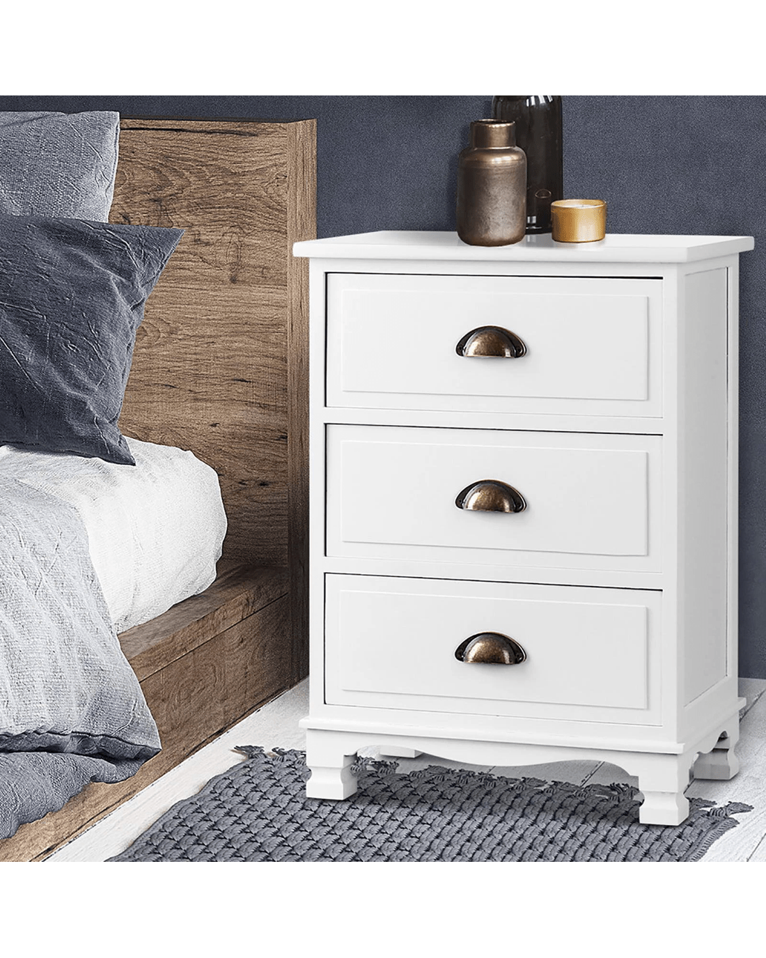 With its charming retro appeal and curved accents, our Artiss 3-drawer Storage Cabinet exudes timeless elegance all over. The three deep drawers with vintage metal handles provide ample space for practical storage and are anti-slip.. Crafted from solid Paulownia wood, the cabinet is stable and durable and features round corners for safe use and anti-scratch feet pads to keep floors and surfaces pristine even with robust use. Best of all, the cabinet comes fully assembled and a wall mount is included as an extra safety measure.