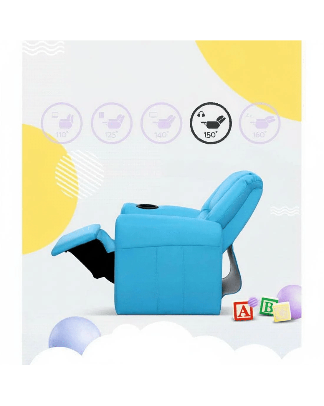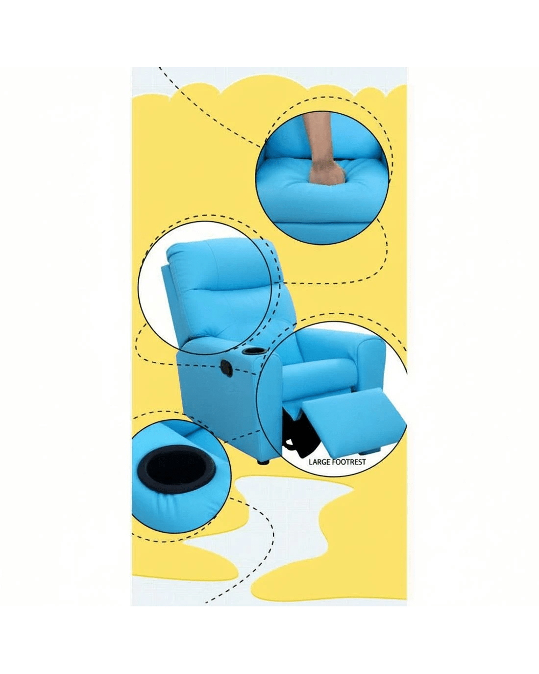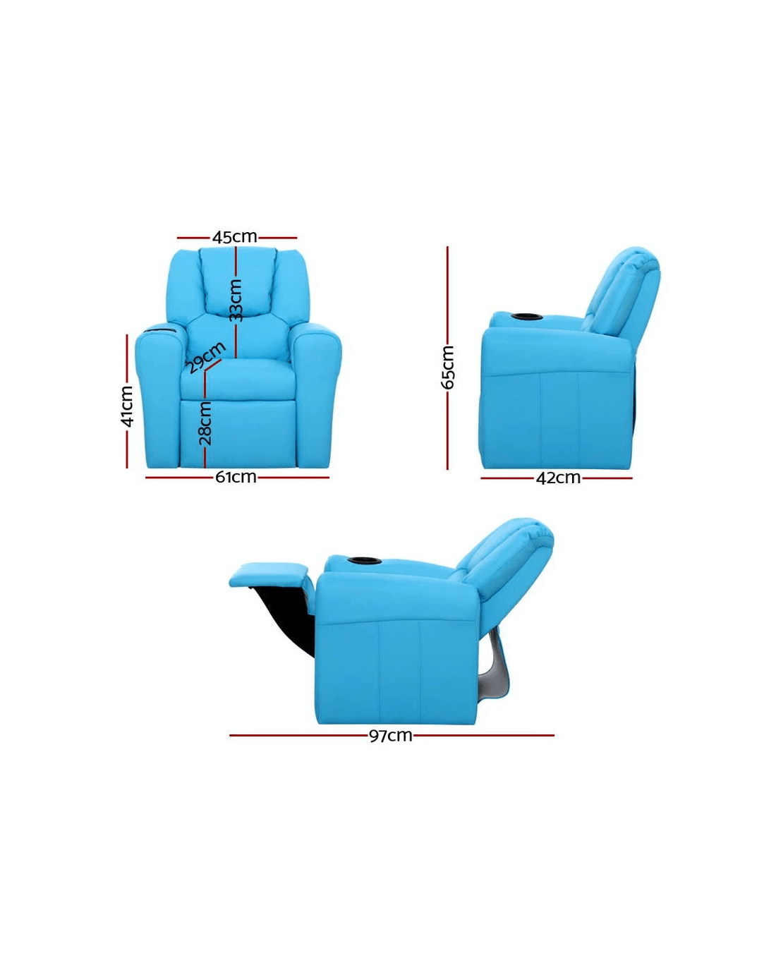 Made of PU leather and upholstered with 9cm of plush cushioning, this Kids Recliner offers total luxury for your child to sit back and relax, read, listen to music, watch TV or play games on mobile devices comfortably. The wide armrests provides for great arm support while the sturdy construction makes it very child-safe and durable. And with the built-in cup holder, the Recliner is ever ready to have your child's favourite drink at close hand.
