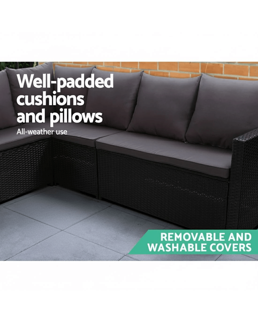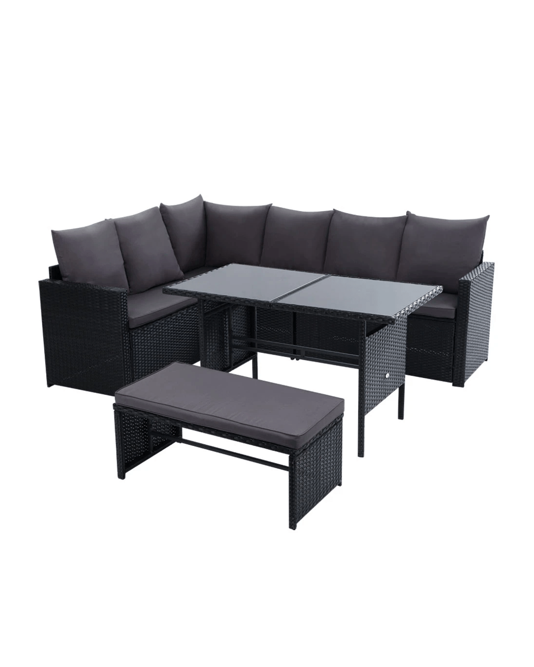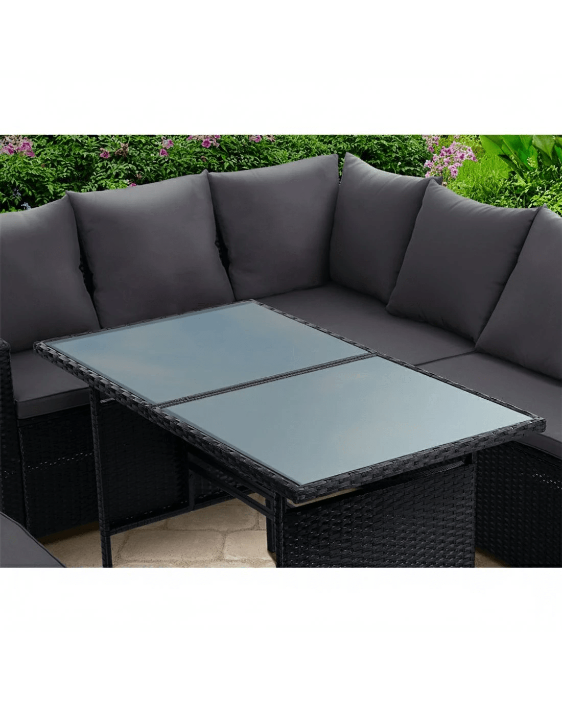 Invite your friends and family over for a garden party or just sit back and relax with our Gardeon Outdoor Sofa Dining Set. Being a 8-seater, the dining set provides enough room for all your guests to sit or for you to have a lie down and enjoy a book. You can arrange the seats in various ways depending on your needs and there are hooks included to secure the seats firmly together. The sofa is made of sturdy powder-coated steel frame with quality PE wicker finish that not only looks stylish but is perfect for outdoor use as it is both UV-resistant and weather-resistant. The cushions and pillows on the sofa provide ultimate comfort and are water-resistant as well. The set also includes a matching table that has a 5mm tempered glass top with buffers for added protection. Choose from four stylish models to suit your requirements in our store.