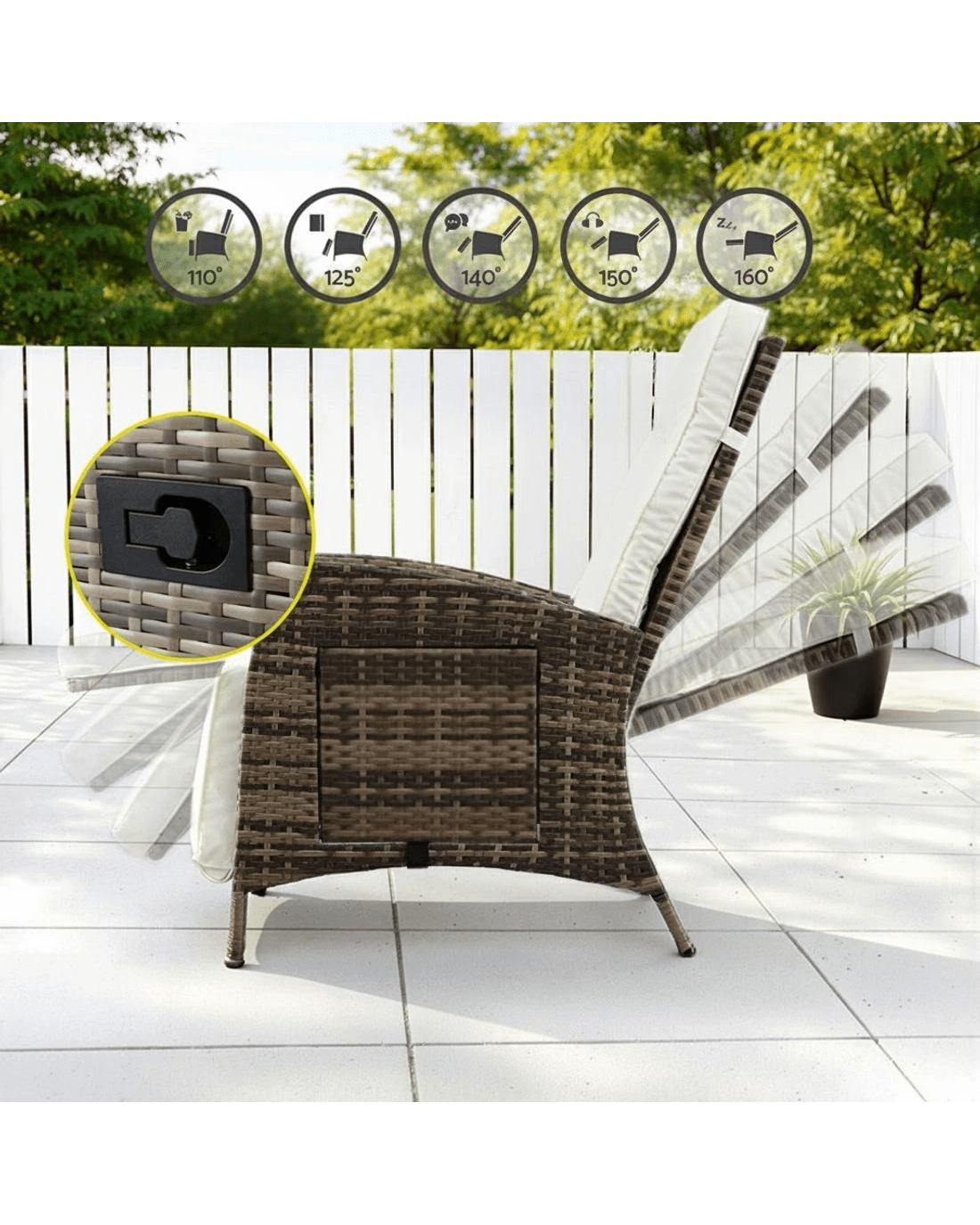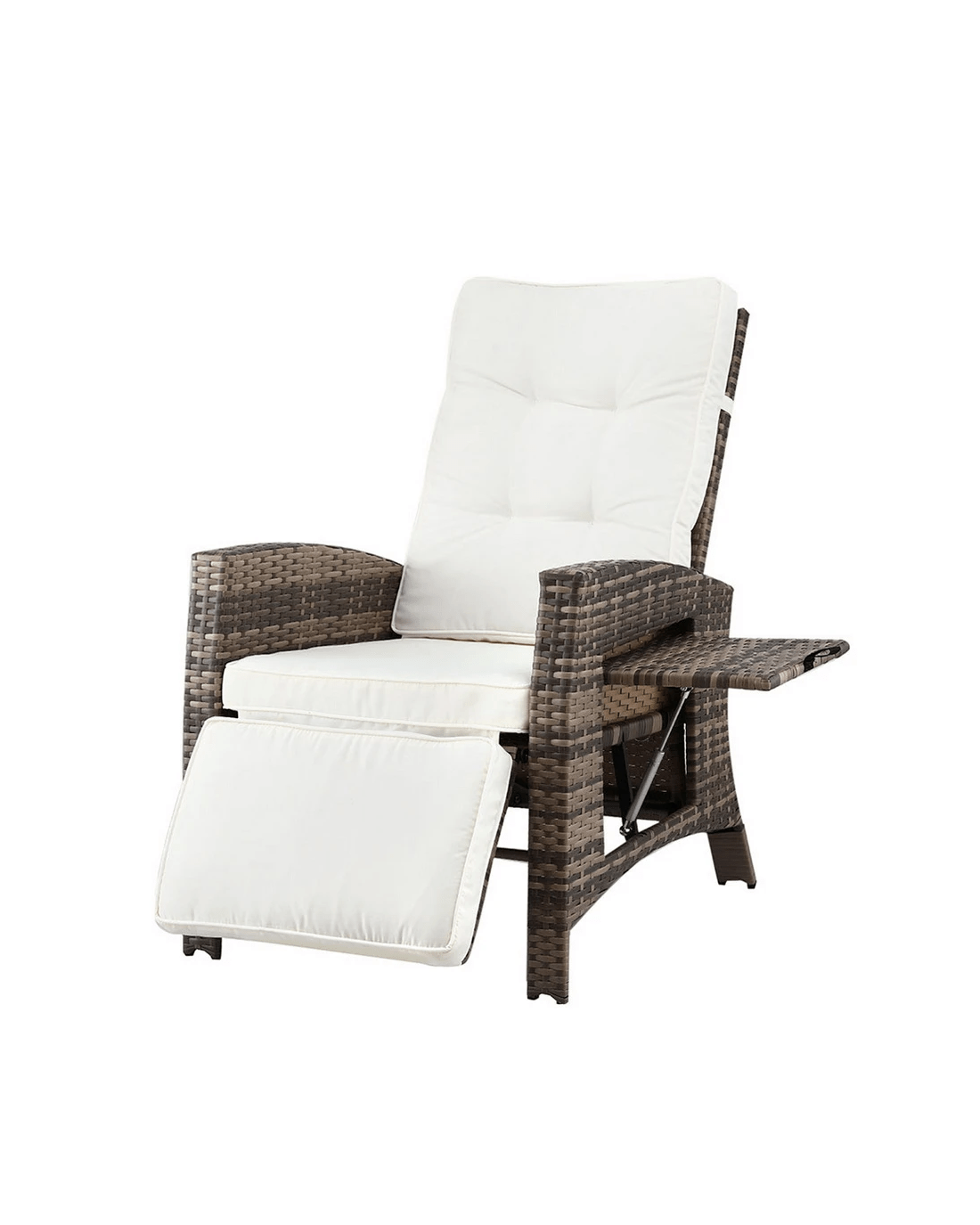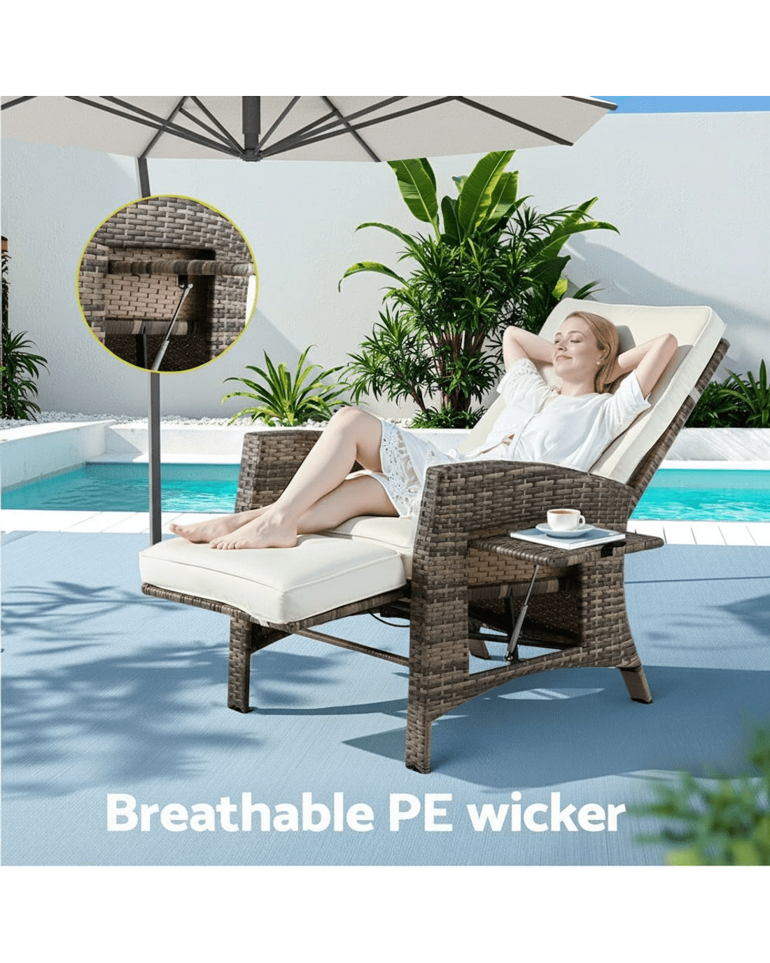 Relax in style with the Gardeon Wicker Recliner, ideal for both outdoor lounging and indoor comfort. Featuring UV-resistant PE wicker and a sturdy powder-coated steel frame, it resists weather, rust and everyday wear. The adjustable backrest and footrest provide personalized comfort, while the high-density foam cushion with removable, washable cover offers plush support. The convenient slip-up side table keeps drinks and essentials within reach. Perfect for patios, gardens or living rooms, this elegant recliner combines durability, functionality and timeless wicker design for complete relaxation.