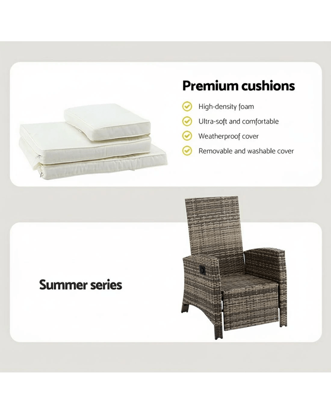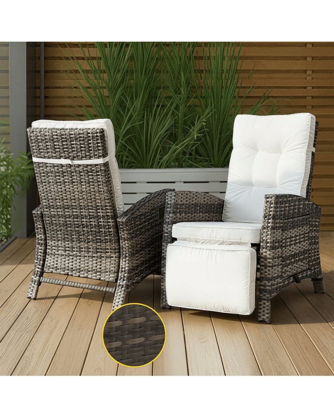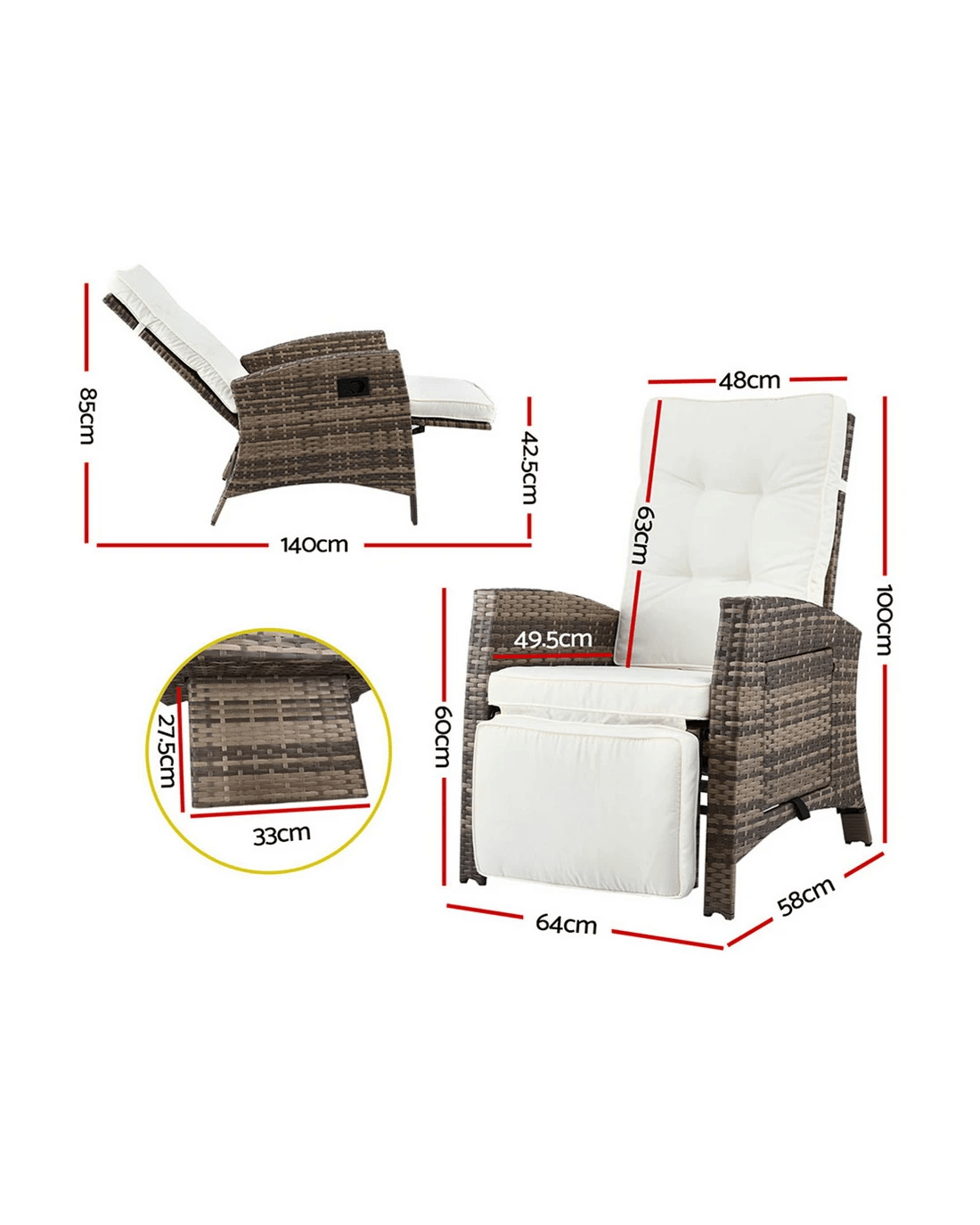 Relax in style with the Gardeon Wicker Recliner, ideal for both outdoor lounging and indoor comfort. Featuring UV-resistant PE wicker and a sturdy powder-coated steel frame, it resists weather, rust and everyday wear. The adjustable backrest and footrest provide personalized comfort, while the high-density foam cushion with removable, washable cover offers plush support. The convenient slip-up side table keeps drinks and essentials within reach. Perfect for patios, gardens or living rooms, this elegant recliner combines durability, functionality and timeless wicker design for complete relaxation.