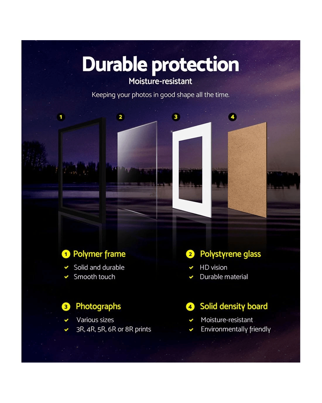 Every picture tells a story. And we are sure your extensive photo collection has lots to tell. So why not frame up the interesting ones on the wall and share the stories behind them to friends and family. You can do that beautifully with our charming Photo Frame Set. Available in a set of 3, our set allows your walls to be graced with fascinating stories and memorable moments from your treasured photographs. Arrange them in any way you like. Portrait or landscape, the framed photo feature wall is a conversational piece in its own right. Suitable for A3 photograph size, the frames feature a durable polymer construction with a polystyrene glass to keep your prints in good shape. The hardboard backing is also moisture-resistant. Hanging accessories are also included with your purchase.