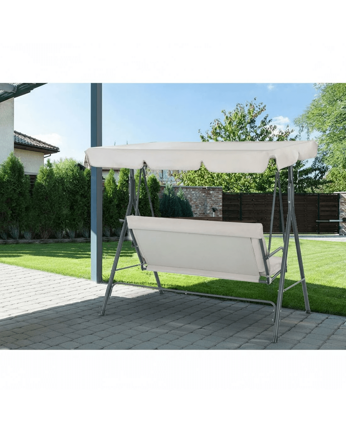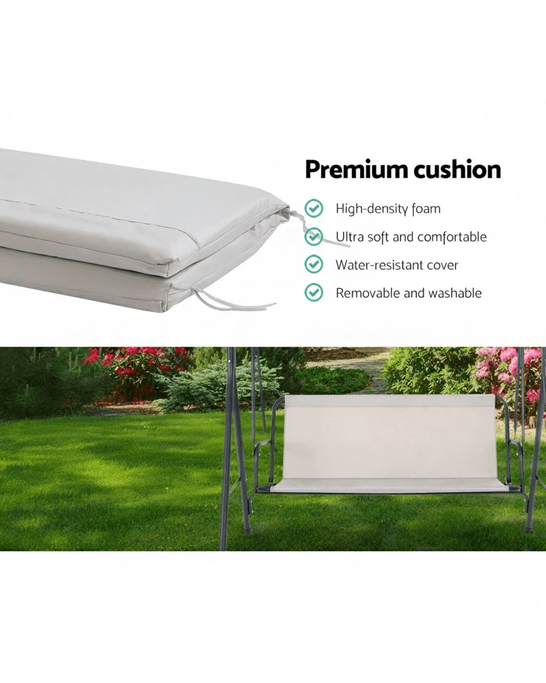 Made with a water-resistant and UV protected canopy, a sturdy power-coated steel frame and generously padded cushions, the swing chair offers the ultimate comfort in any weather. Set the shade in any position to provide the right cover or detach completely for relaxed sunbathing. The cushions and covers are removable for easy cleaning. Not least, the upgraded springs are designed to provide smooth motion coupled with reliable suspension.