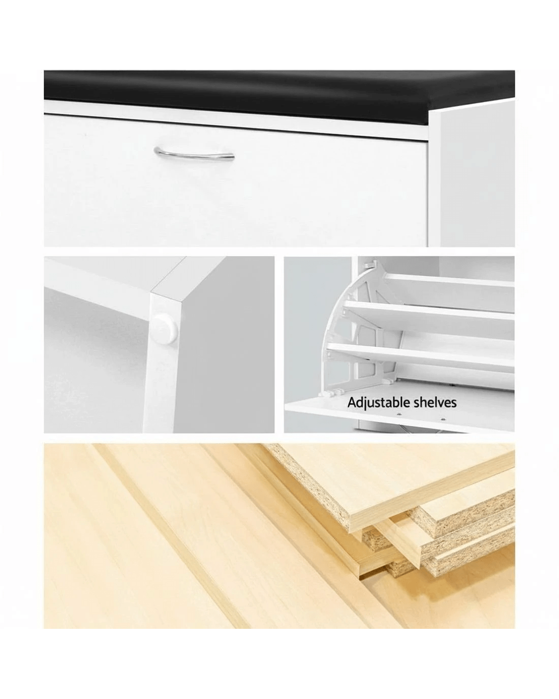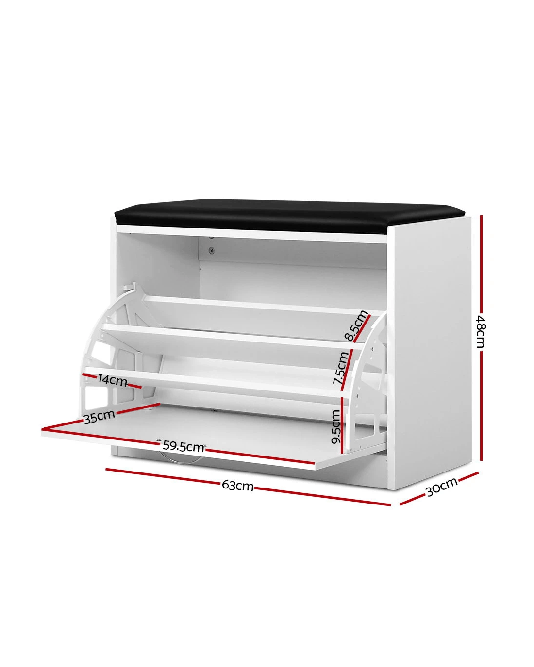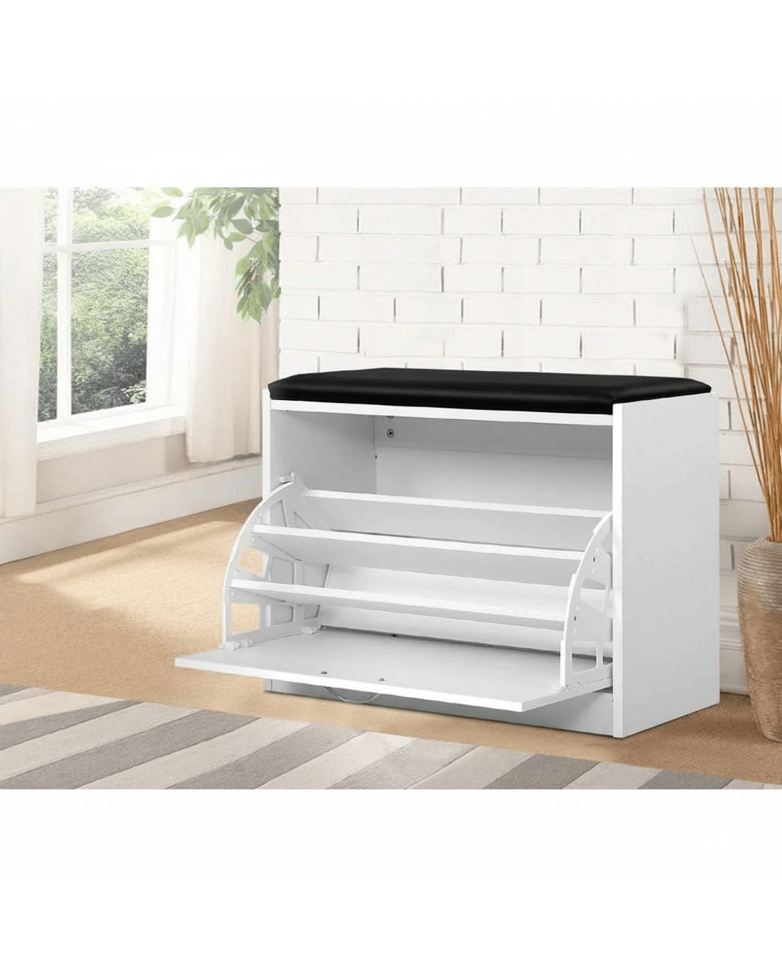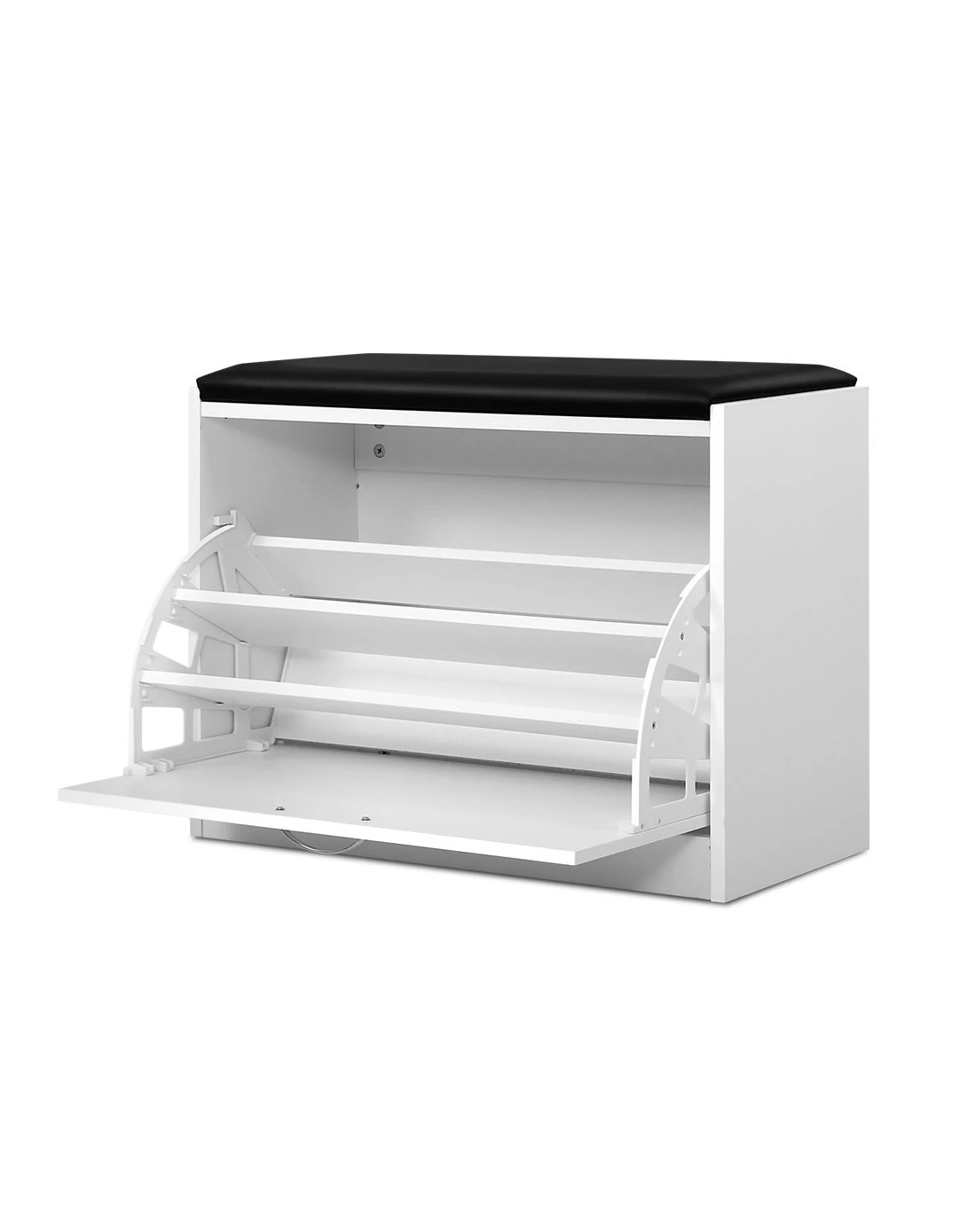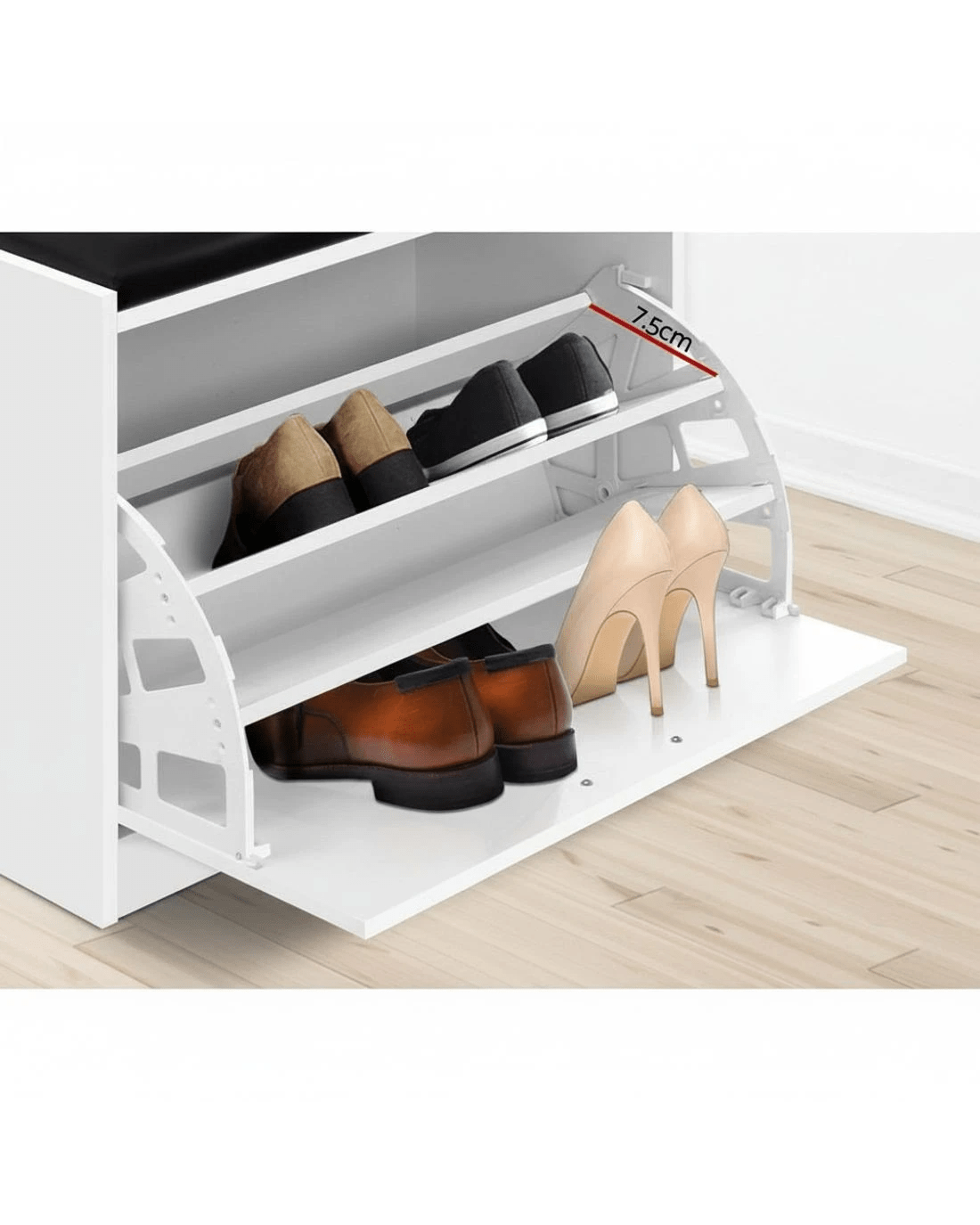 Get yourself a shoe cabinet with an aesthetic difference. Our Artiss Shoe Storage Bench adds a touch of luxury and multi-functionality to the ubiquitous shoe cabinet. On first impression, it looks just like a plush PU leather stool. Pull down the front panel and you find three tiers of adjustable shoe shelves with ample space for up to 15 pairs of various footwear (depending on shoe sizes). Made from quality particle board, the bench is sturdy and finished in melamine for durability and easy maintenance. Not least, its thoughtful design means that you can place it in your hallway or entrance for a neat and tidy look that blends seamlessly with your home décor. So remove the clutter and get organised with our shoe storage bench. We are sure it will feet right in with your discerning taste for all things stylish and chic.