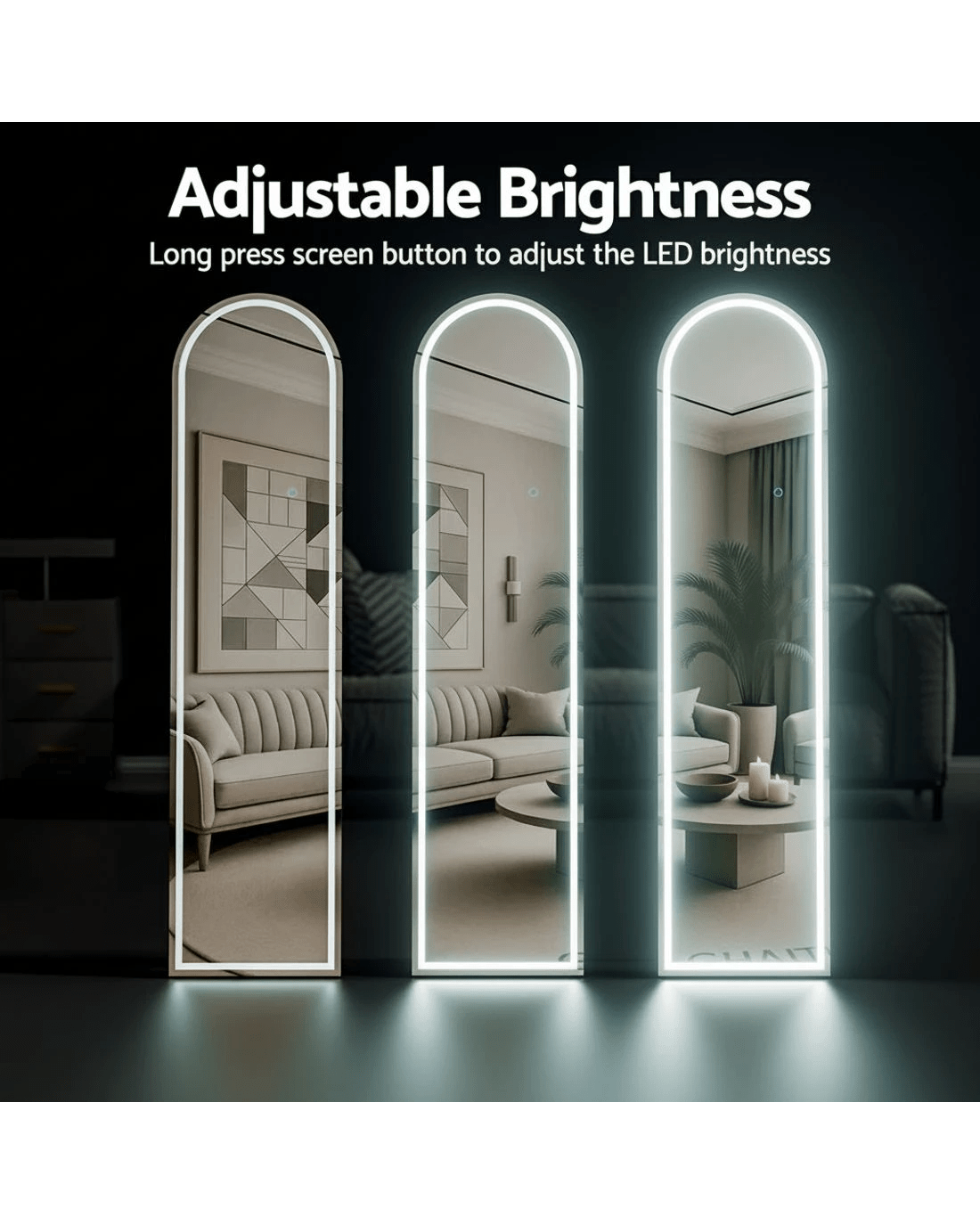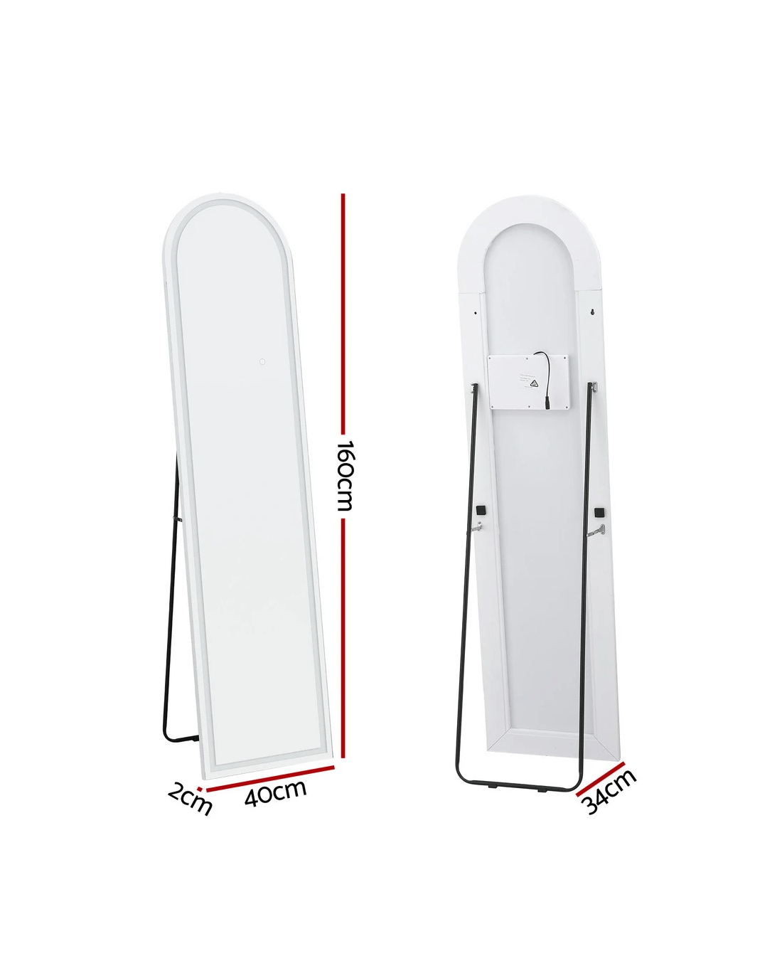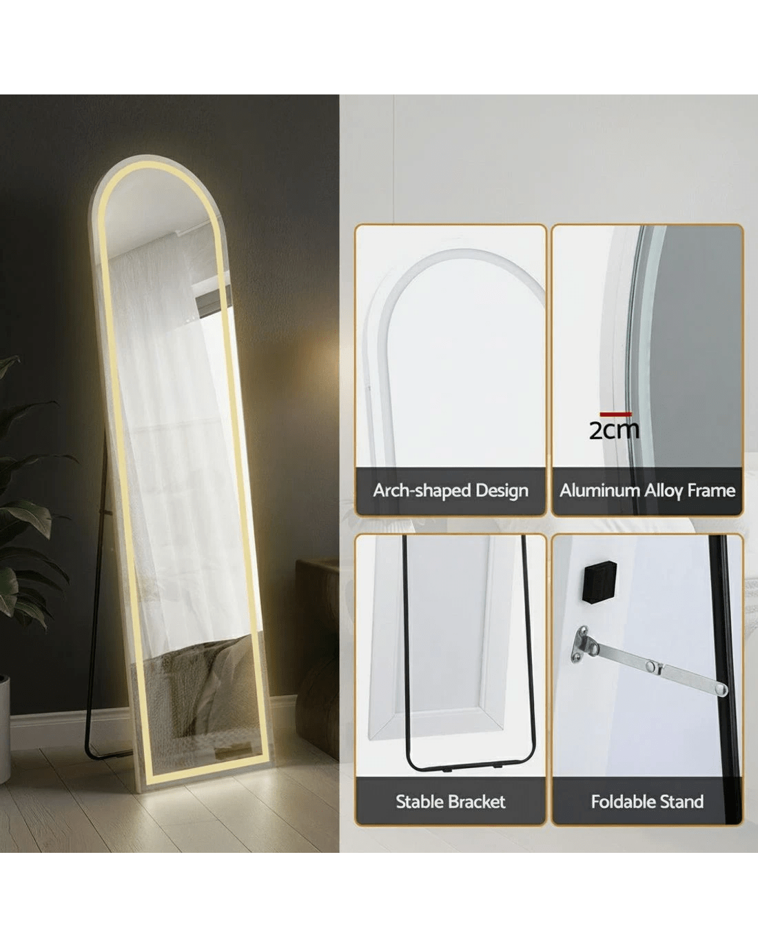 Elevate your space with the Embellir Full-Length LED Mirror. This elegant arch mirror features an adjustable LED light with three colour temperatures and stepless dimmable brightness control. Use it as a freestanding mirror, or easily mount it on the wall. Crafted with high-definition shatterproof glass, this wall mirror provides a clear, full-body view. Its modern design makes it a must-have dorm essential and a perfect piece of wall art for home decor for your bedroom or living room decor.