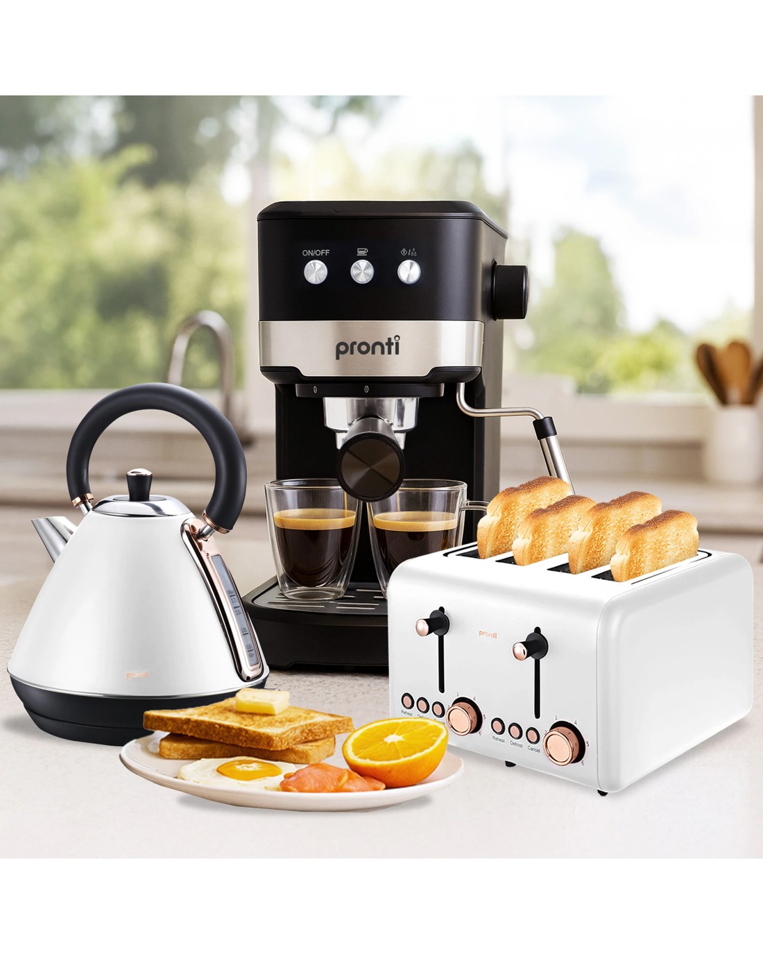 Sold by Klika GroupPronti Breakfast Set with Rose Gold Kettle and Toaster with 1.25L Espresso Machine - White
