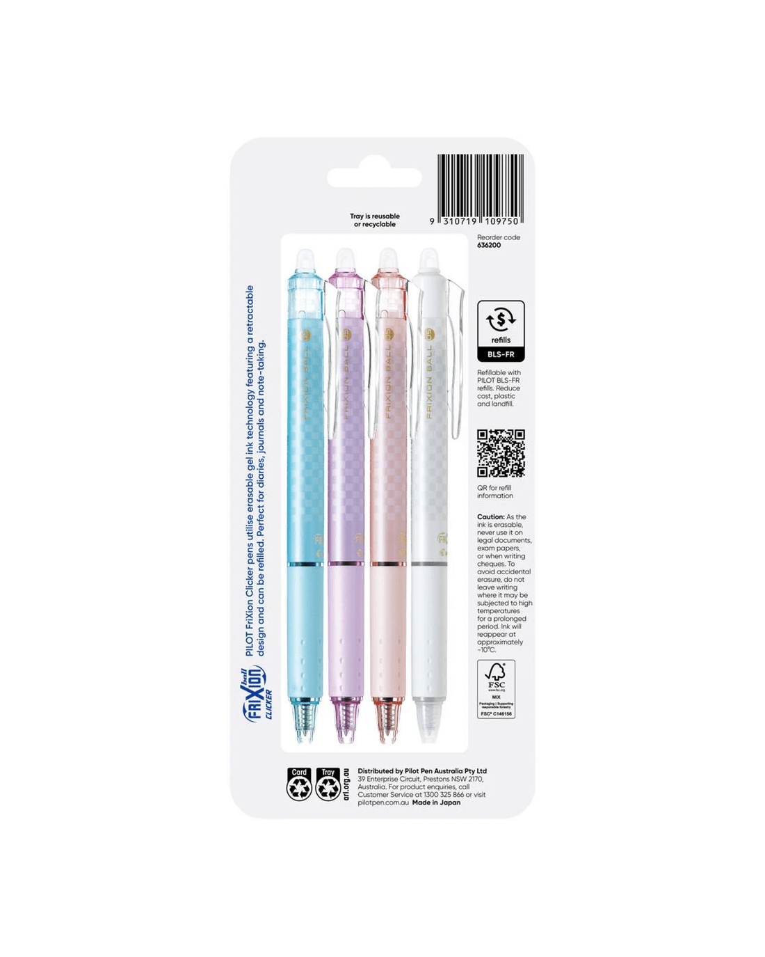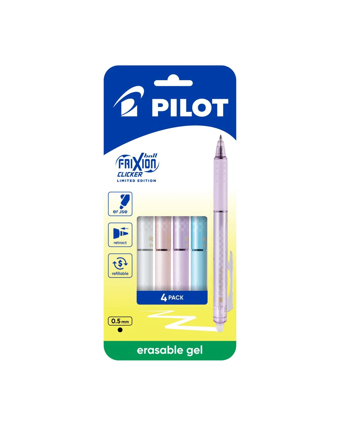 PILOT FriXion Clicker Limited Edition Erasable Gel Pen 0.5mm Assorted Barrels Black Ink 4 Pack is perfect for planners, diary and journal writers who need neat writing in tight spaces. The 0.5mm tip delivers smooth, precise lines and the thermosensitive ink erases with friction, just erase with an eraser tip and rewrite. With a retractable design, comfortable grip and stylish, pastel barrel colours, it’s as functional as it is good-looking. Each pack includes four unique barrel designs of FriXion Clicker erasable pens with Black ink. The pen is refillable with PILOT BLS-FR refills, offering a cost-effective solution.