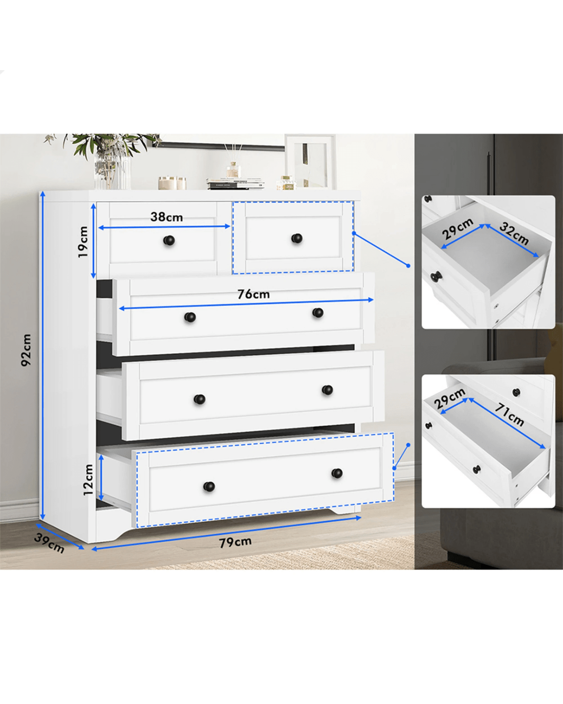 * Five spacious drawers