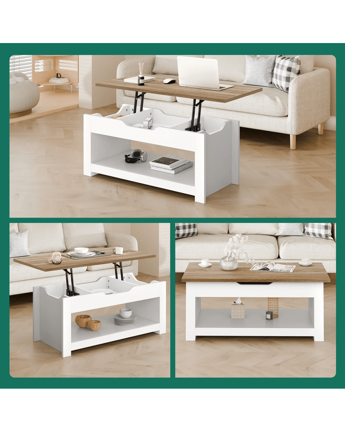 Featuring heavy-duty and smooth lifting mechanism, the tabletop can be effortlessly evelvated to a comfortable height, creating a spacious workspace or dining surface while you're sitting on the sofa.