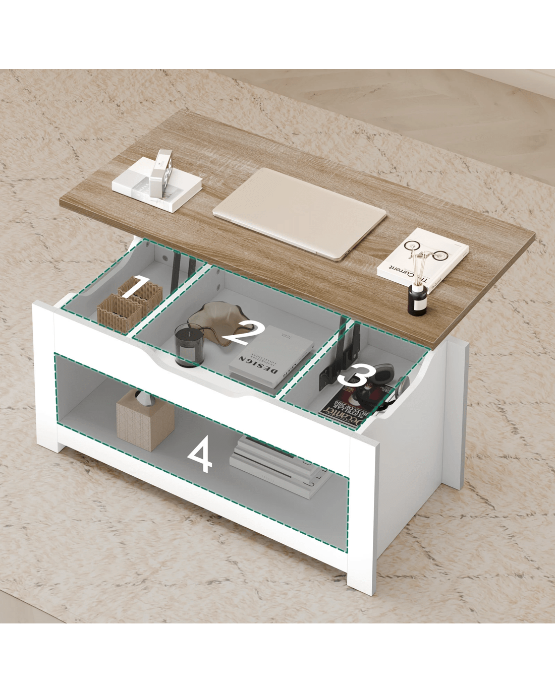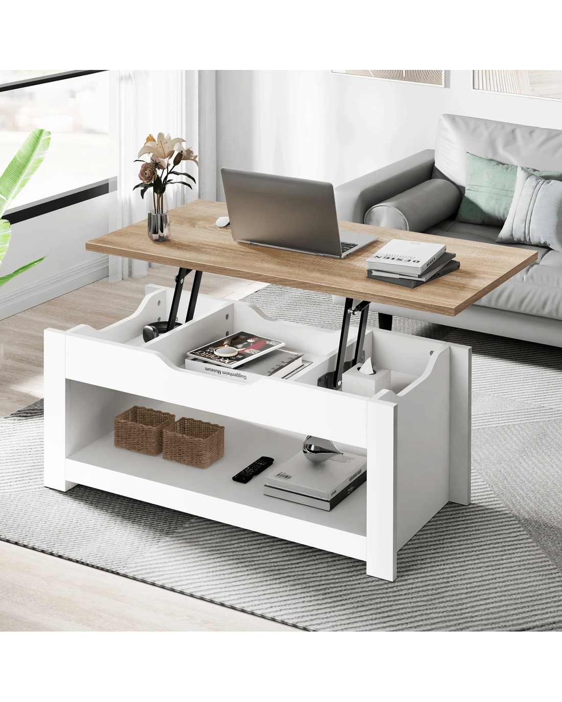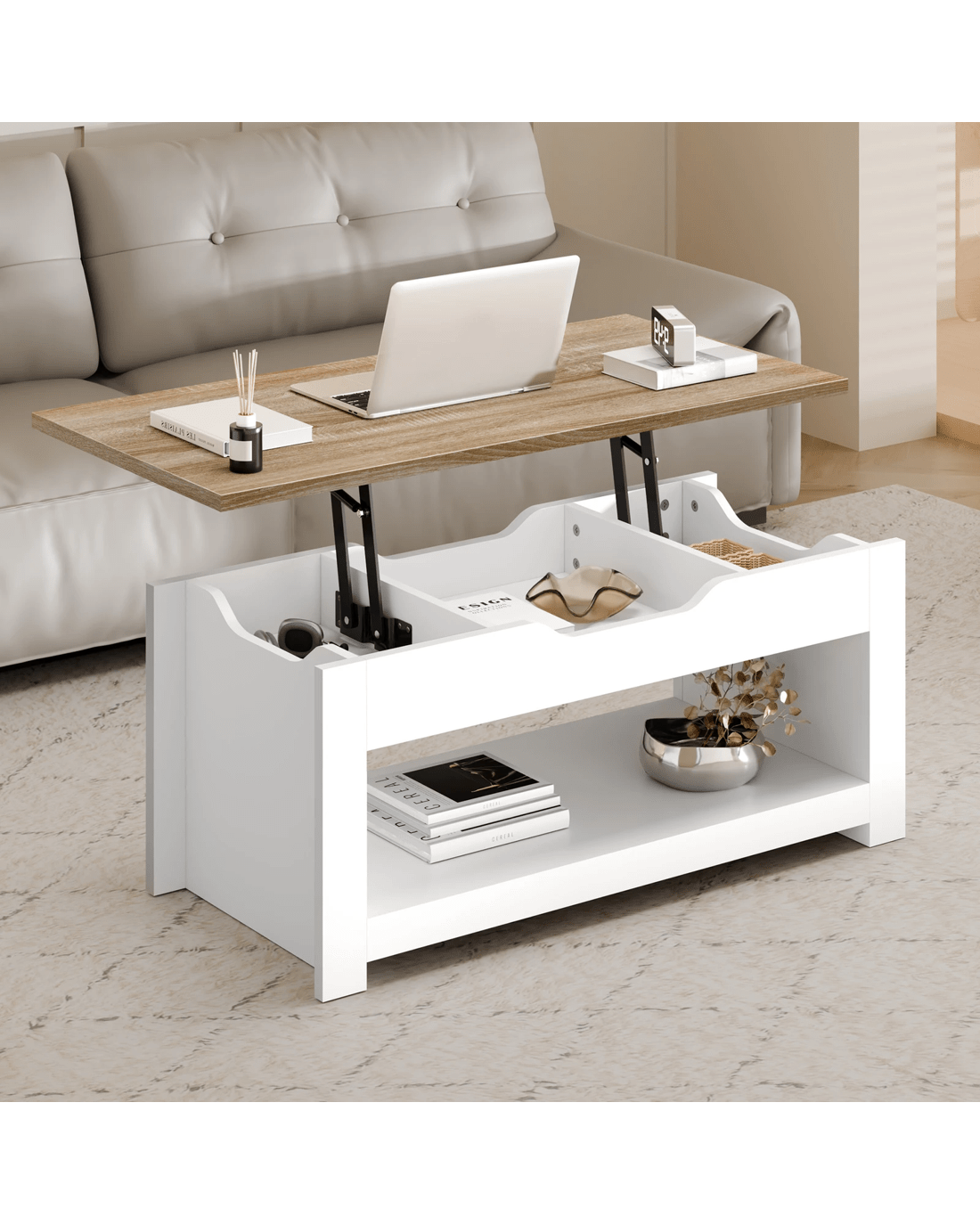 Along with enhancing the aesthetic of the space, this coffee table provides ample storage option for daily essentials. The wide tabletop is just the right place for laptop, remotes and a cup of coffee. Under the lift-top, 3 hidden compartments offer a discreet way to store items like magazines, books, or devices, while the generous open shelf underneath acts as additional storage for items easily accessible.