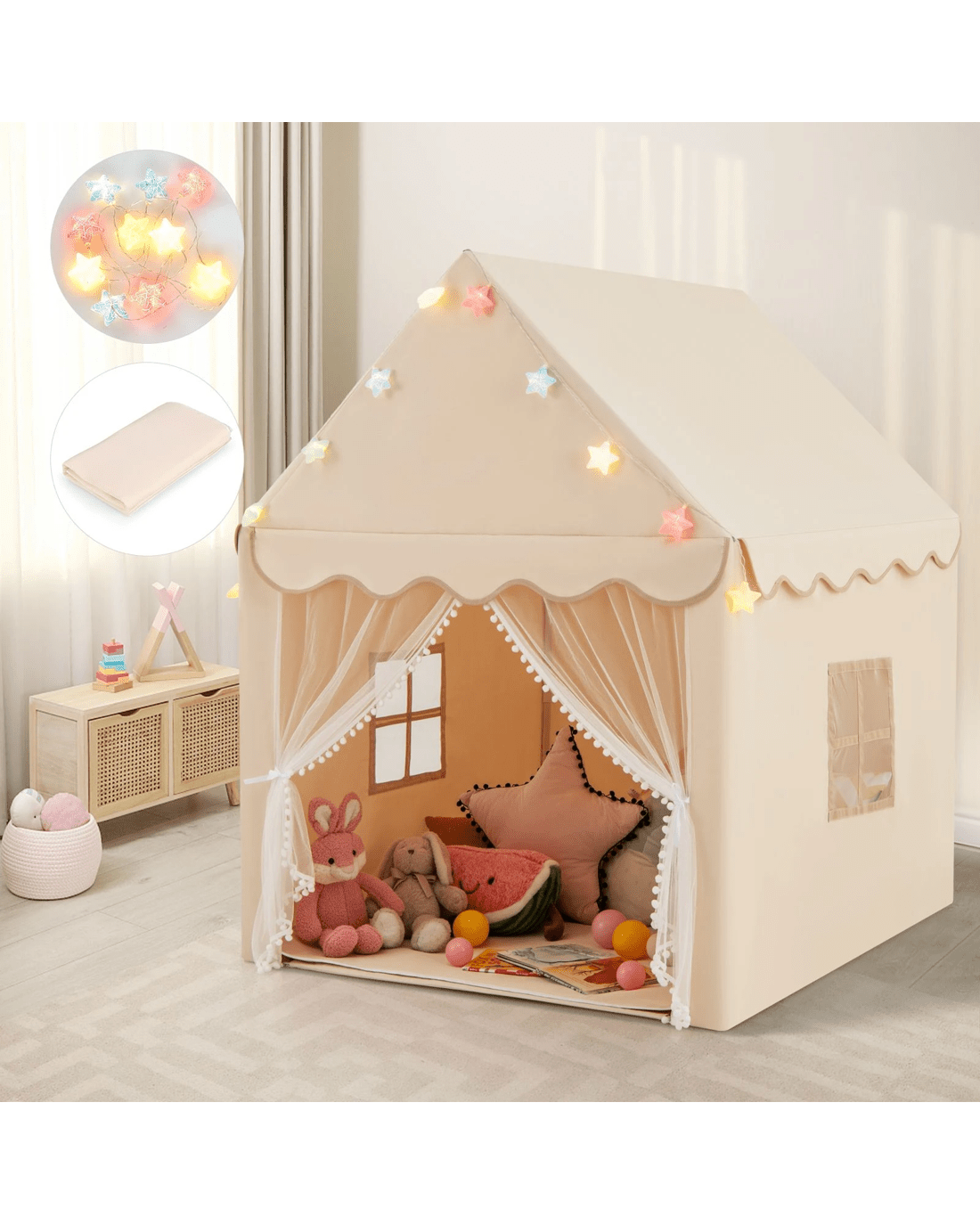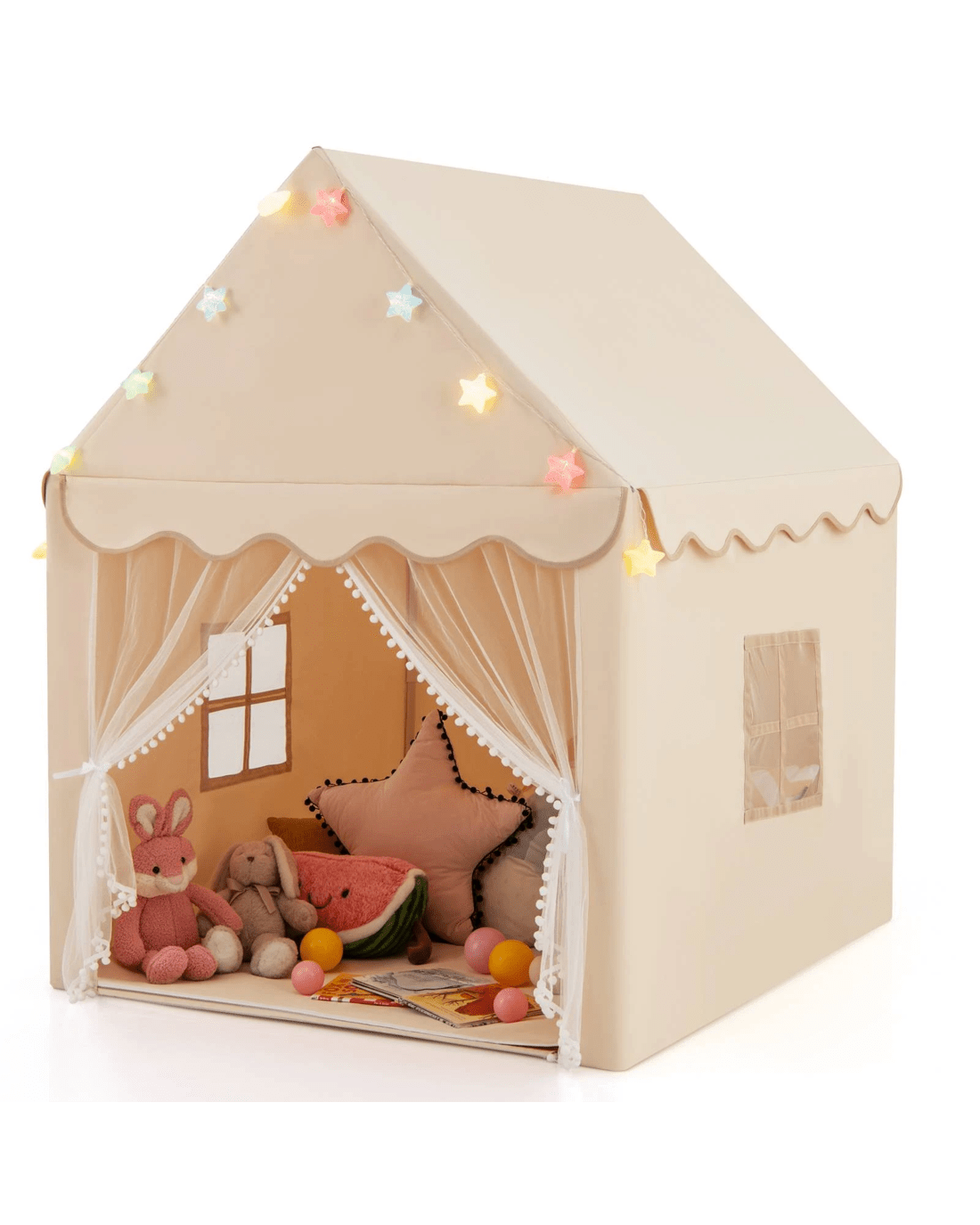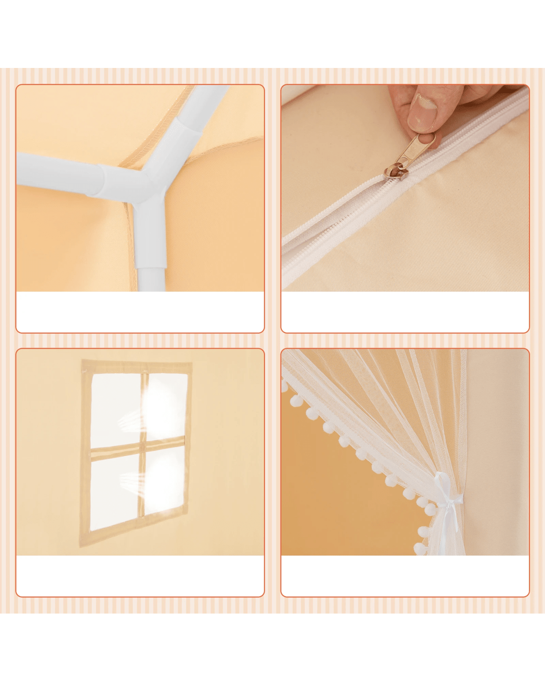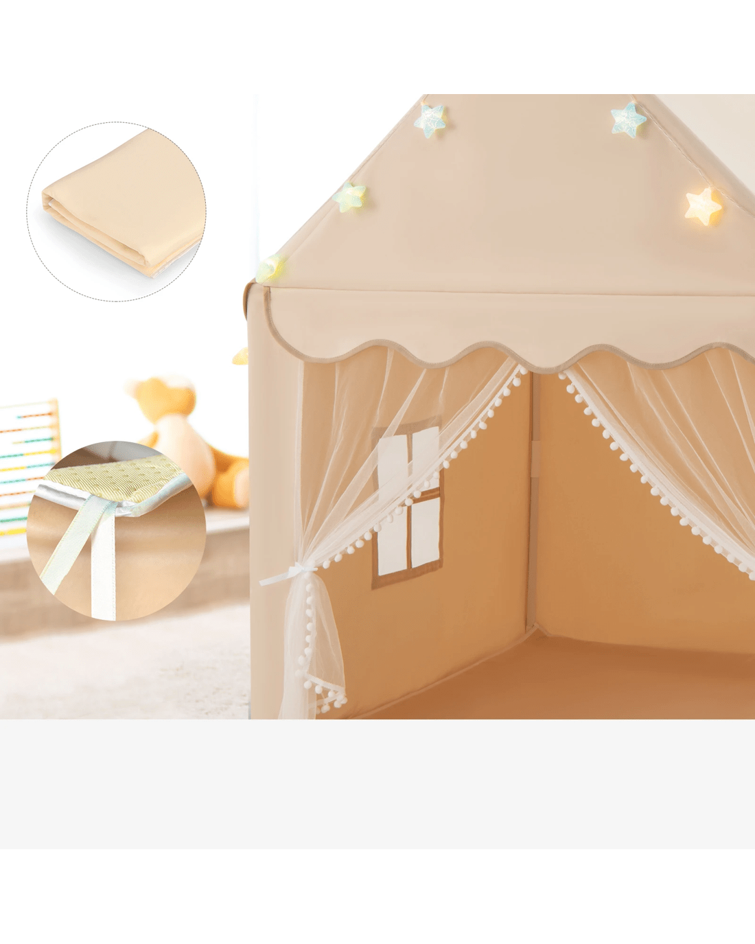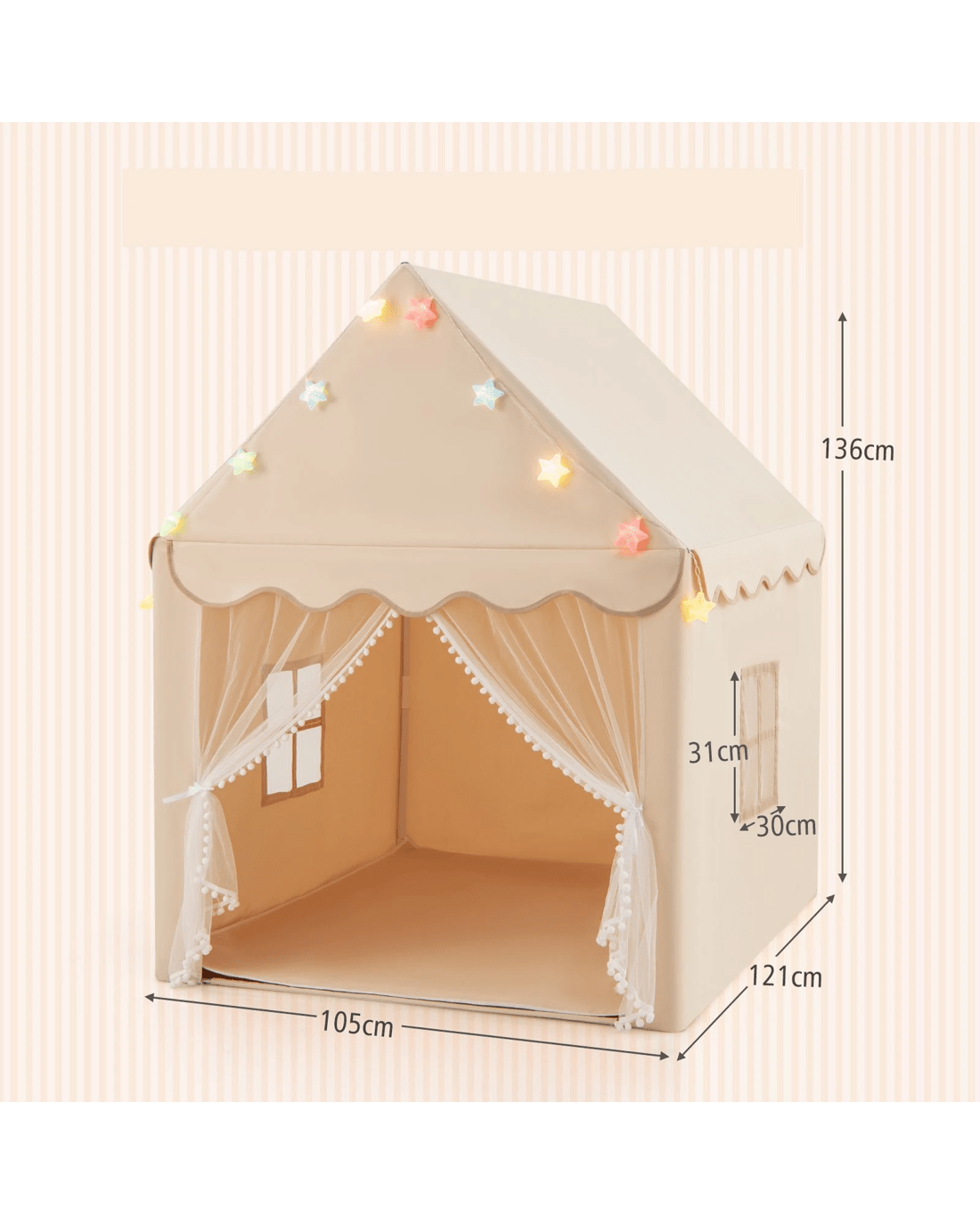 Our playhouse tent creates a large private space for little ones to entertain, read, play games, and enjoy themselves, which can greatly help cultivate your little one’s imagination and enhance creativity. And the play tent is made of soft and skin-friendly fabric. Furthermore, high-quality PVC tubes compose a sturdy frame, so little ones can play freely without worrying about falling apart. In addition, 2 mesh windows are embedded on both sides of the tent, ensuring better ventilation. And the large net curtain on the door can effectively keep mosquitoes out. Especially, our playhouse tent is designed with several beautiful star lights helping create a cozy atmosphere. The multipurpose outdoor and indoor play tent can be used in the living room, nursery, daycare, park, backyard, and more. Whether your little ones want to read books, take a nap, enjoy picnics, or parties, it would be the perfect choice for them!